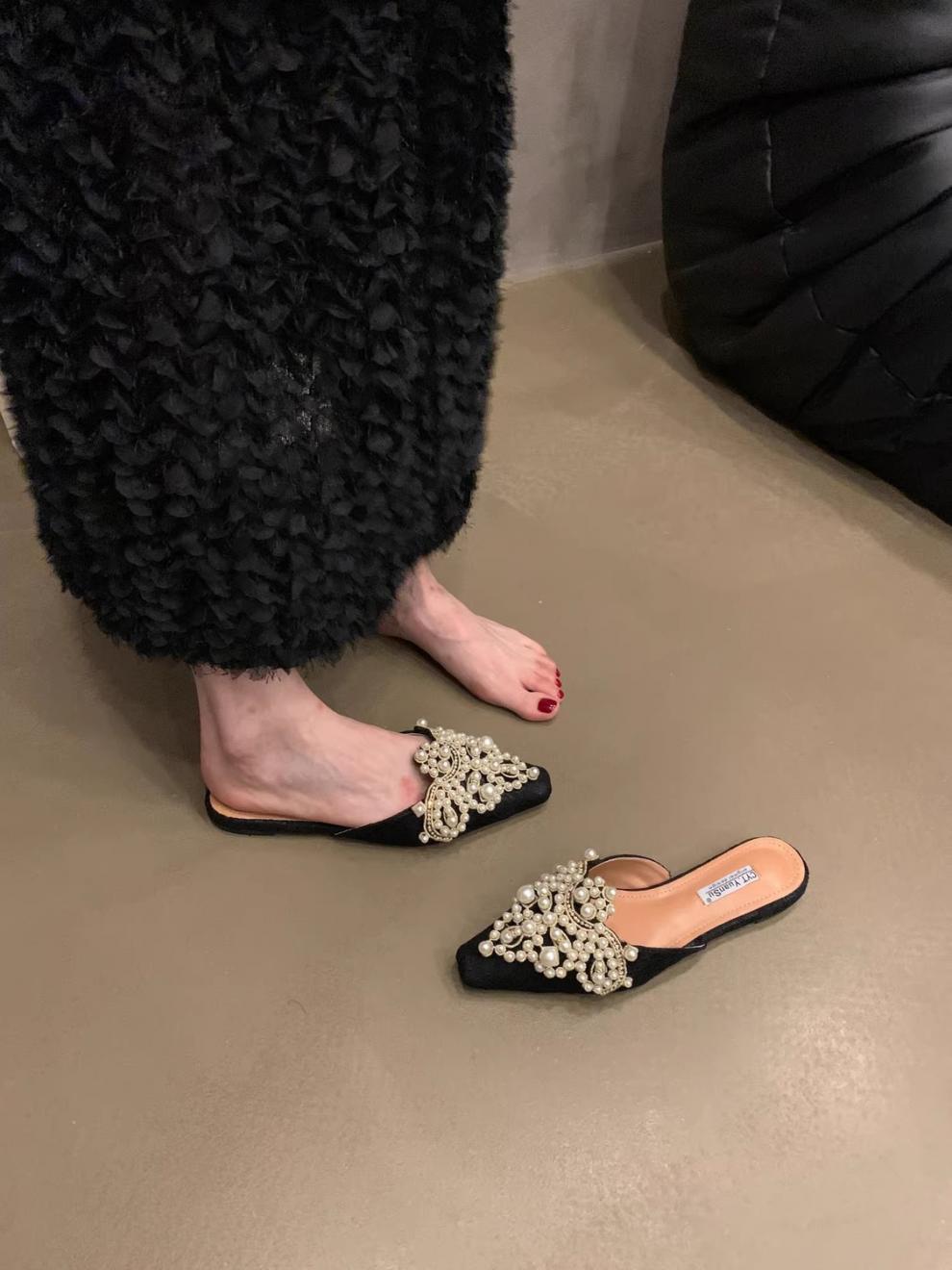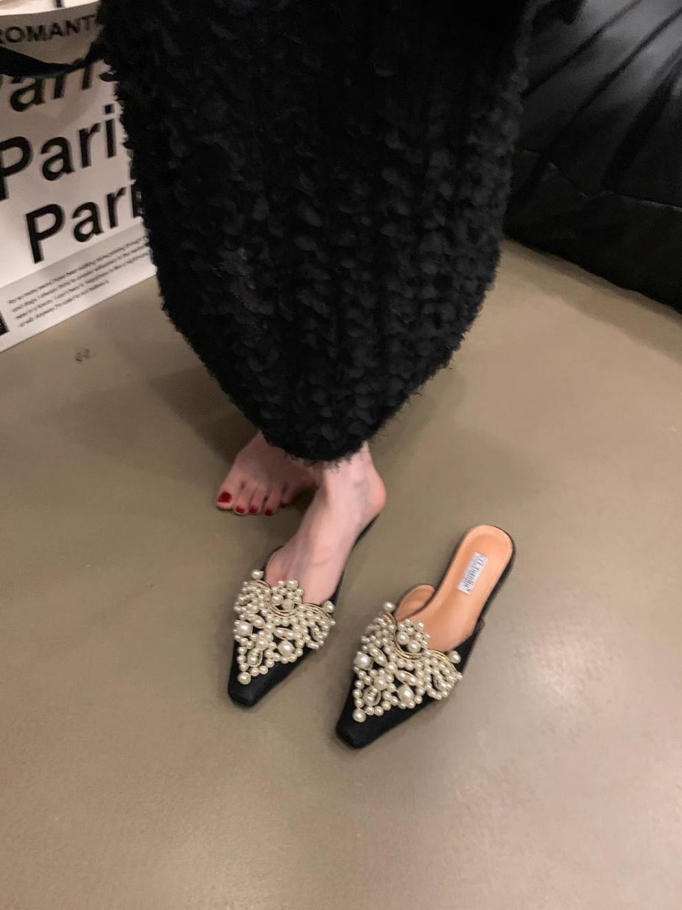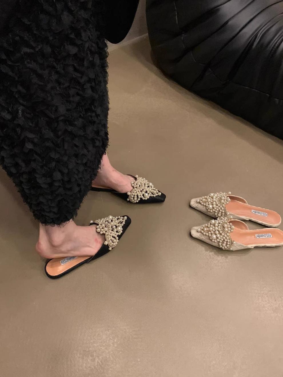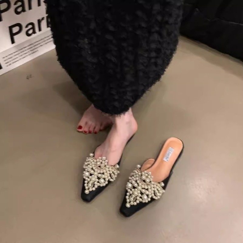 우아한 중국 스타일 바오터우 레이스 여성 신발 플랫 포인티드 토 하프 슬리퍼 여성 여름 샌들 슬리퍼 진주 라인스톤 게으른 슬리퍼