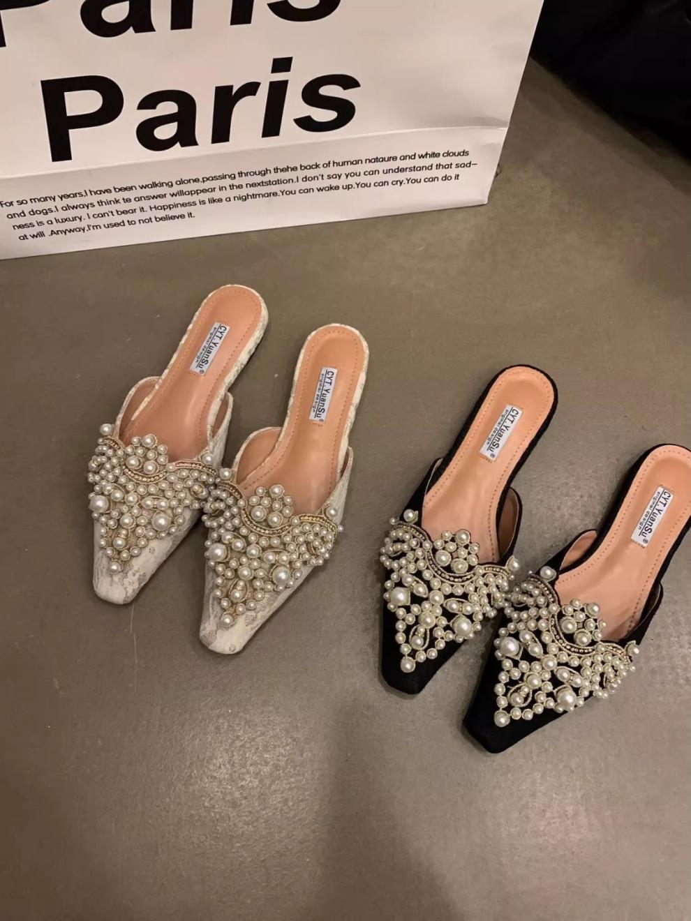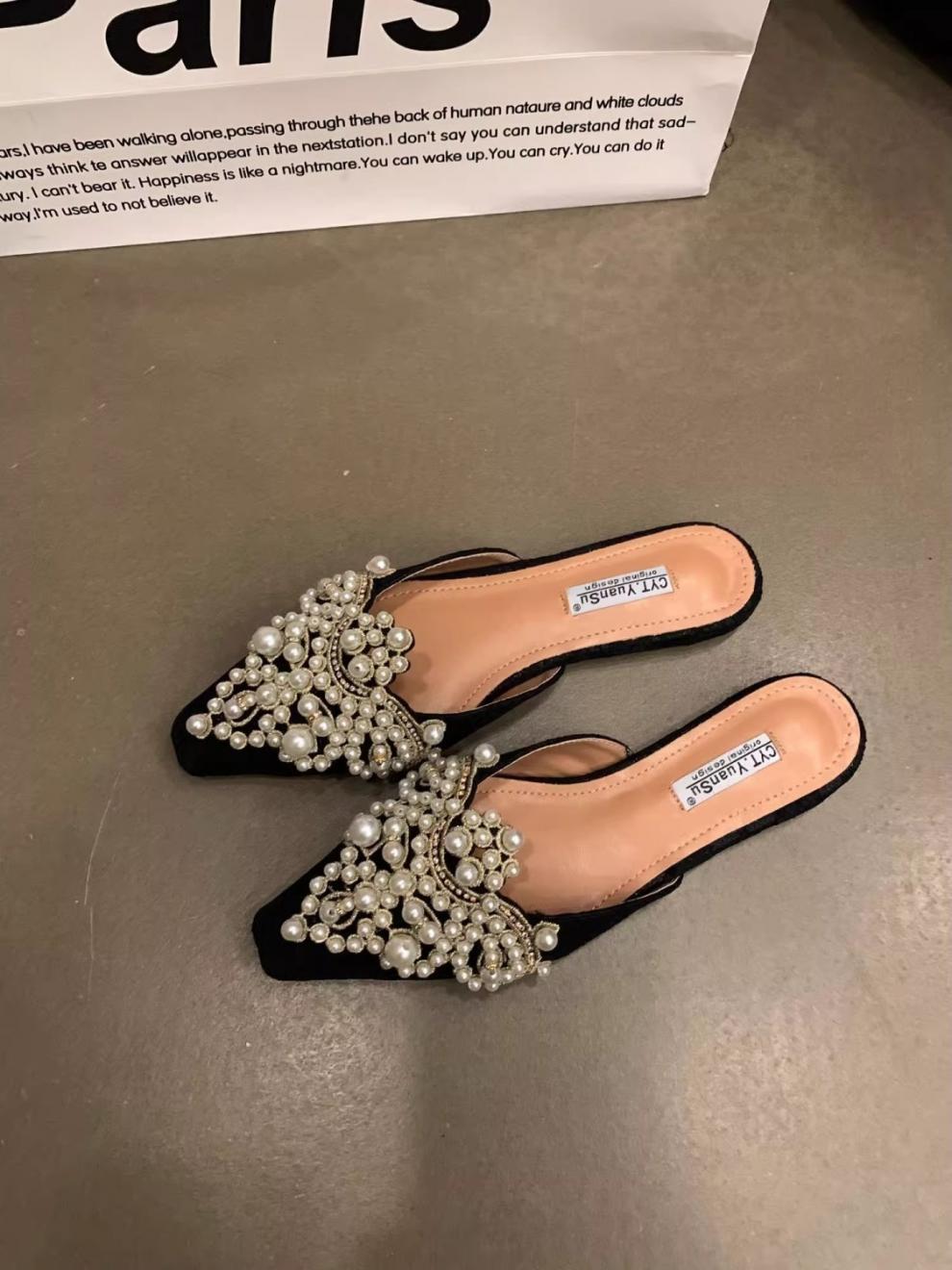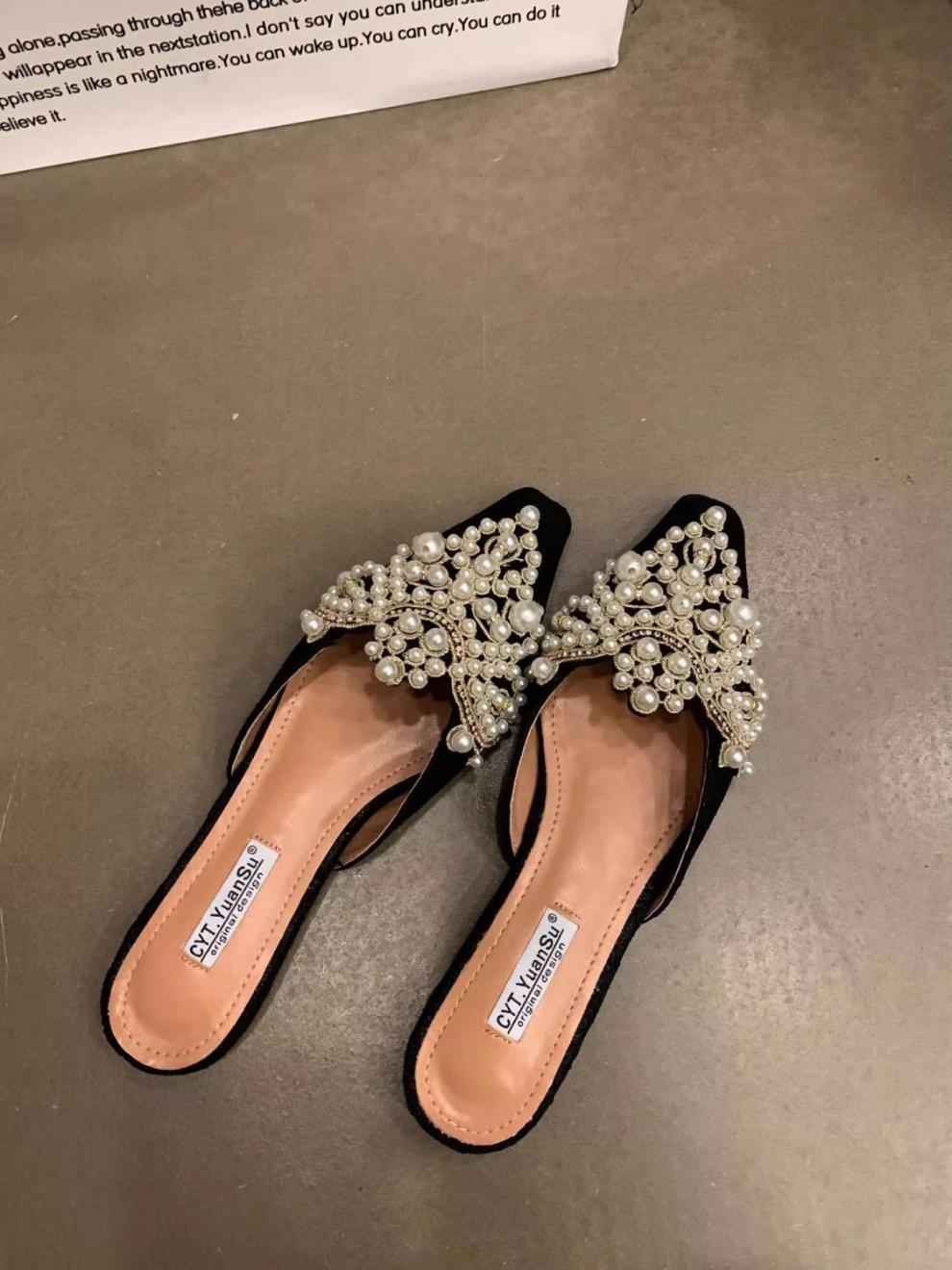 우아한 중국 스타일 바오터우 레이스 여성 신발 플랫 포인티드 토 하프 슬리퍼 여성 여름 샌들 슬리퍼 진주 라인스톤 게으른 슬리퍼