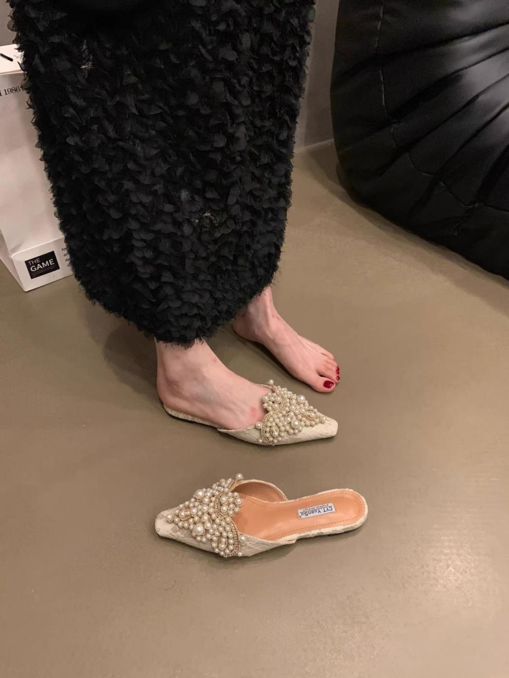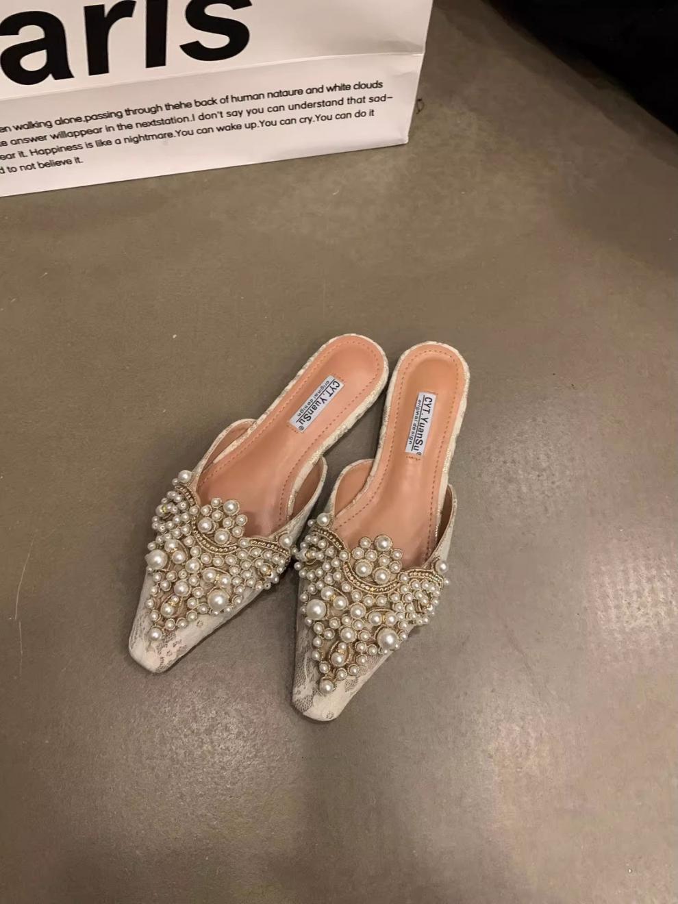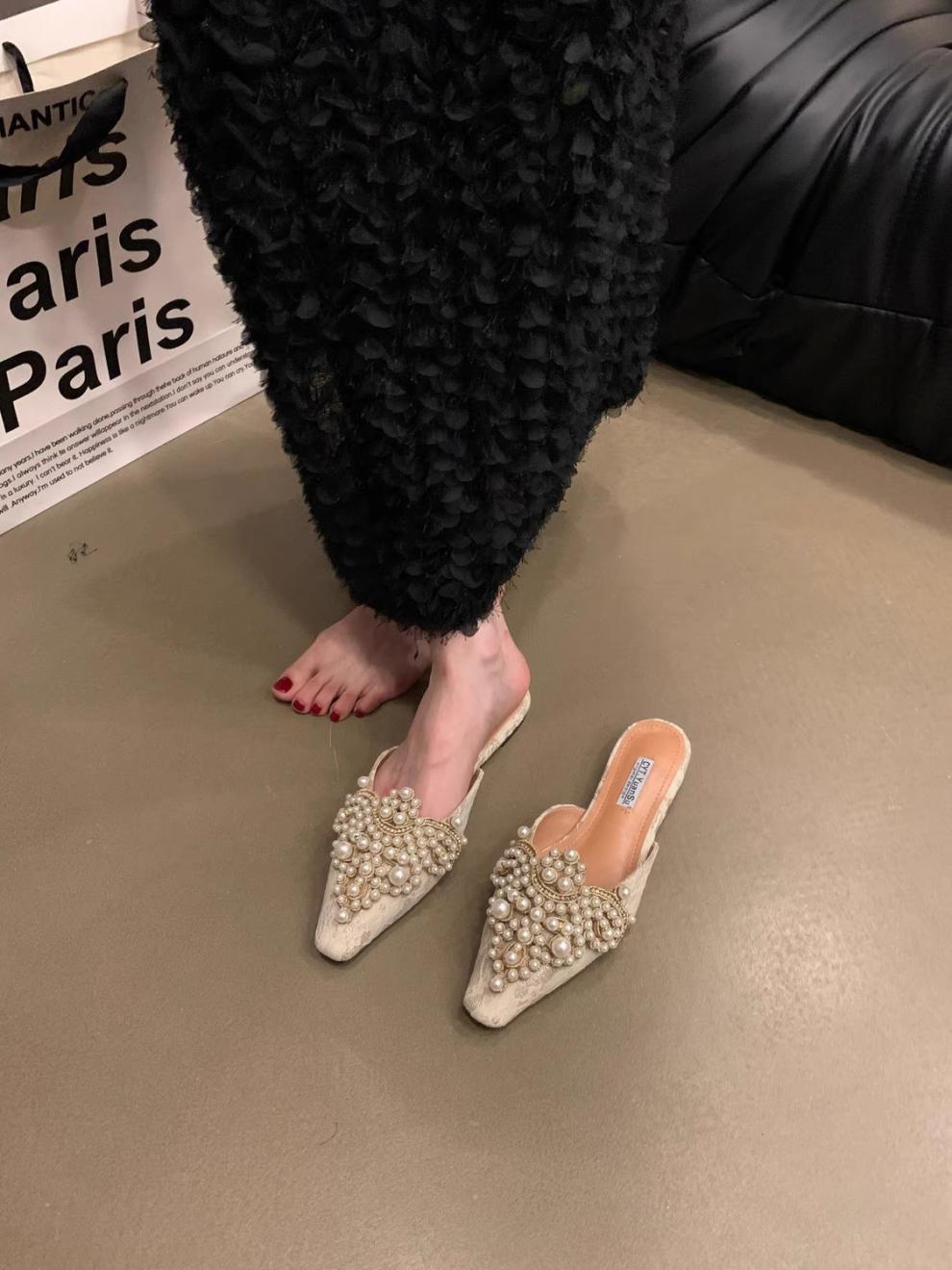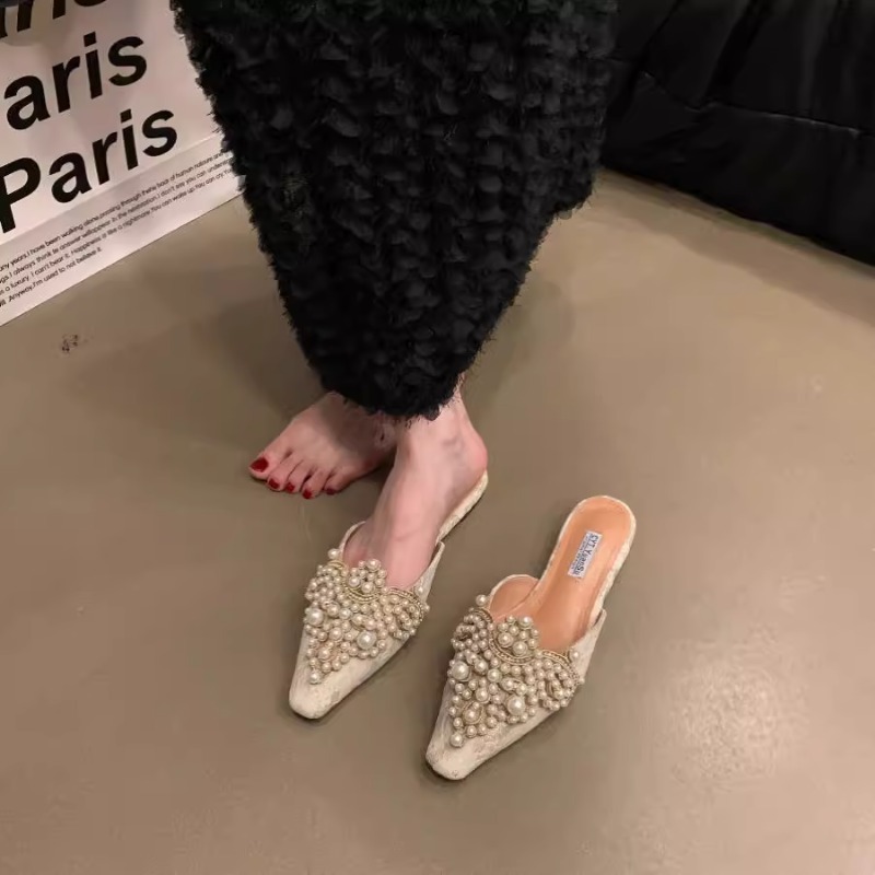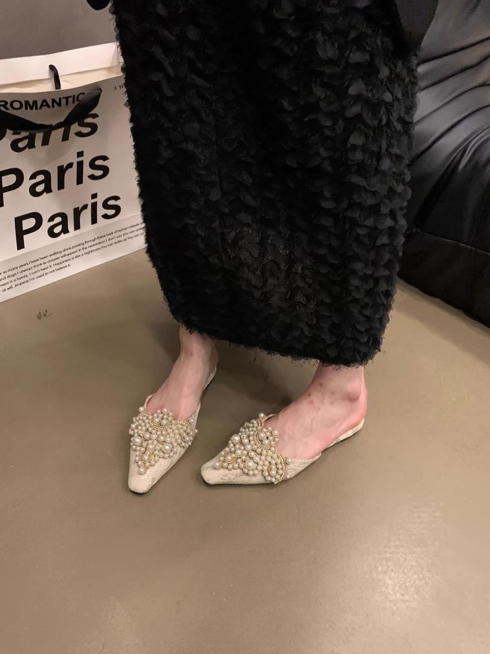 우아한 중국 스타일 바오터우 레이스 여성 신발 플랫 포인티드 토 하프 슬리퍼 여성 여름 샌들 슬리퍼 진주 라인스톤 게으른 슬리퍼스토어 가기