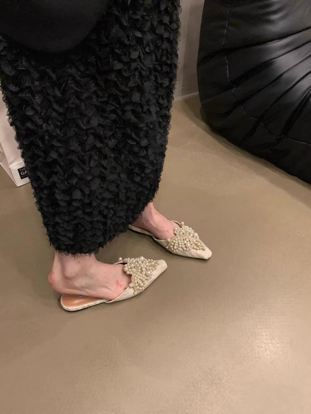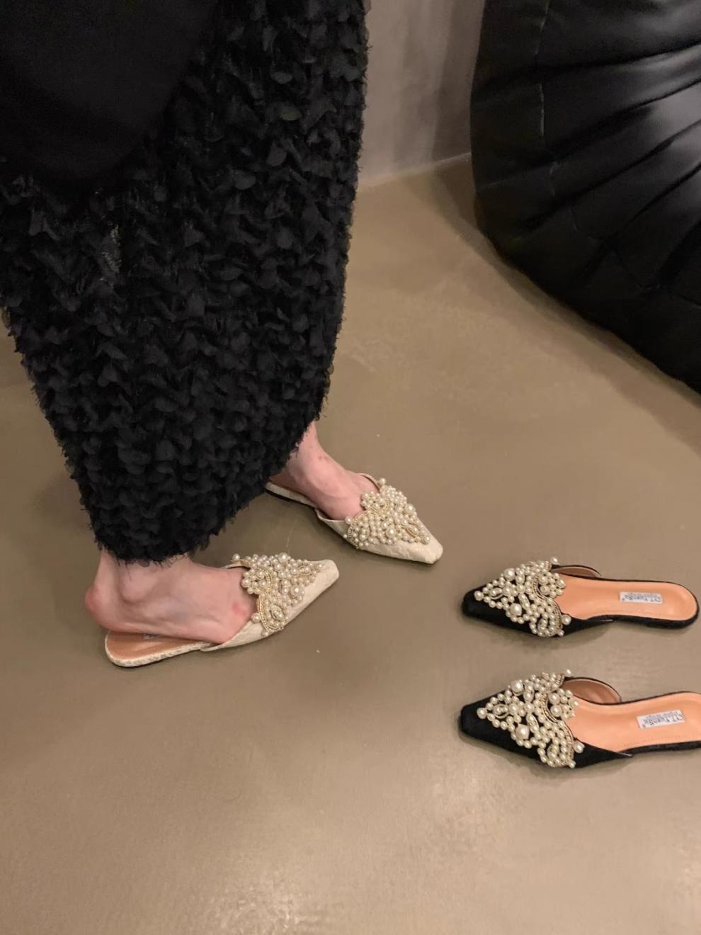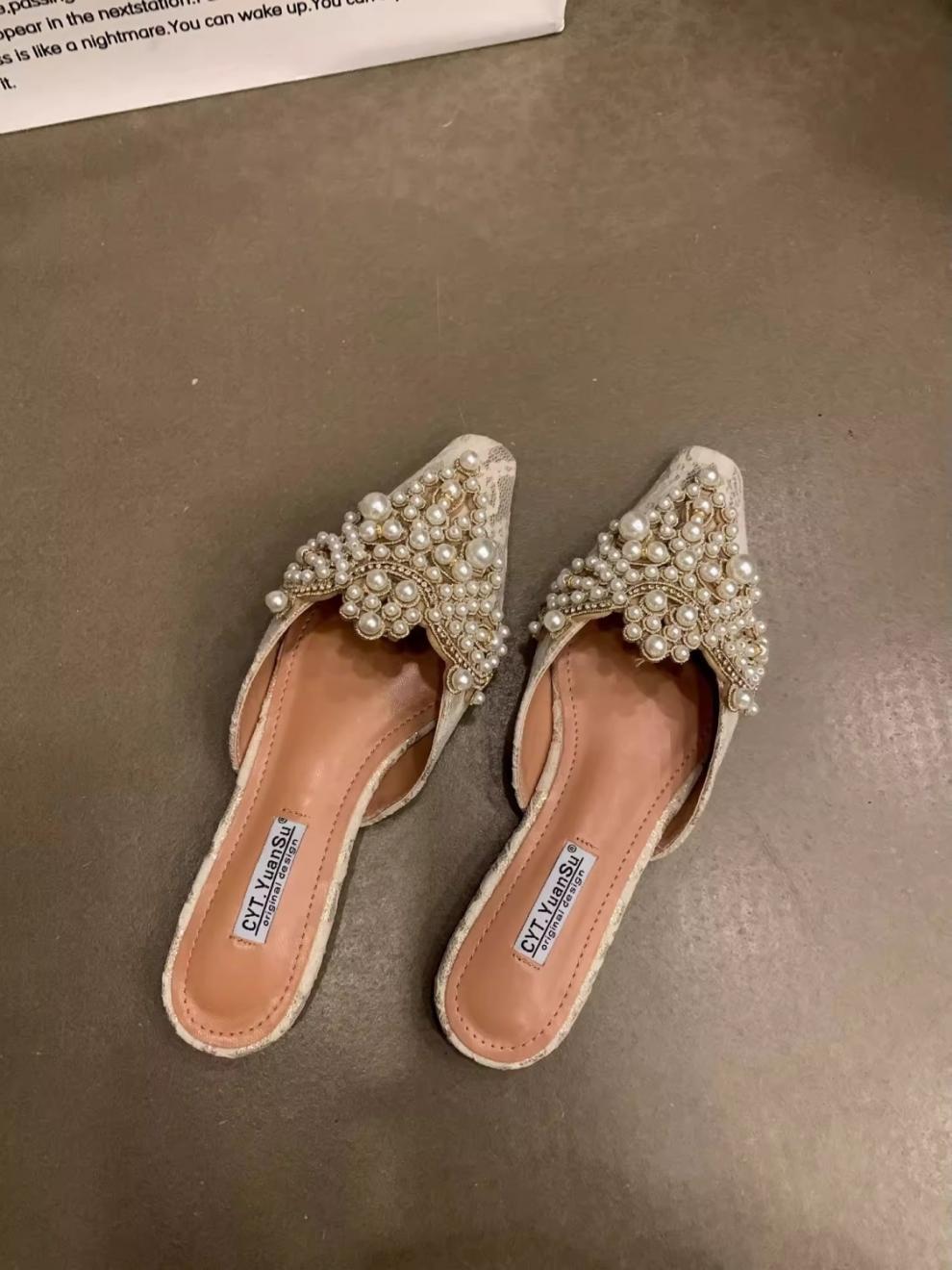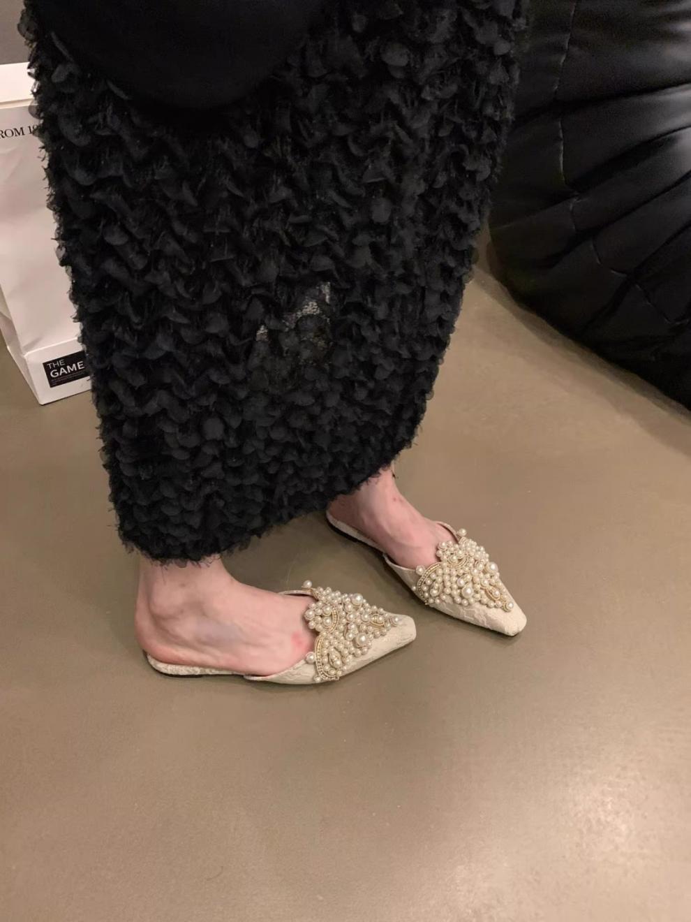 우아한 중국 스타일 바오터우 레이스 여성 신발 플랫 포인티드 토 하프 슬리퍼 여성 여름 샌들 슬리퍼 진주 라인스톤 게으른 슬리퍼스토어 가기
