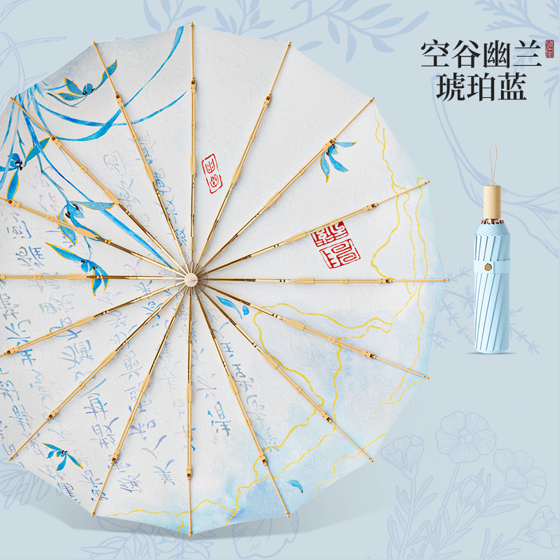 중국풍 16본 수동 방풍 이중 나무 우산, 여성용 자외선 차단 접이식 고전풍 양산
