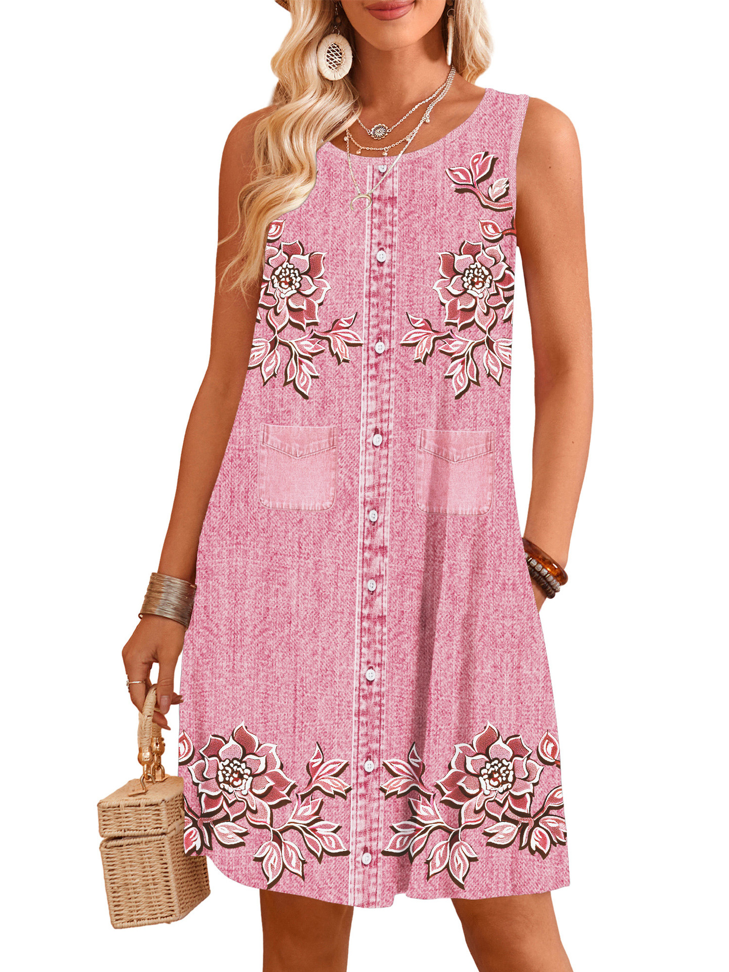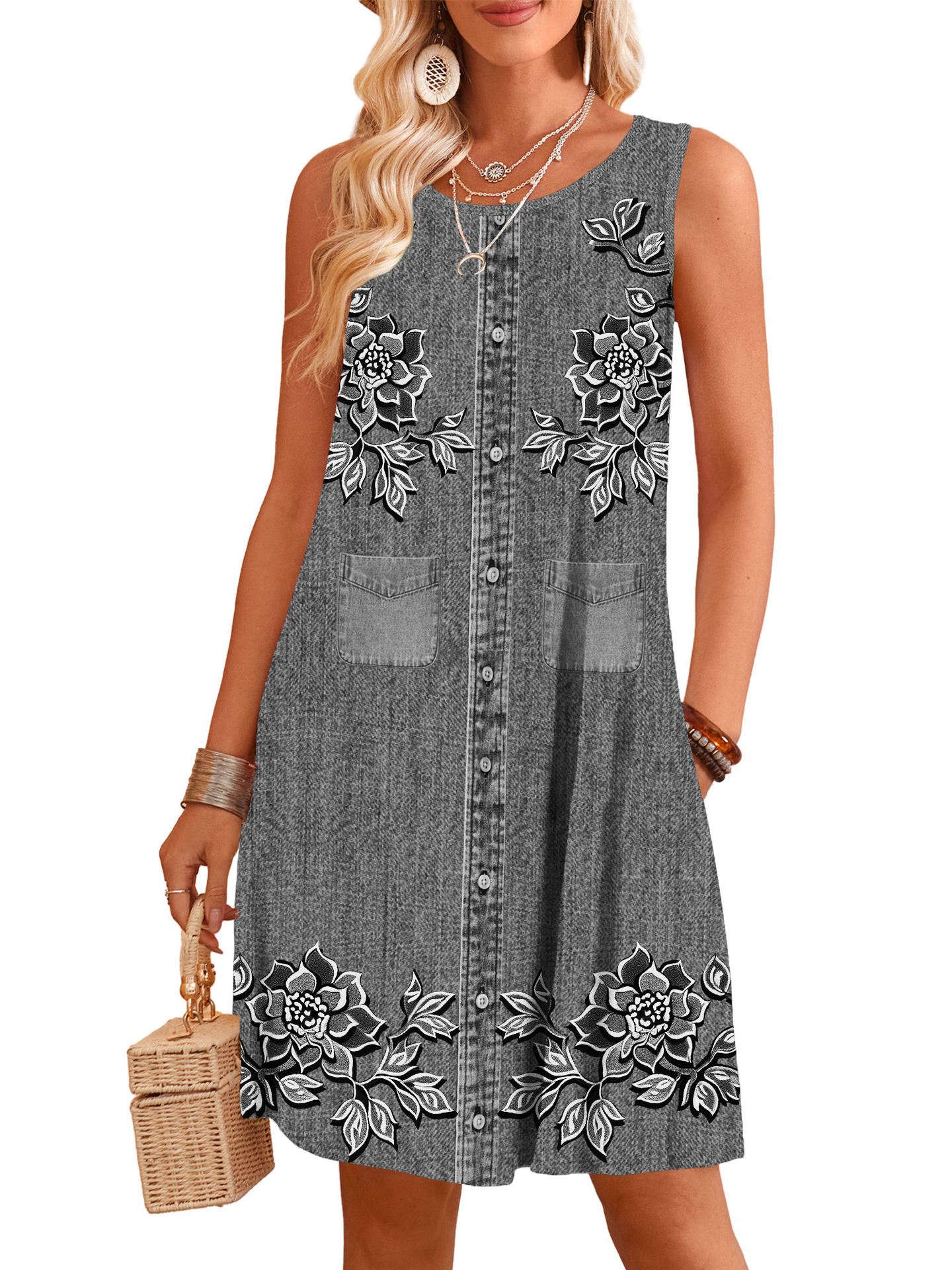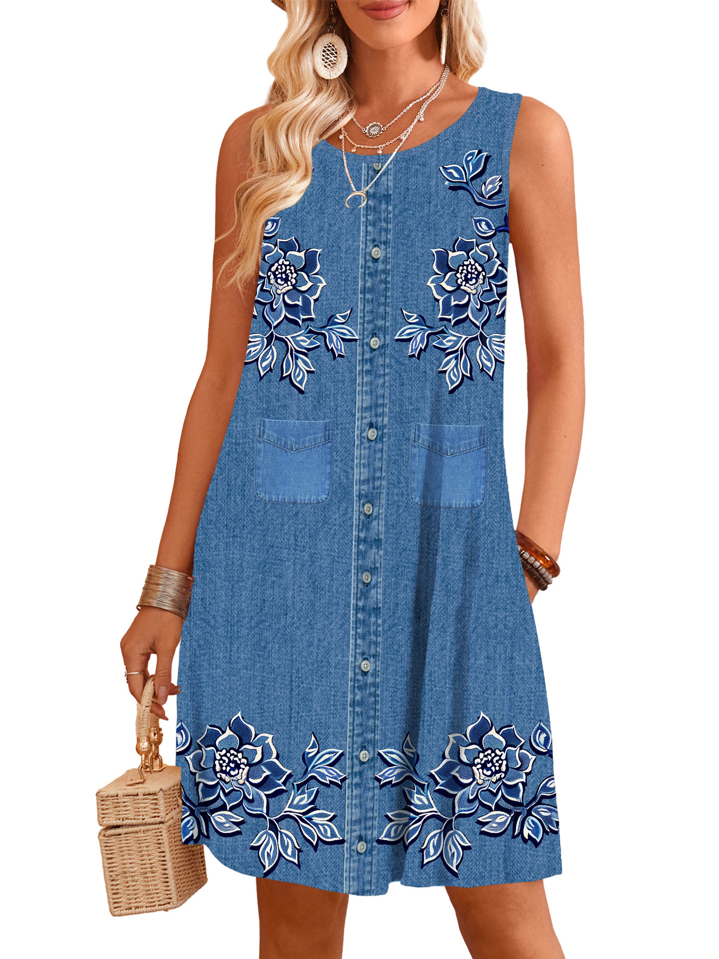 표시 번호 드레스 여름 우유 실크 원단 모조 데님 디지털 인쇄 서스펜더 스커트 민소매 스트레이트 루즈스토어 가기