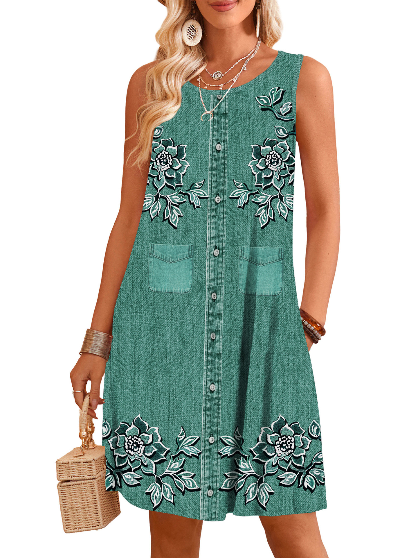표시 번호 드레스 여름 우유 실크 원단 모조 데님 디지털 인쇄 서스펜더 스커트 민소매 스트레이트 루즈