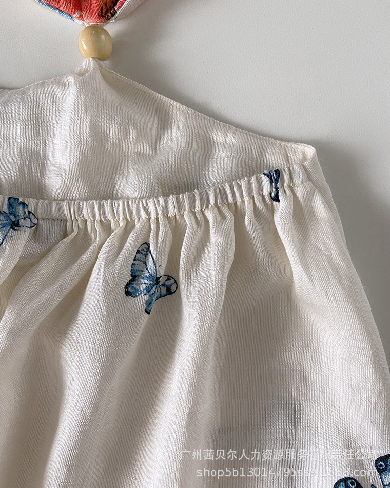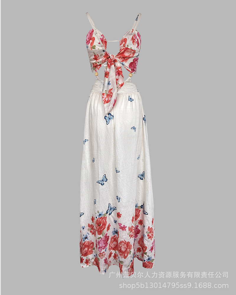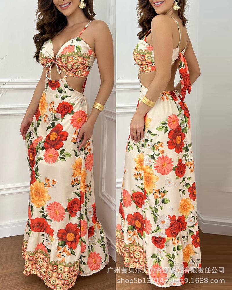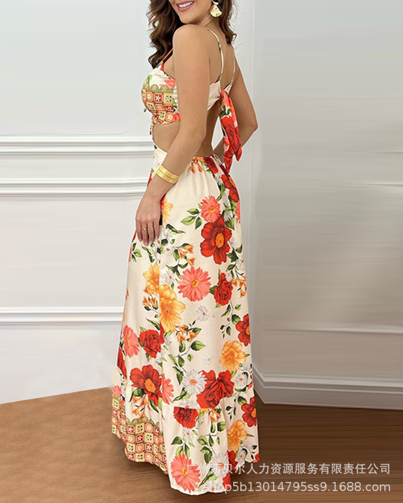 ODF4362B 유럽과 미국의 꽃무늬 휴가 프린트 섹시한 가슴 타이와 허리가 노출된 서스펜더 롱 드레스스토어 가기