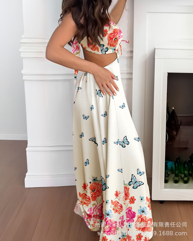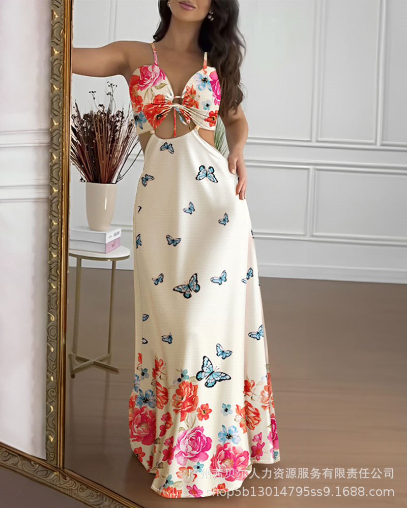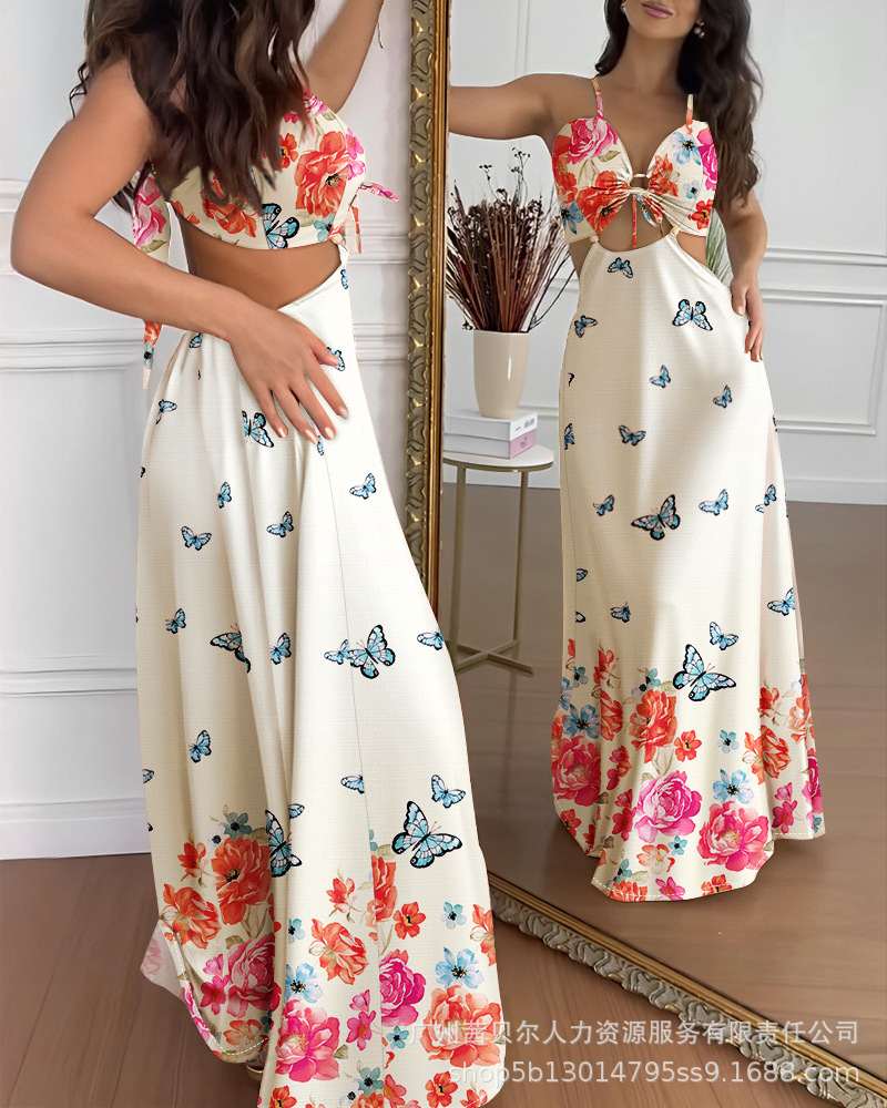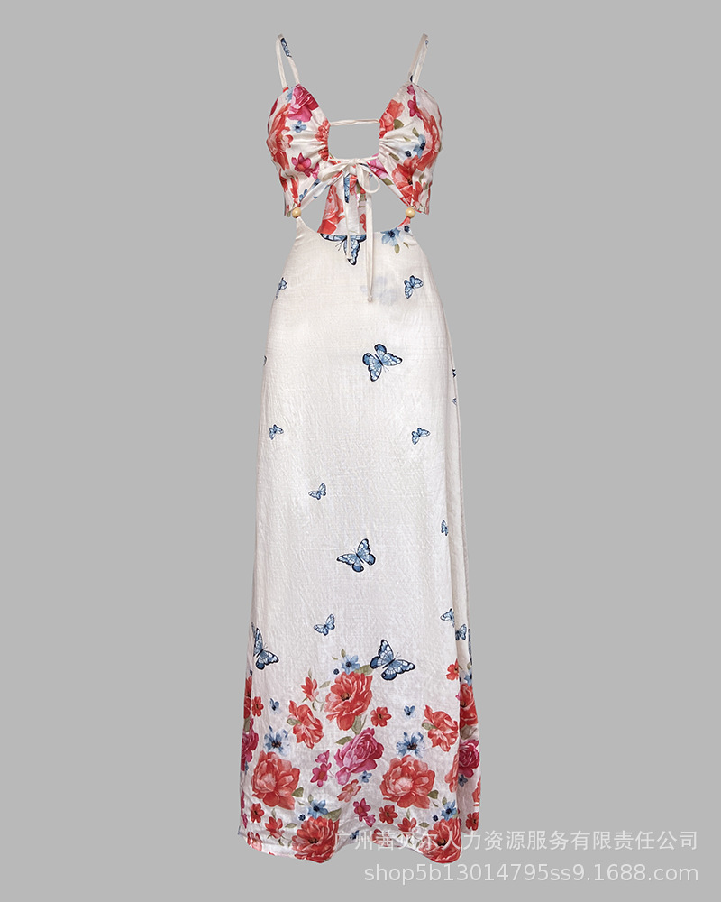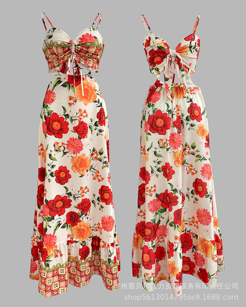ODF4362B 유럽과 미국의 꽃무늬 휴가 프린트 섹시한 가슴 타이와 허리가 노출된 서스펜더 롱 드레스