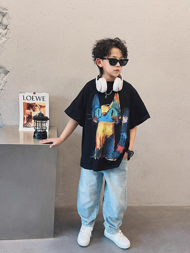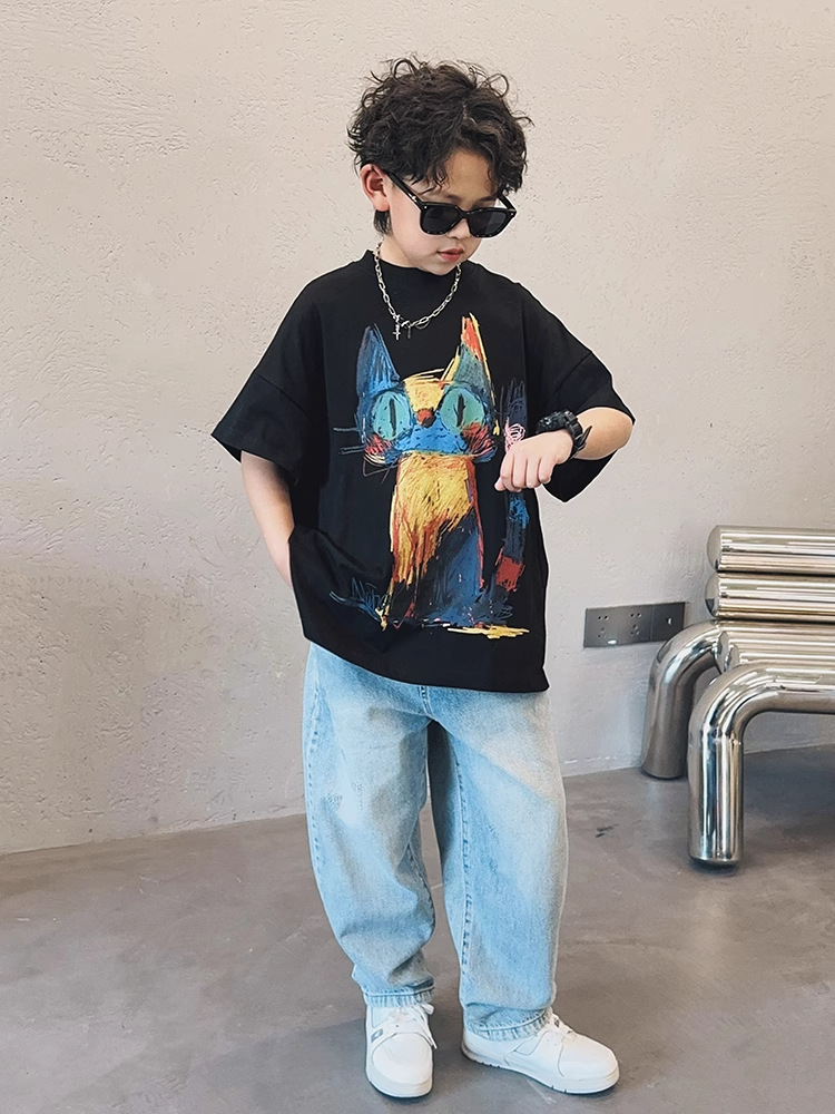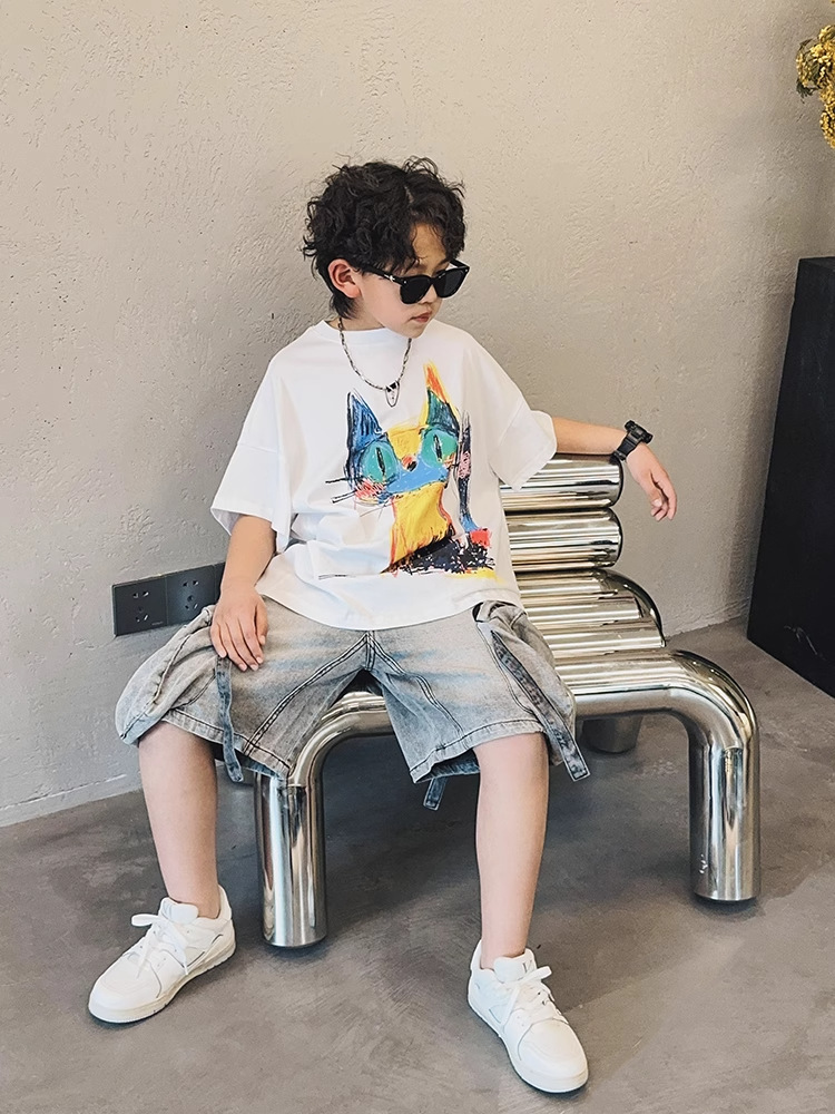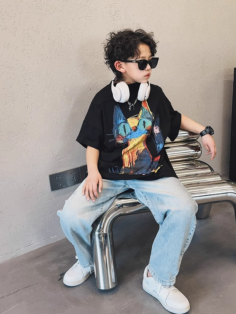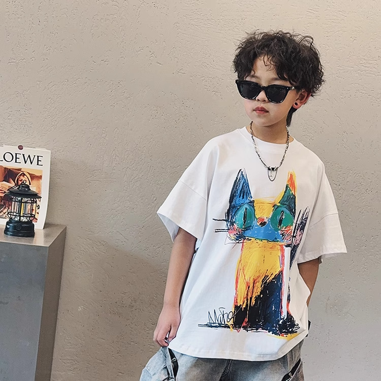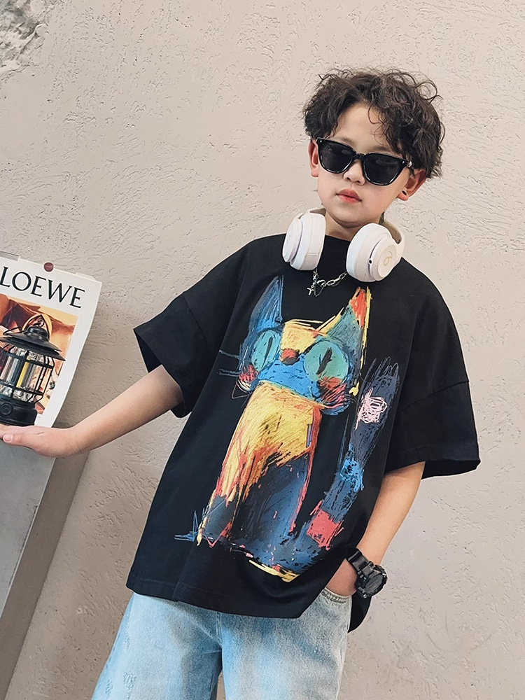 아동용 반팔 티셔츠 소년 여름 2025 새로운 스타일 중대형 어린이 만화 프린트 다용도 루즈 트렌디 쿨 바닥 셔츠스토어 가기