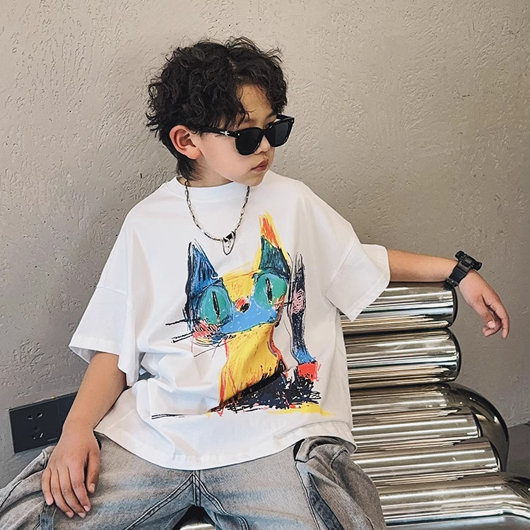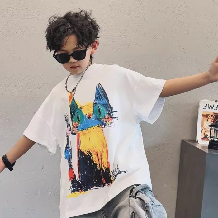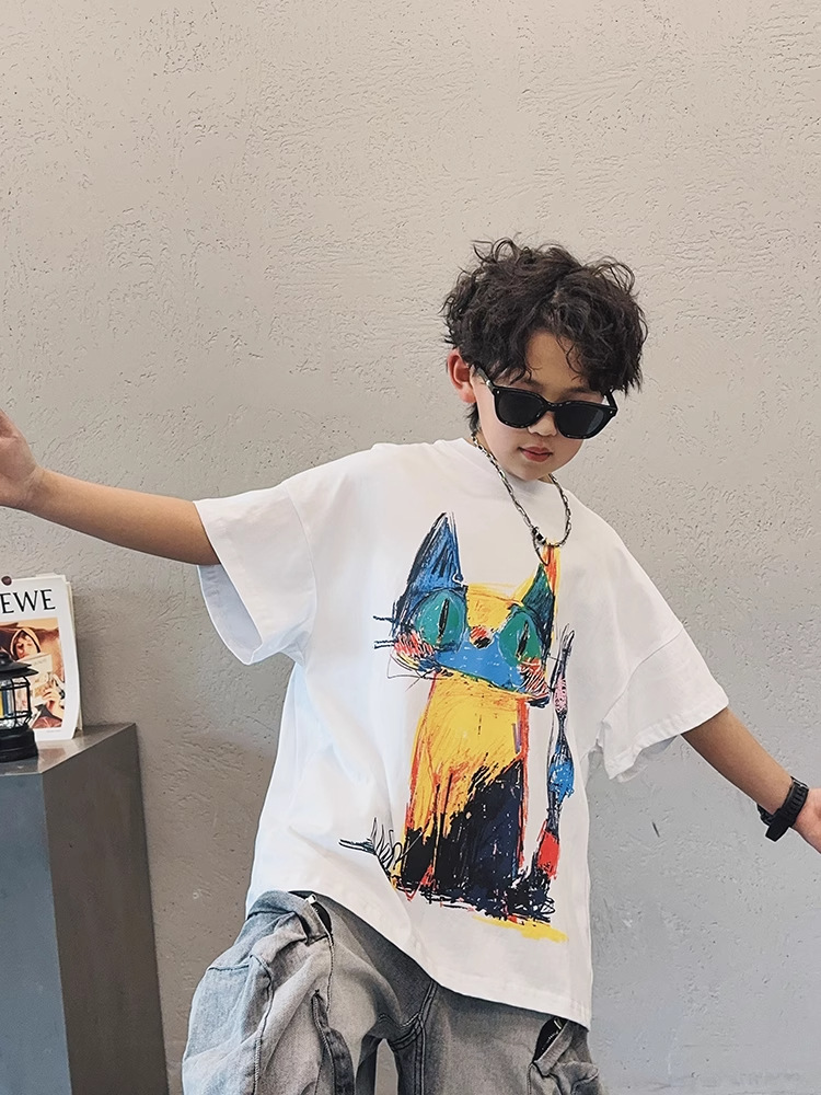 아동용 반팔 티셔츠 소년 여름 2025 새로운 스타일 중대형 어린이 만화 프린트 다용도 루즈 트렌디 쿨 바닥 셔츠