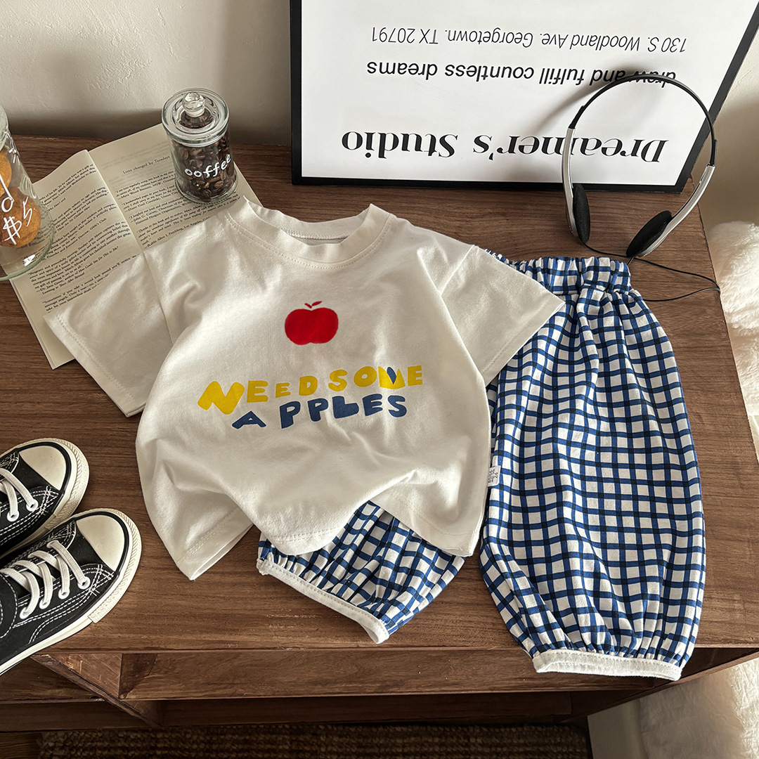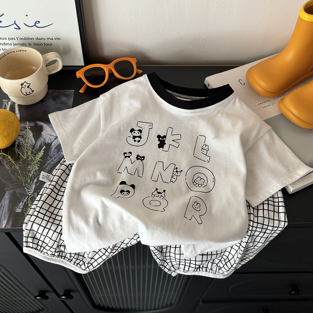 어린이 여름 정장 격자 무늬 바지 1-7 세 새로운 한국 스타일 아동 의류 소년 편지 티셔츠 소녀 반바지 투피스 세트스토어 가기