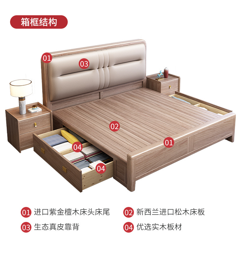 보라색 금 백단 원목 침대, 원목, 기둥 및 모따기, 두꺼운 마스터 침실, 현대적이고 단순한 고급 더블 침대 수납