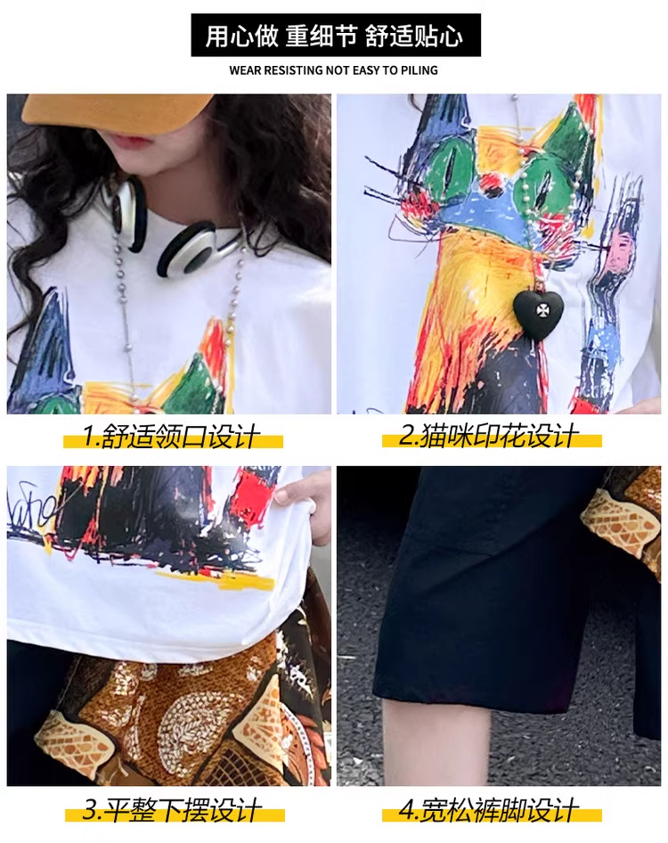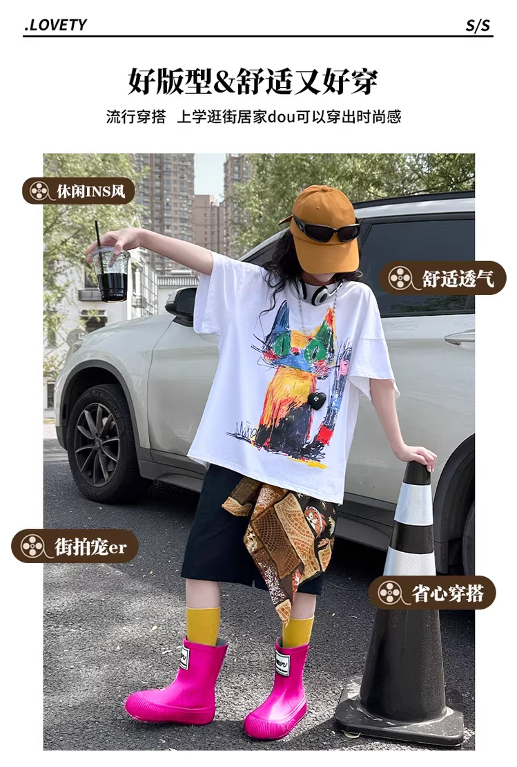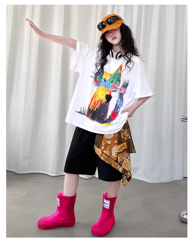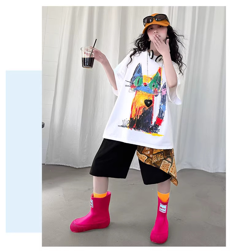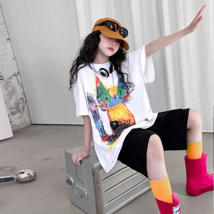 여아 여름 2026 신상 얇은 컬러풀한 그래피티 고양이 디자인 순면 반팔 티셔츠 루즈핏 캐주얼 트렌디스토어 가기