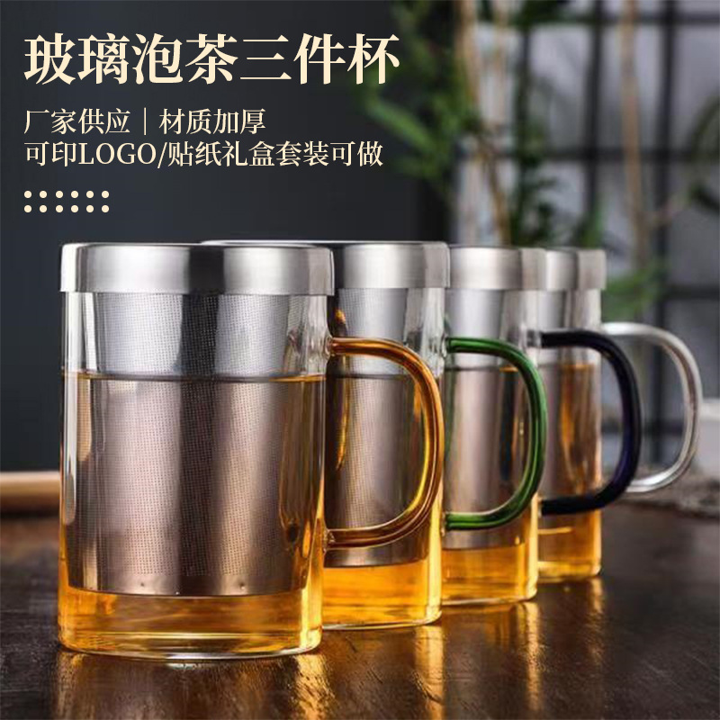 손잡이가 있는 유리 찻잔, 스테인리스 라이너, 필터 꽃차 컵, 마시는 컵, 내열 차 물 분리 컵, 3피스 컵
