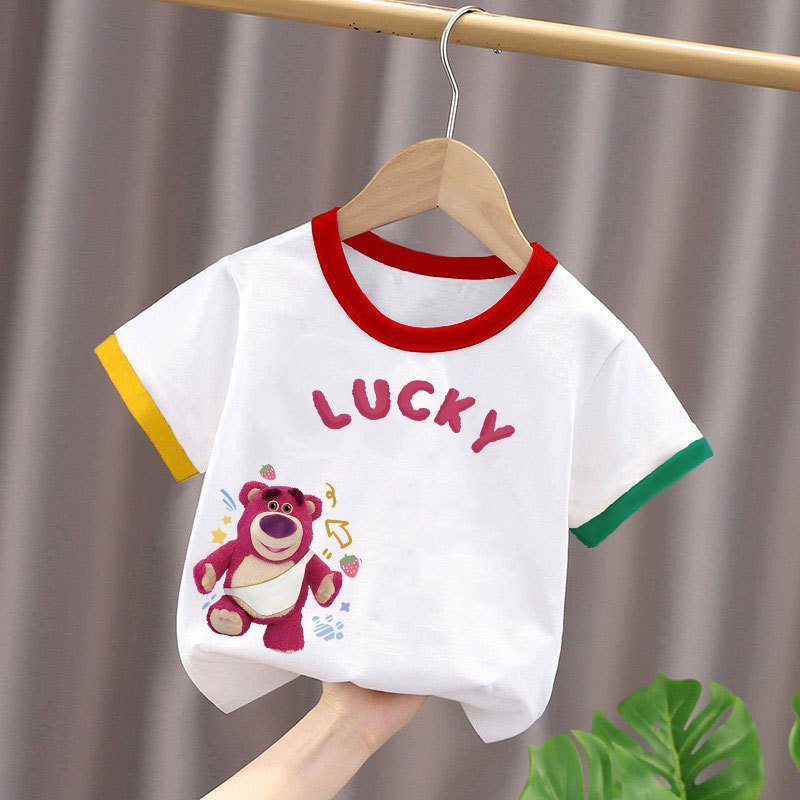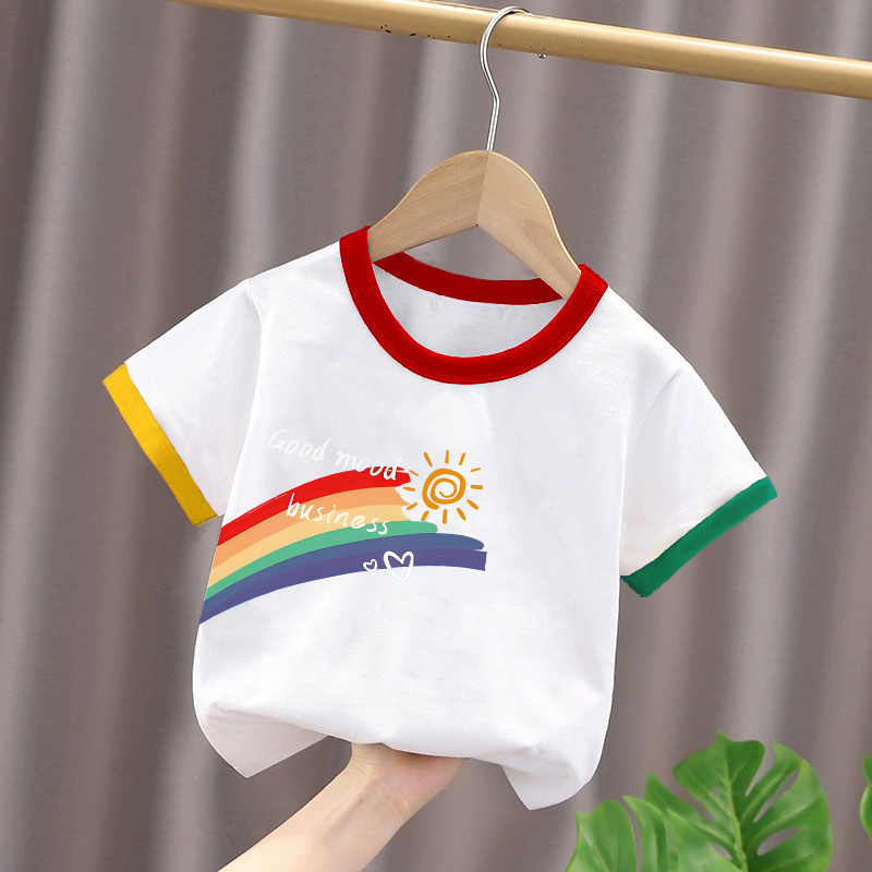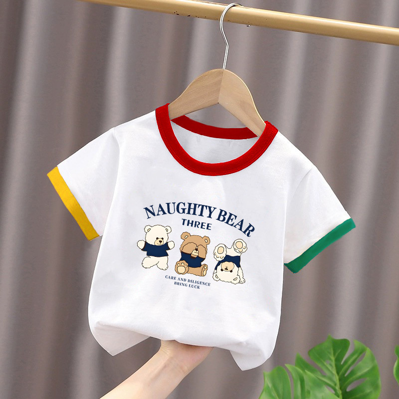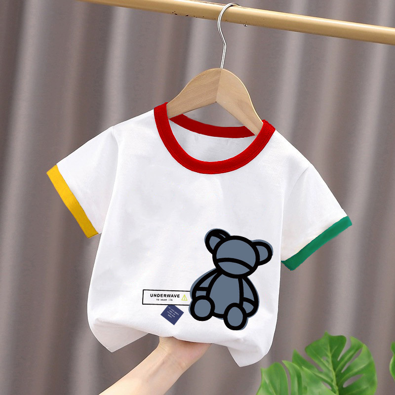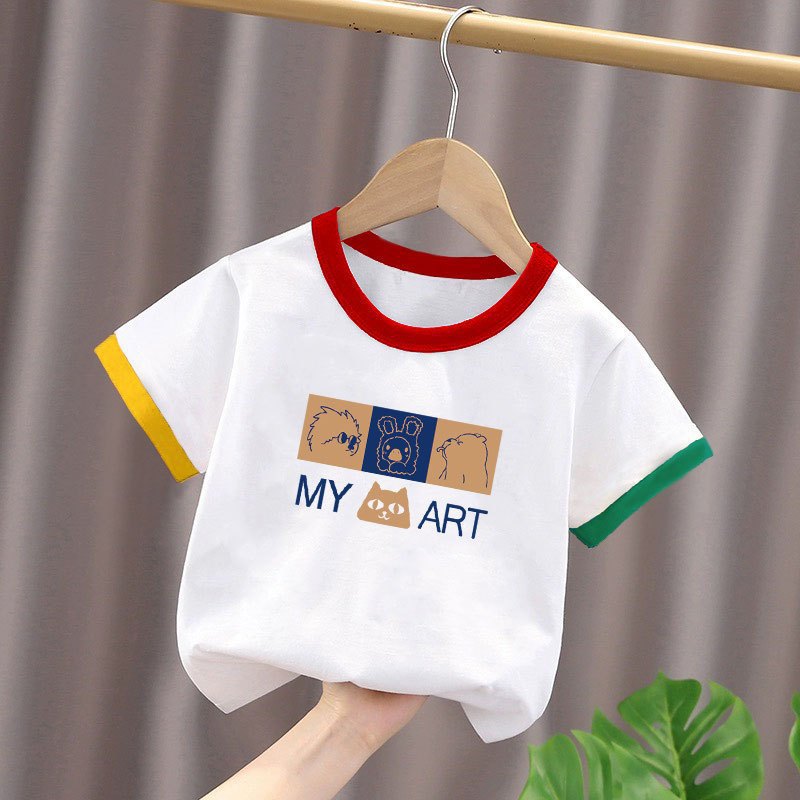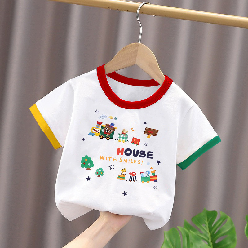 2025년 여름 새로운 스타일의 순면 아기 스타일 만화 프린트 컬러 블록 탑(남학생과 여학생용), 중대형 아동용 하의 셔츠스토어 가기