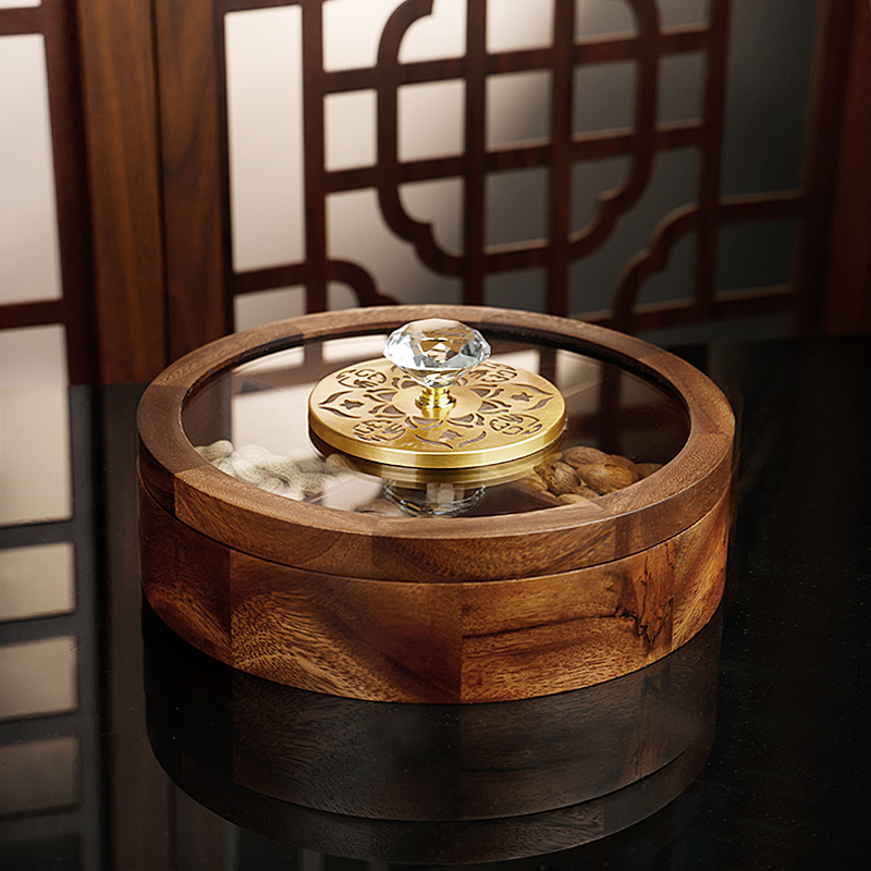 가정용 거실을 위한 새로운 중국 스타일의 Jinfu 단단한 나무 건조 과일 접시, 견과류 칸막이, 뚜껑이 있는 이중층 스낵 보관 상자스토어 가기