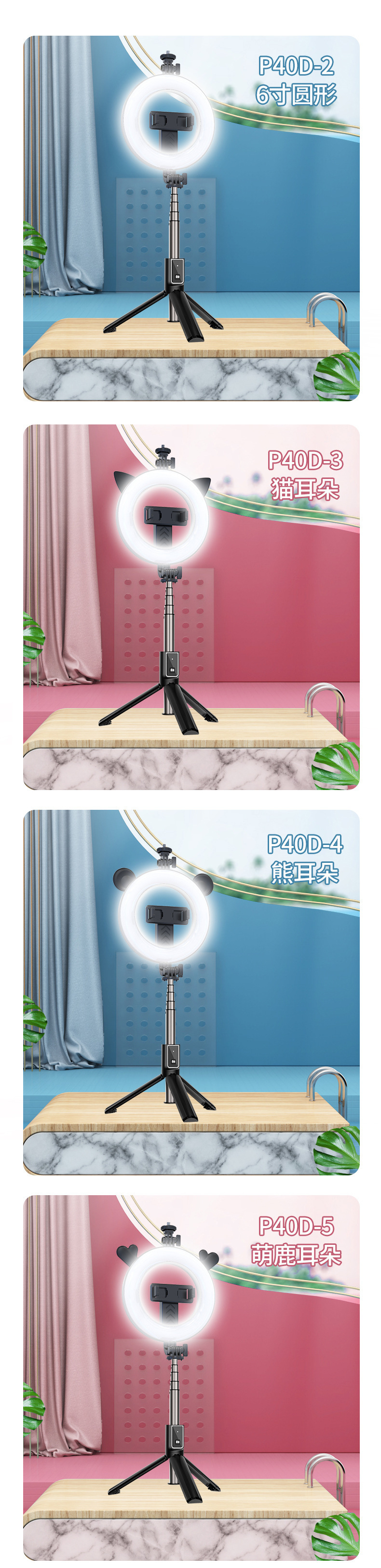 새로운 P40D 휴대용 무선 원격 제어 통합 6inch 라운드 뷰티 휴대 전화 라이브 방송 브래킷 필 라이트 셀카 스틱스토어 가기