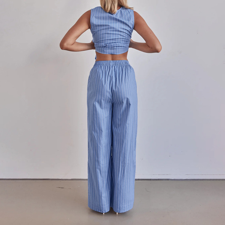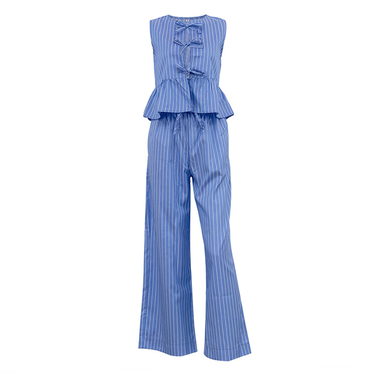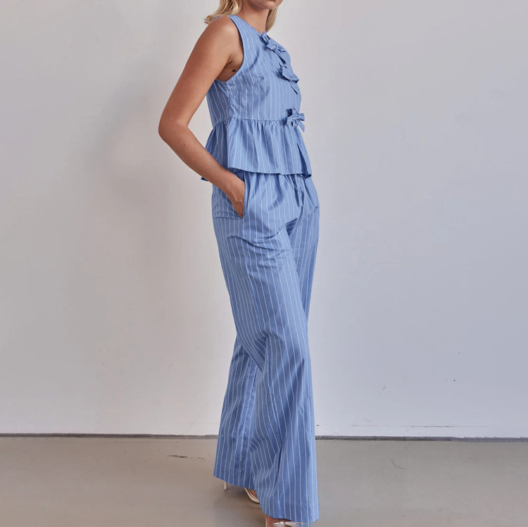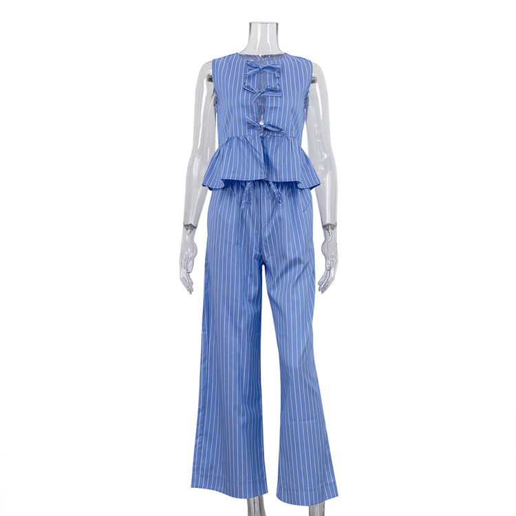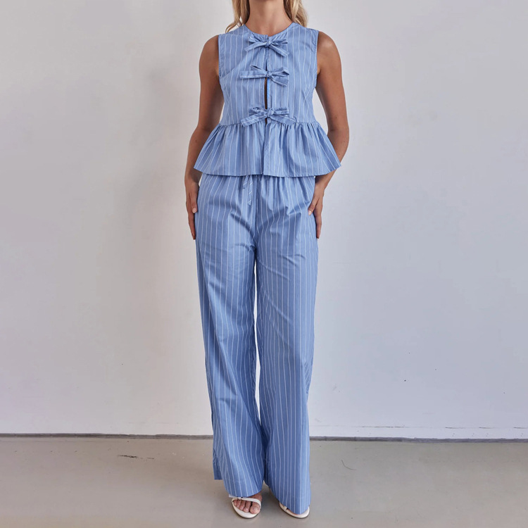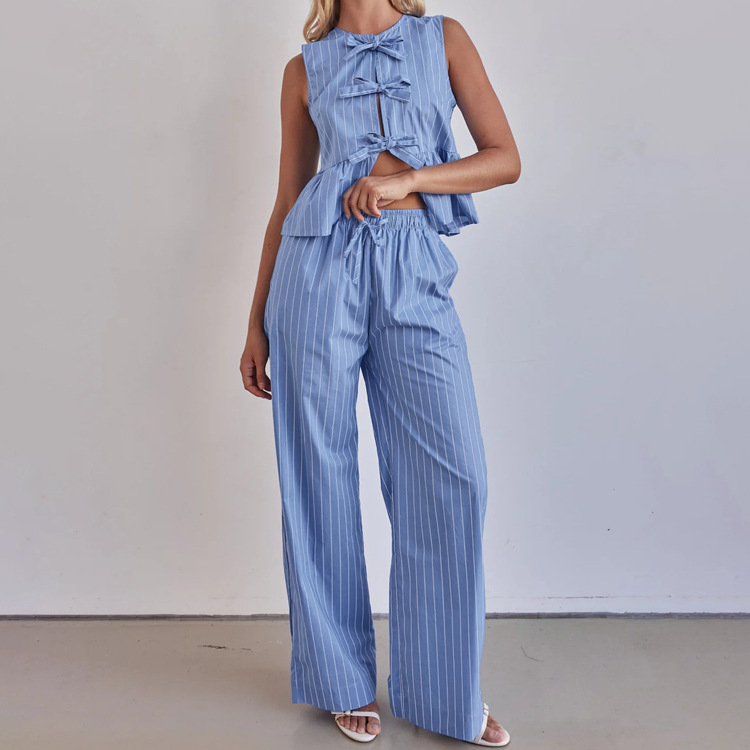패션 스트라이프 조끼 세트 2025 새로운 라운드 넥 보우 민소매 탑 루즈 와이드 레그 팬츠 투피스 세트스토어 가기