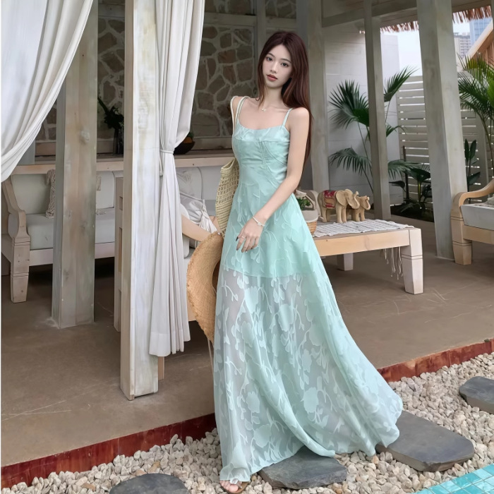 여름 여성용 해변 리조트 스타일 그린 서스펜더 드레스, 메쉬 스플라이싱 허리 슬리밍 A라인 스커트 롱 스커트스토어 가기