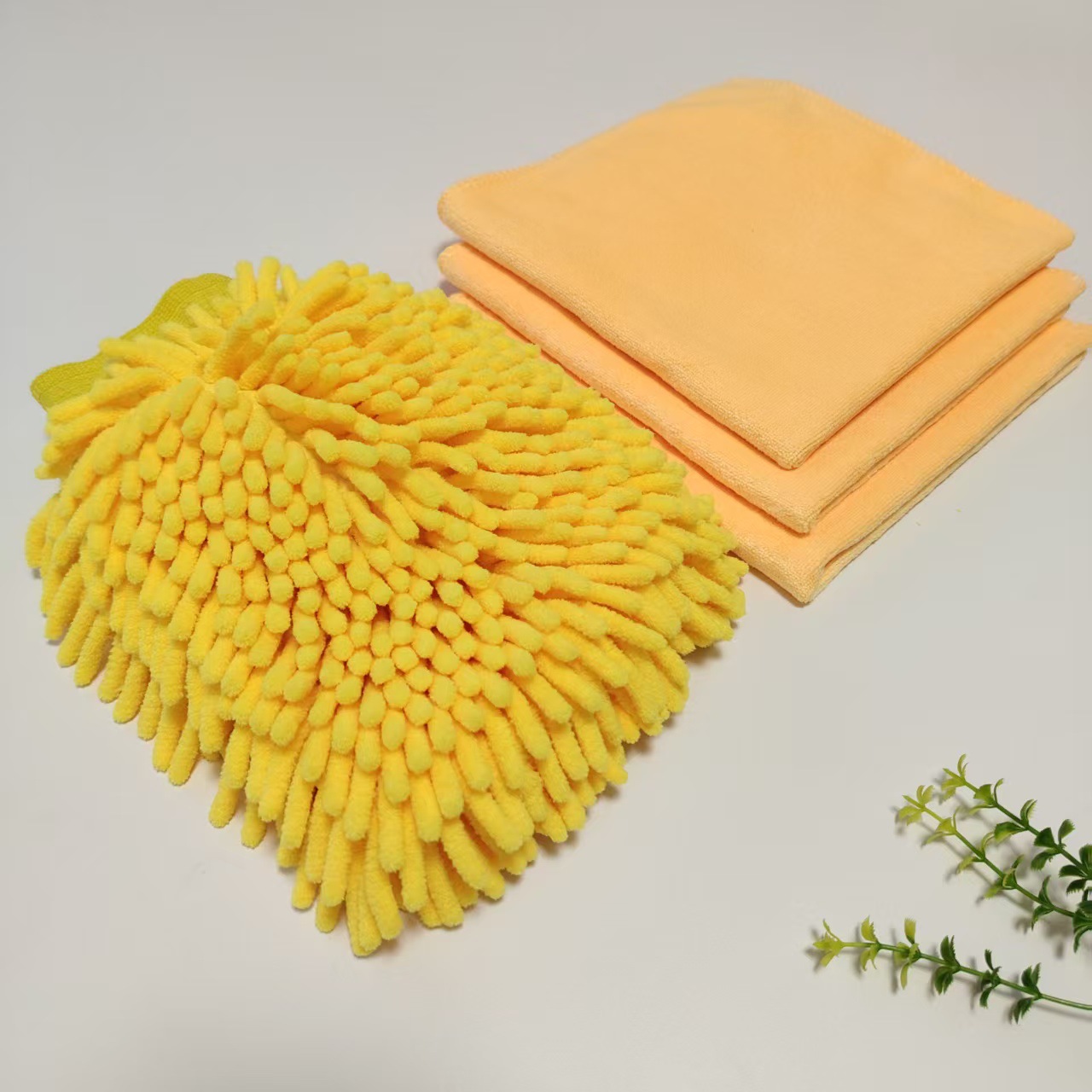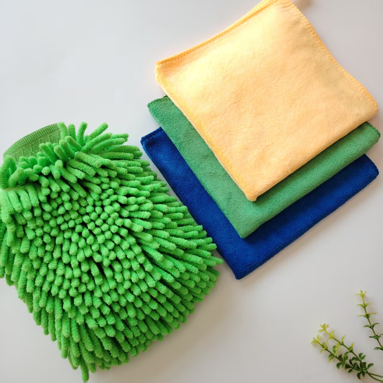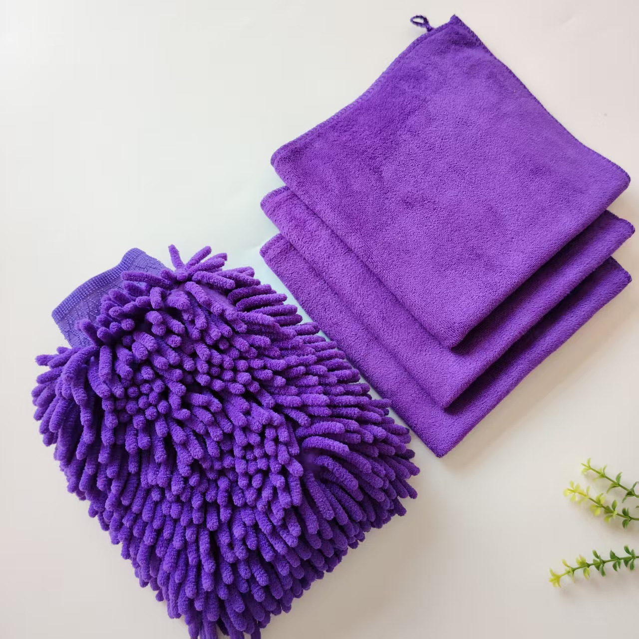 자동차 청소 용품 4종 세트, 두꺼운 섬유 수건, 양면 셔닐 자동차 닦는 장갑, 국경 간 라벨링
