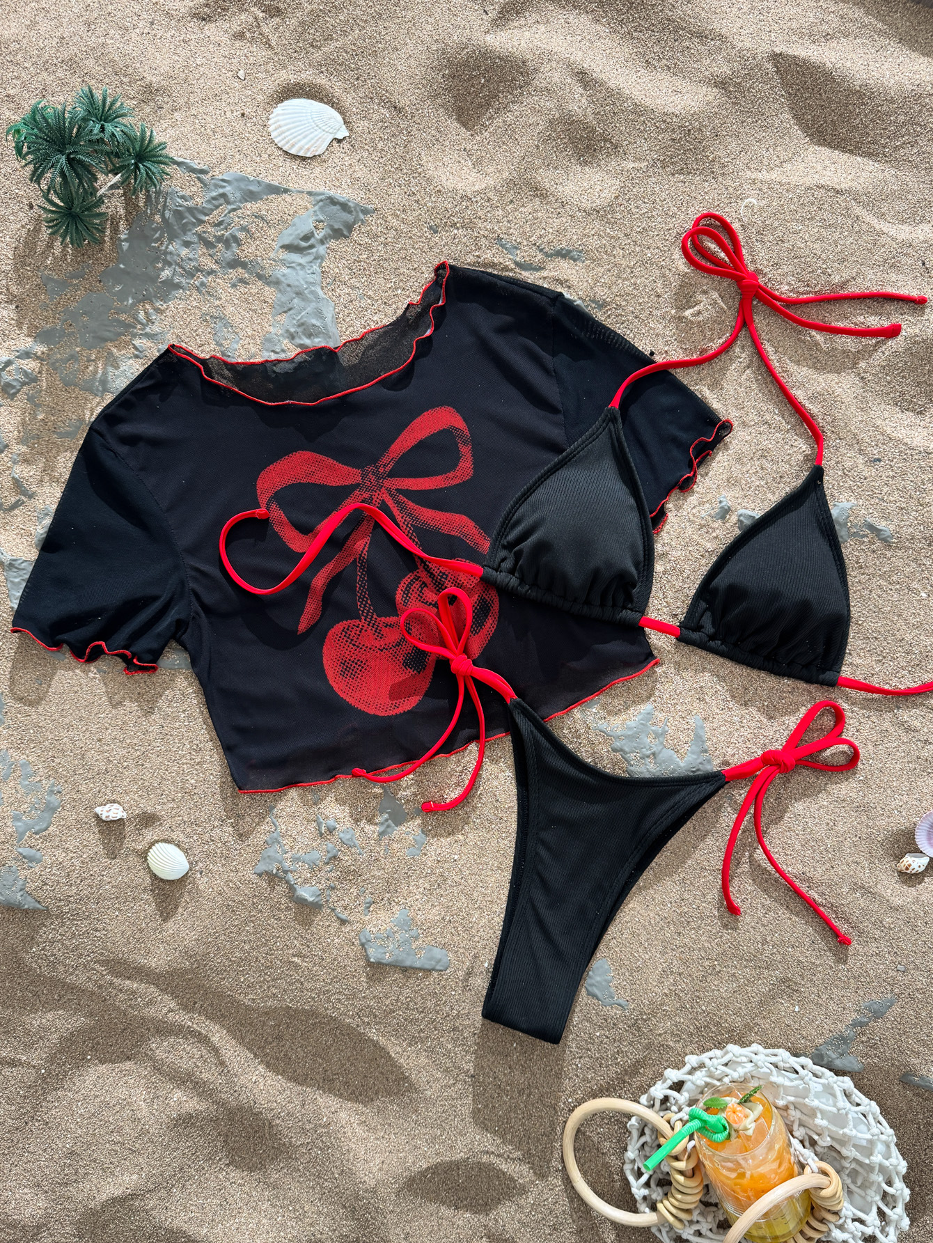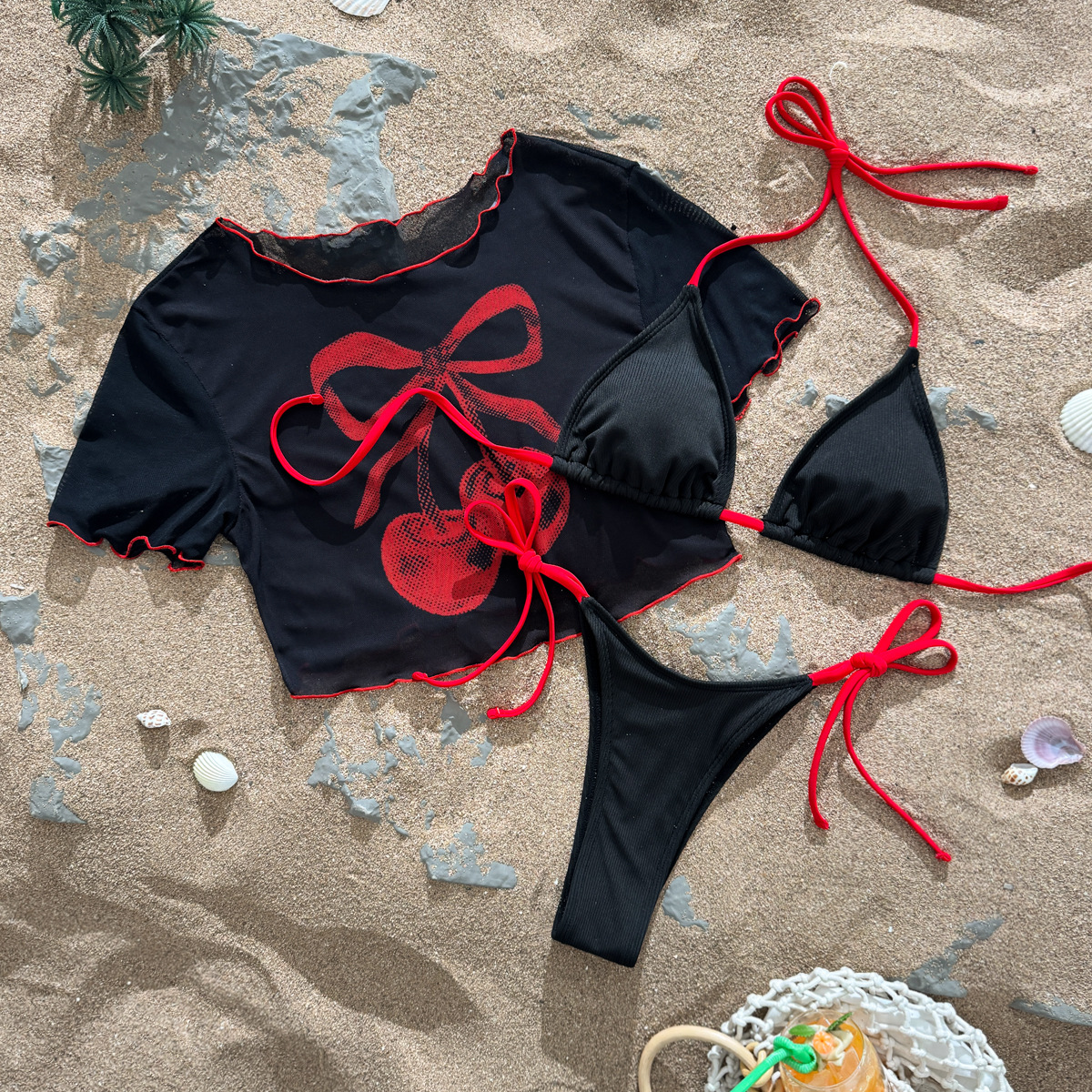 2025 3피스 비키니 세트, 3점 스타일, 끈으로 묶는 백리스 탑, 커버업 수영복, 유럽 및 미국 수출용 수영복, 섹시한 백리스 디자인스토어 가기