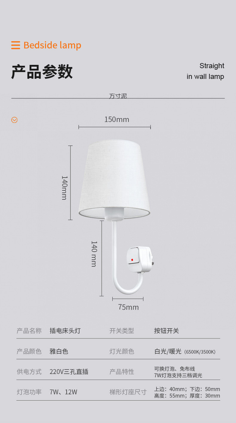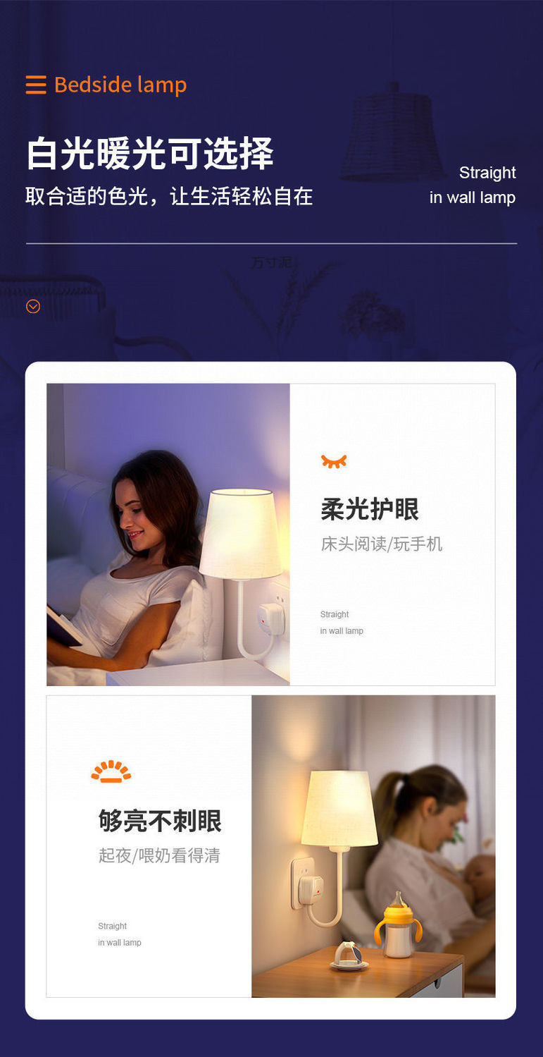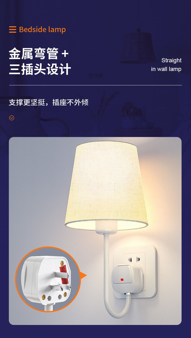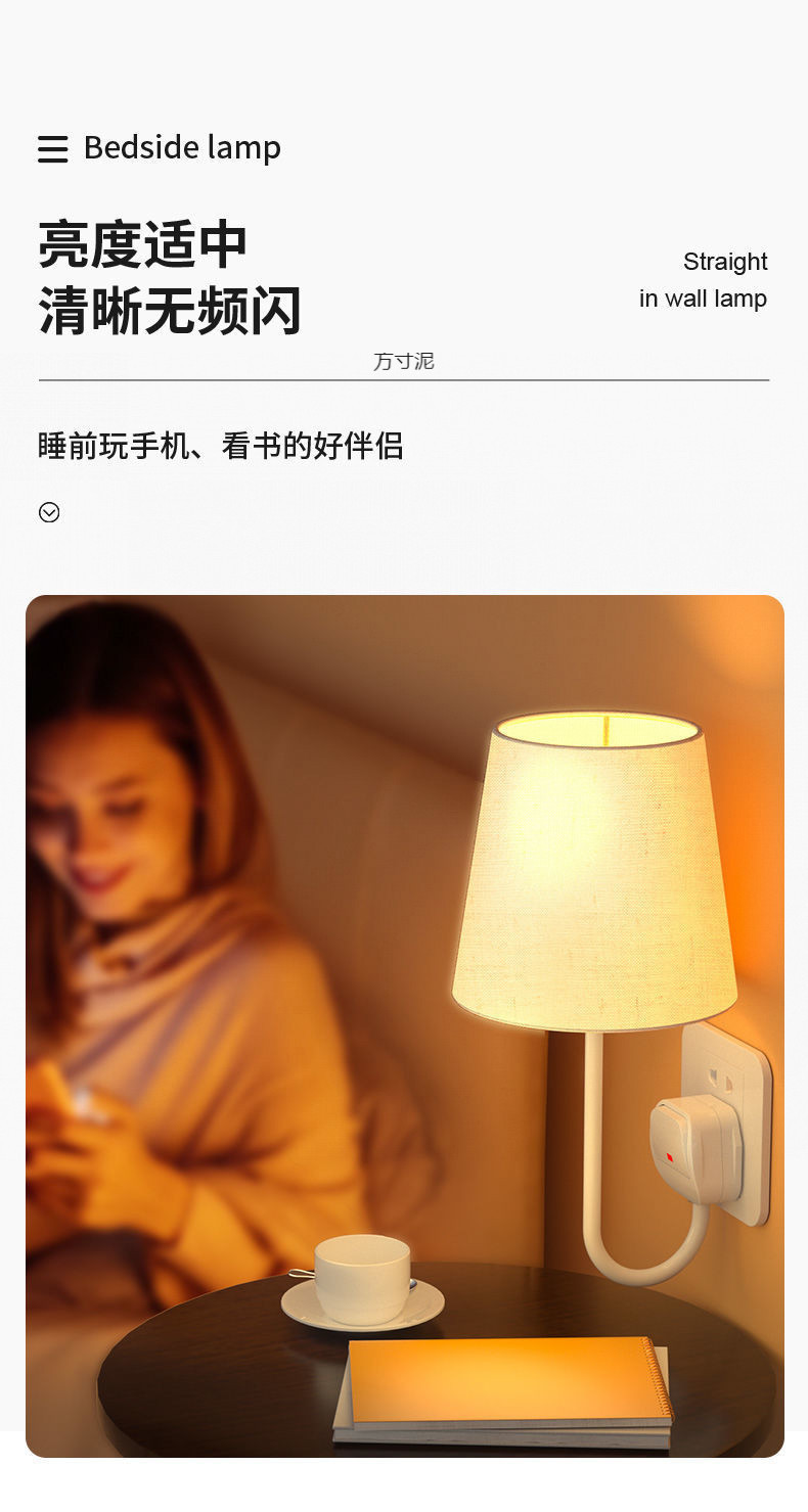 플러그인 침대 옆 벽 램프, 배선 없음, 설치 없음, 펀치 없음, 침대 옆 램프, 침실 부드러운 조명, 소켓형 야간 조명