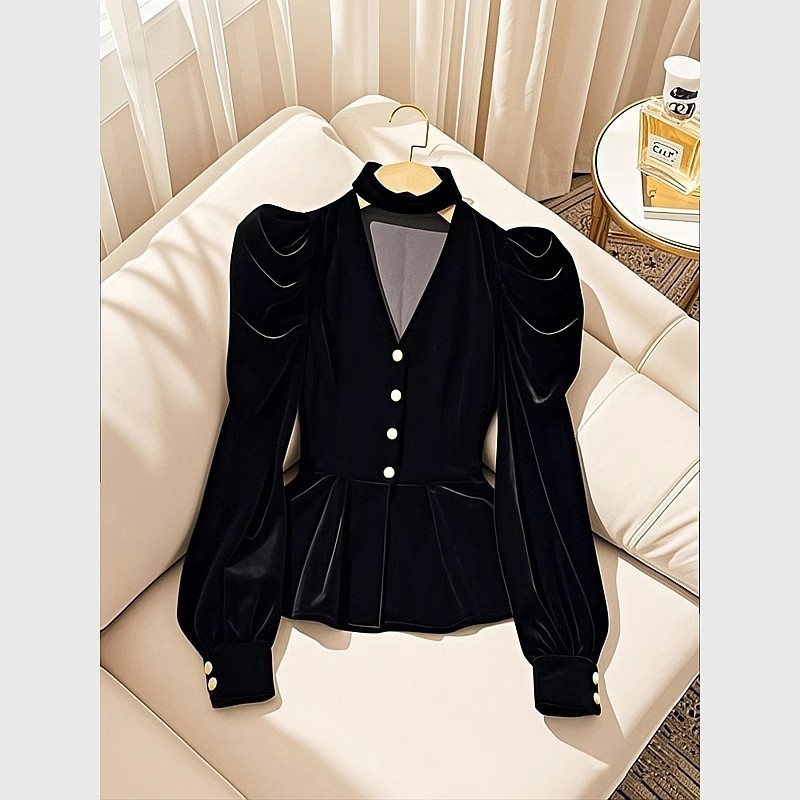 Xiaoxiangfeng 여성용 블랙 벨벳 긴팔 셔츠 2025 이른 봄 새로운 스타일 홀터넥 프렌치 독특하고 아름다운 탑스토어 가기