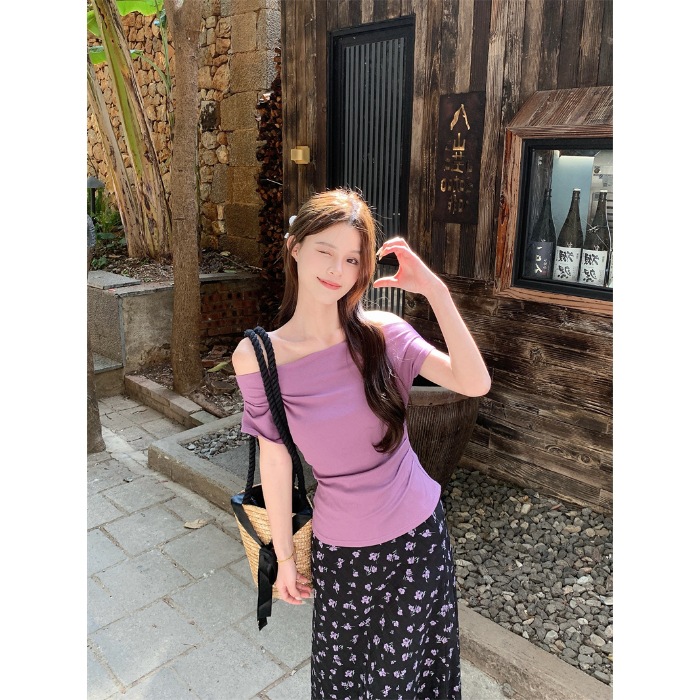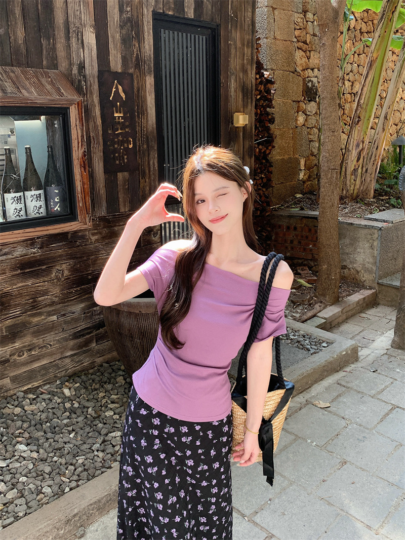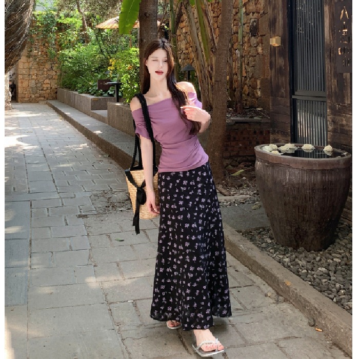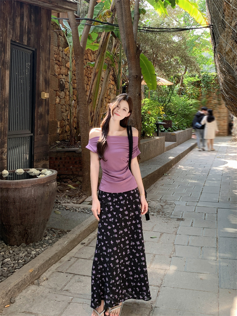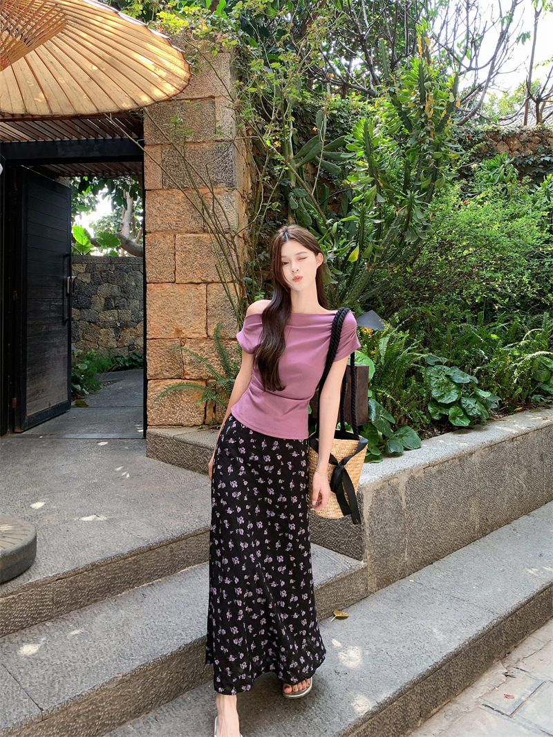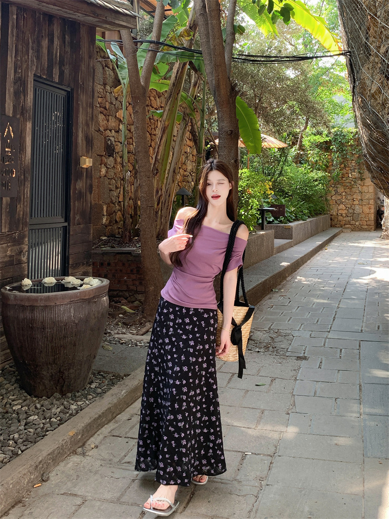 여름 여성용 퍼플 원 숄더 반팔 티셔츠, 여성용 달콤한 꽃무늬 스커트, 여성용 젠틀 패션 슈트스토어 가기
