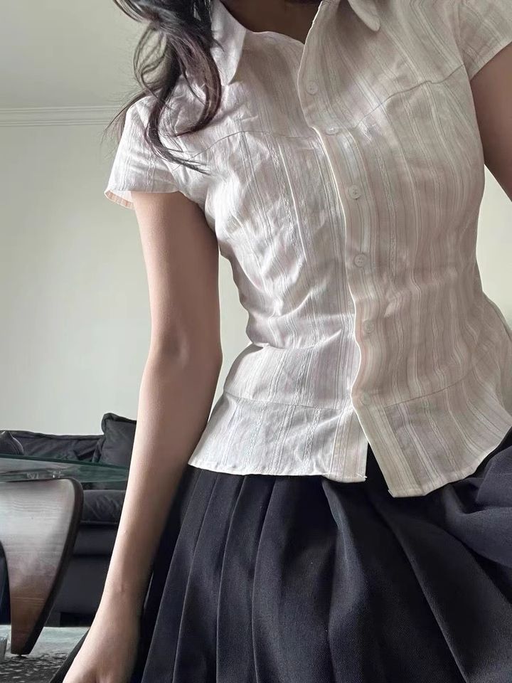 한국 디자인 틈새 시장 달콤한 여성스러운 다용도 스트라이프 라펠 허리 작은 플라잉 슬리브 반소매 셔츠 여성상의스토어 가기