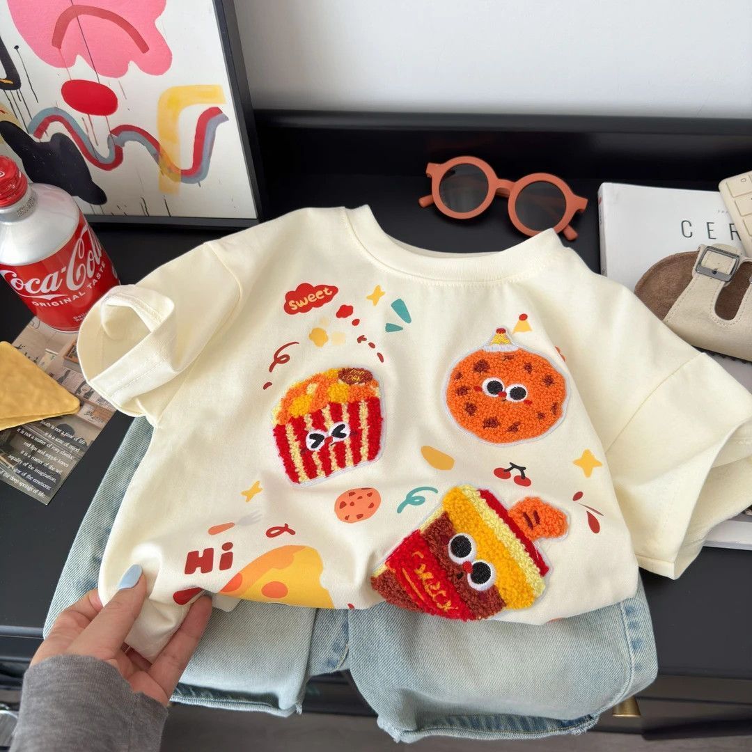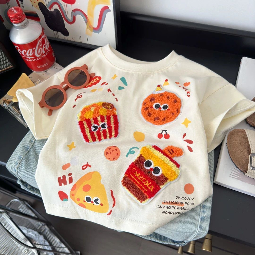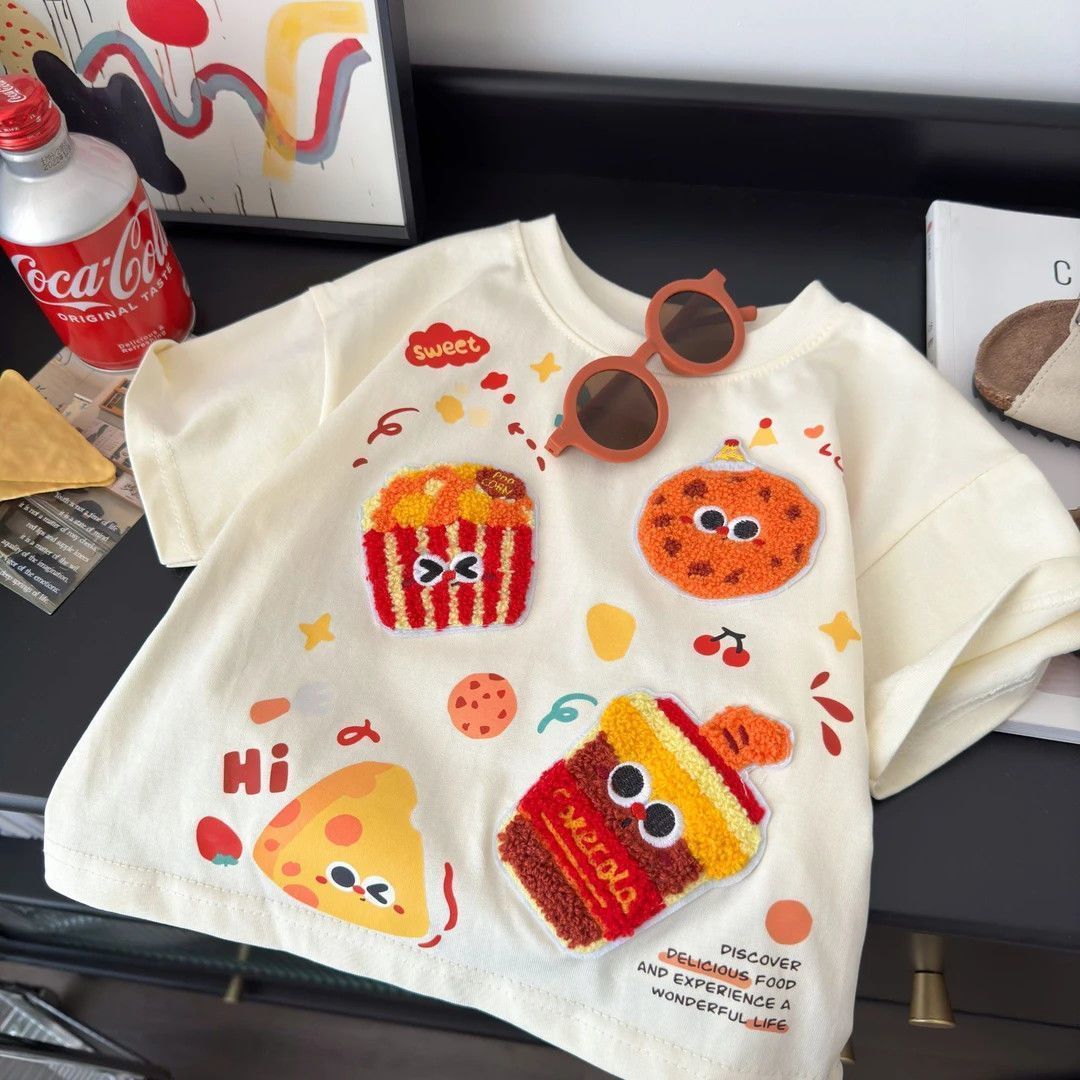 [부모자식복] 아동반팔티셔츠 인기간식파티 콜라감자튀김 여름스타일 루즈한 면반팔스토어 가기