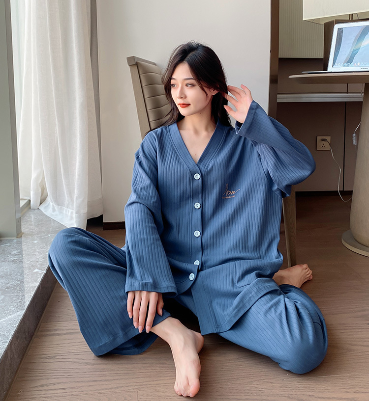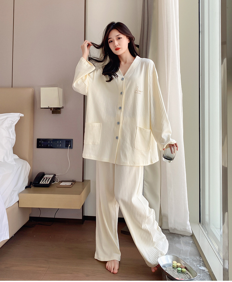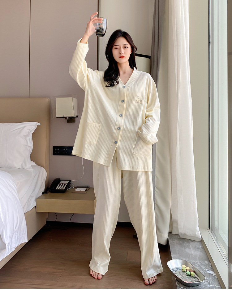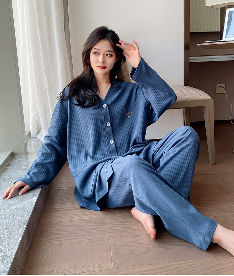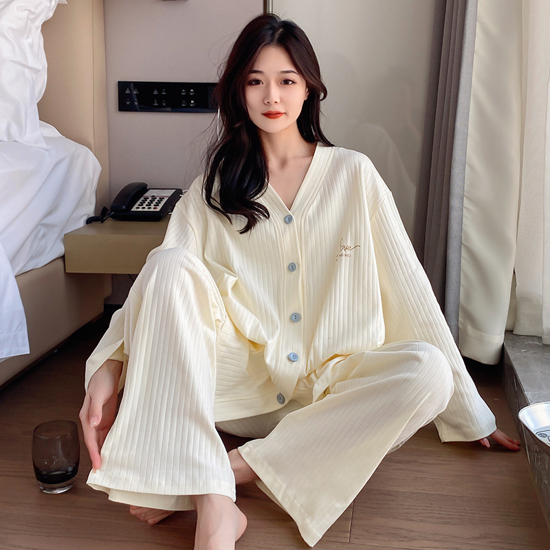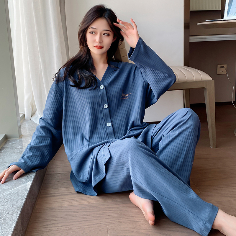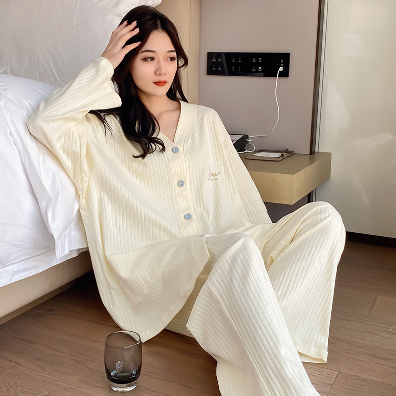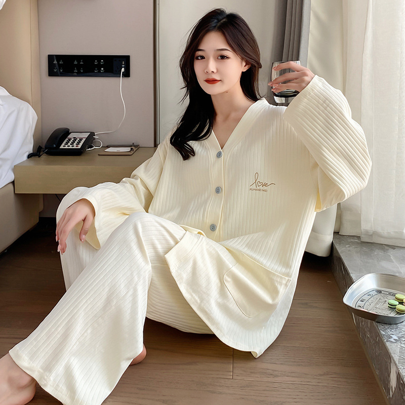 봄과 가을 여성의 얇은 긴팔 잠옷 플러스 사이즈 세트 만화 홈웨어 긴팔 바지 투피스 코튼 가디건스토어 가기
