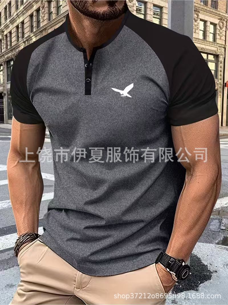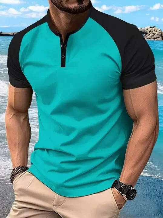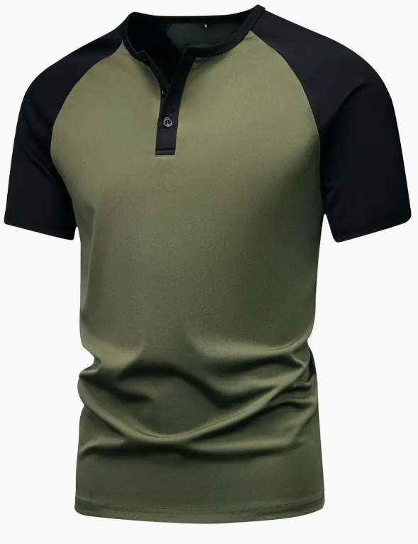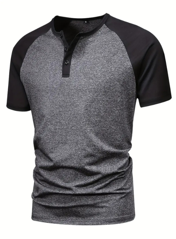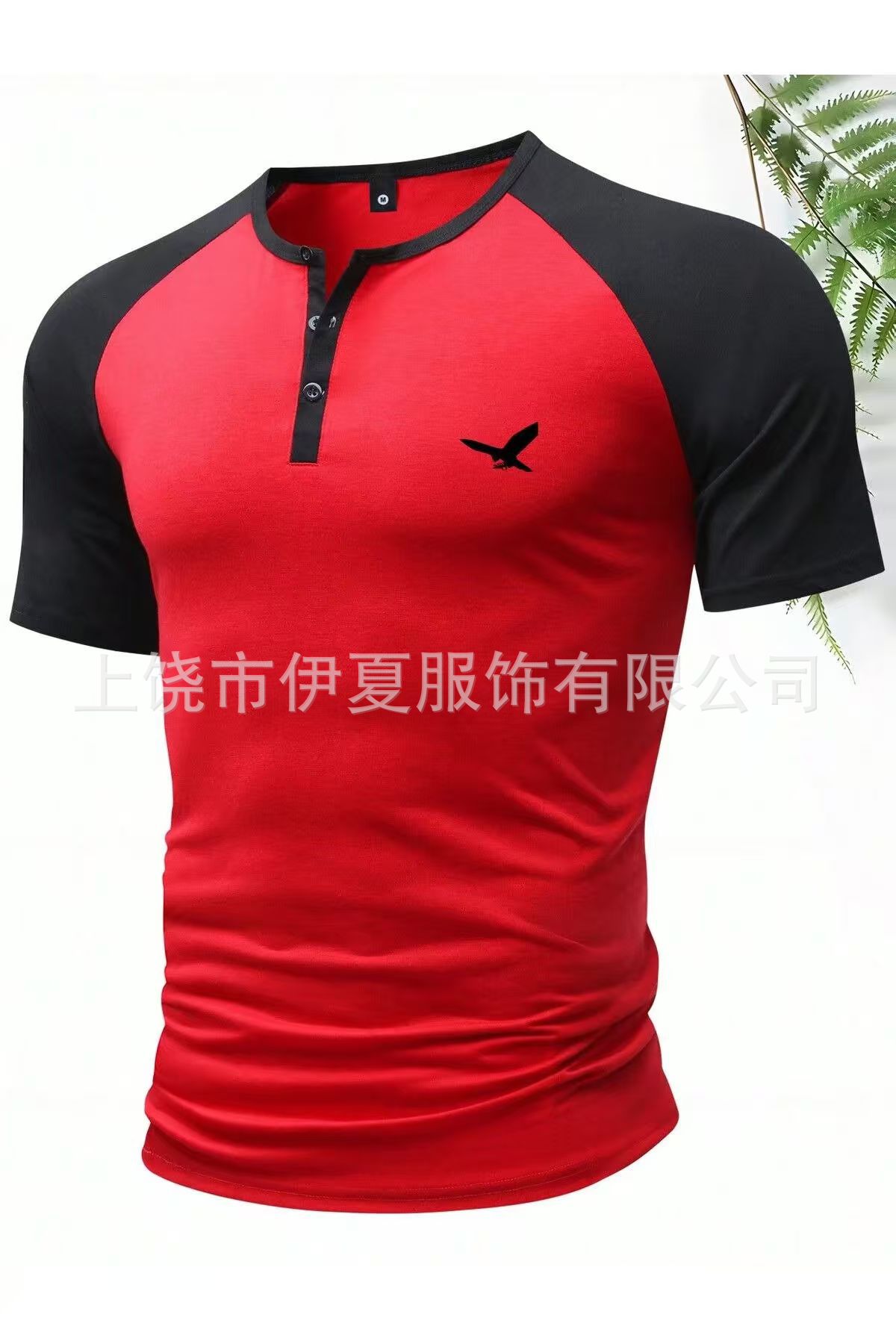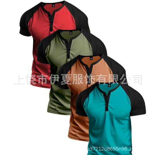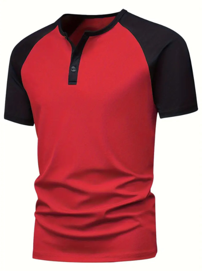 여름 남성 컬러 블록 래글런 반소매 헨리 셔츠, 싱글 브레스트 통기성 스포츠 캐주얼 탑 인 없음