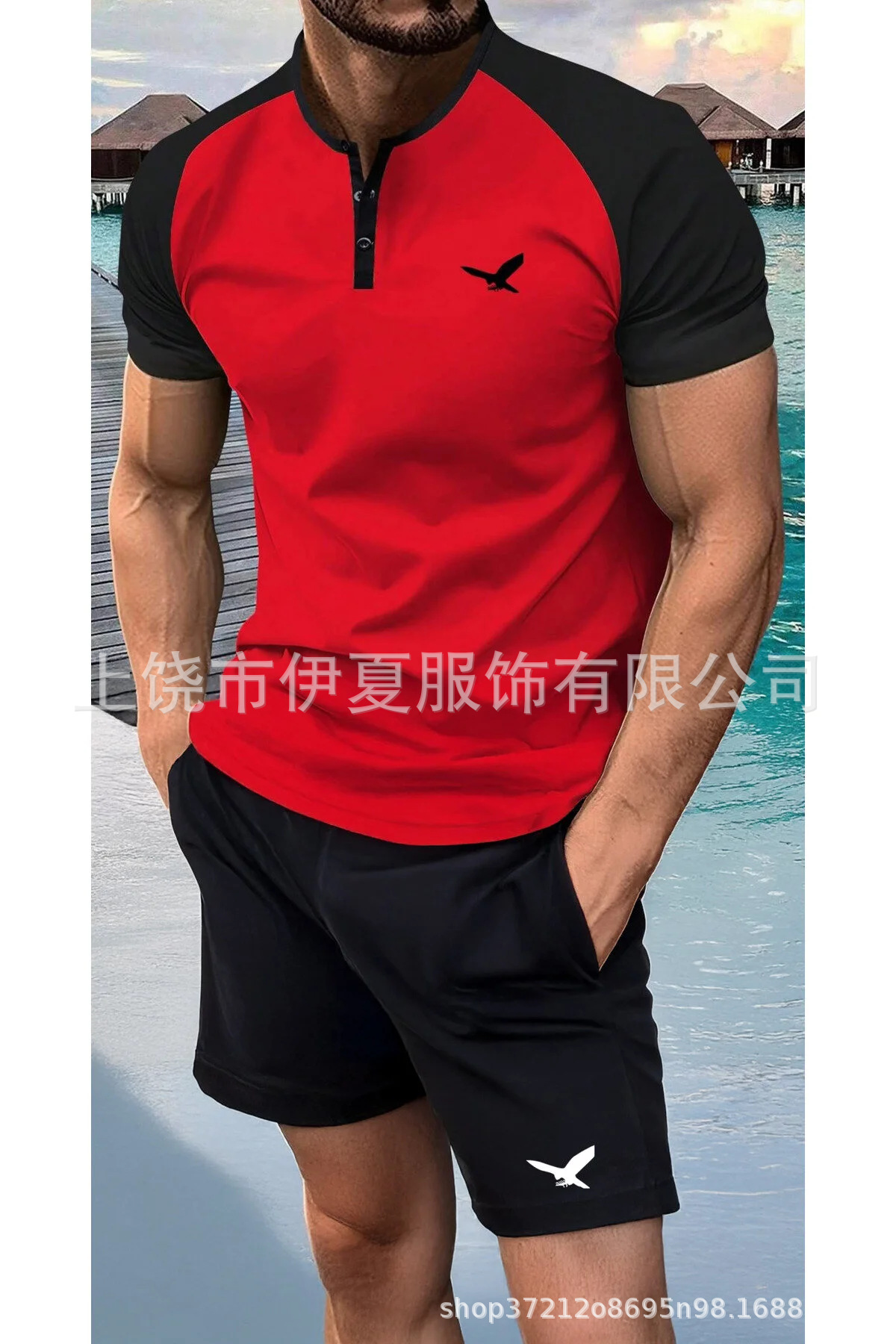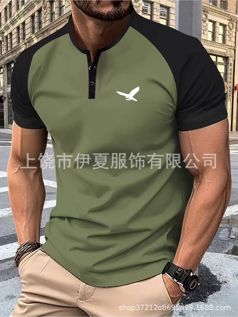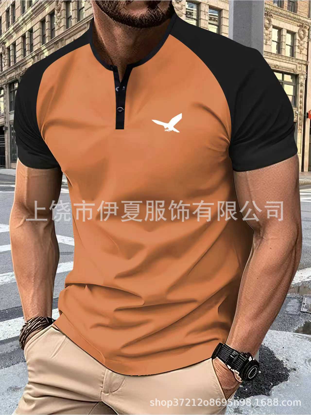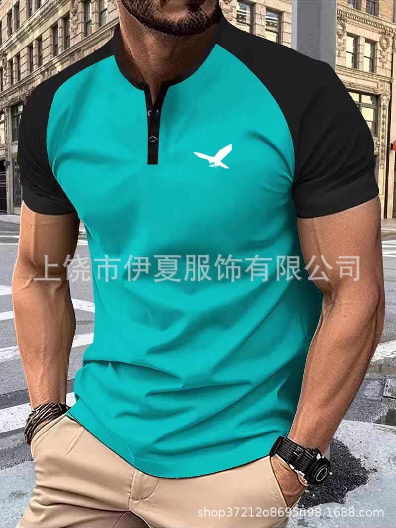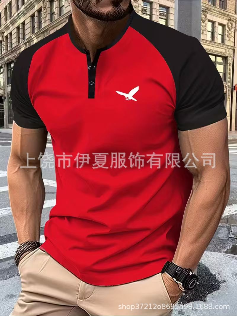 여름 남성 컬러 블록 래글런 반소매 헨리 셔츠, 싱글 브레스트 통기성 스포츠 캐주얼 탑 인 없음