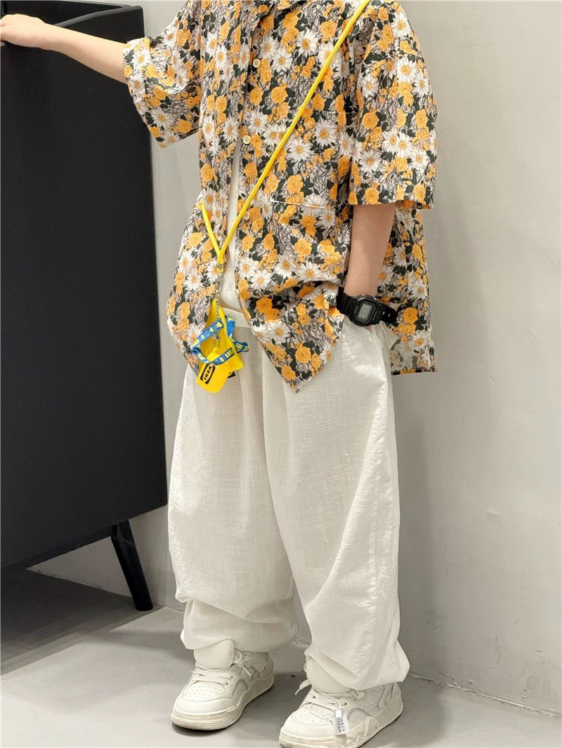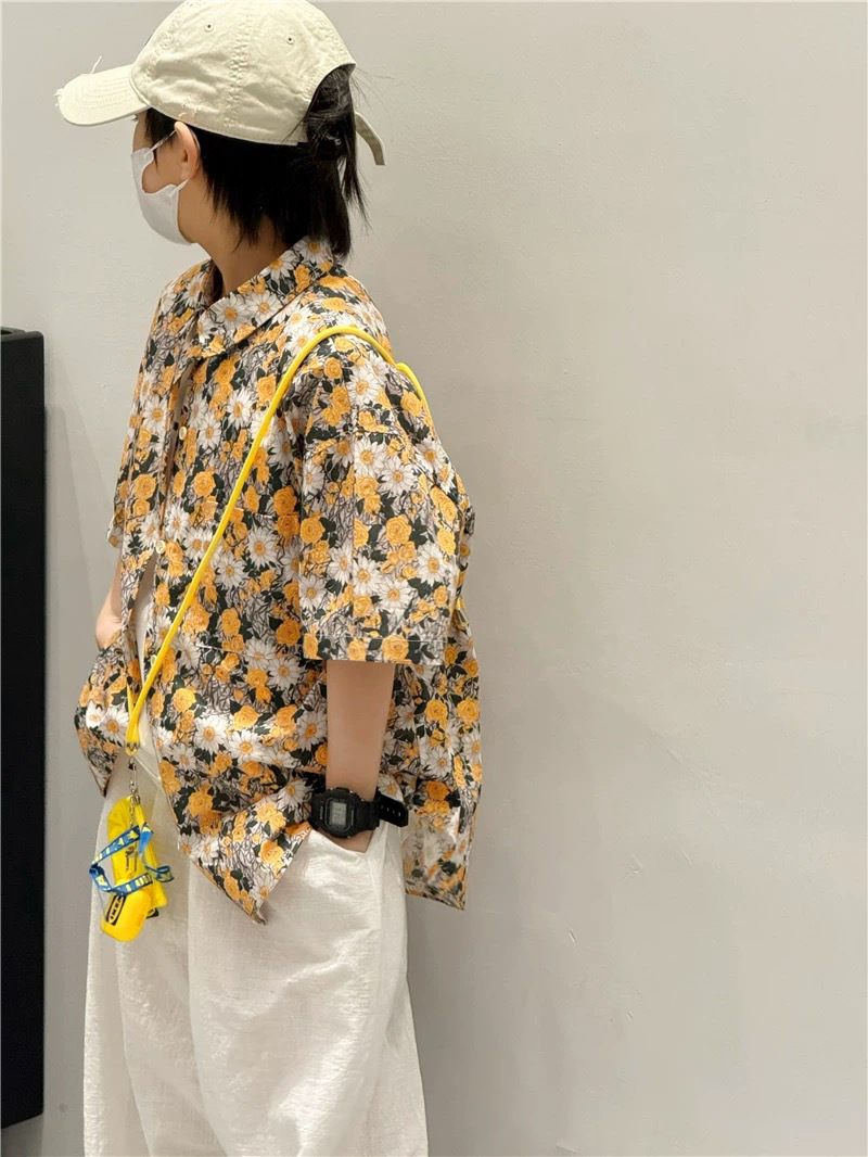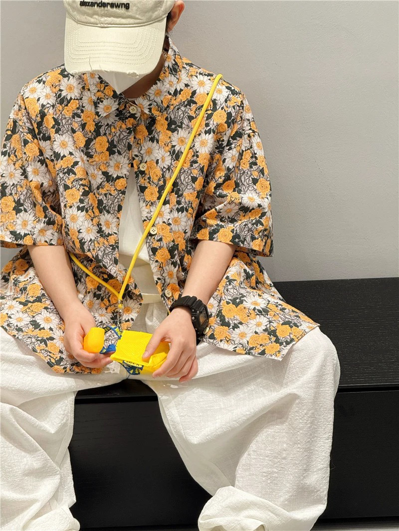 남아용 셔츠, 복고풍 어린이 홍콩 스타일 멋진 꽃무늬 셔츠, 여름 스타일, 중대형 어린이용 얇은 한국식 남아용 반팔 셔츠