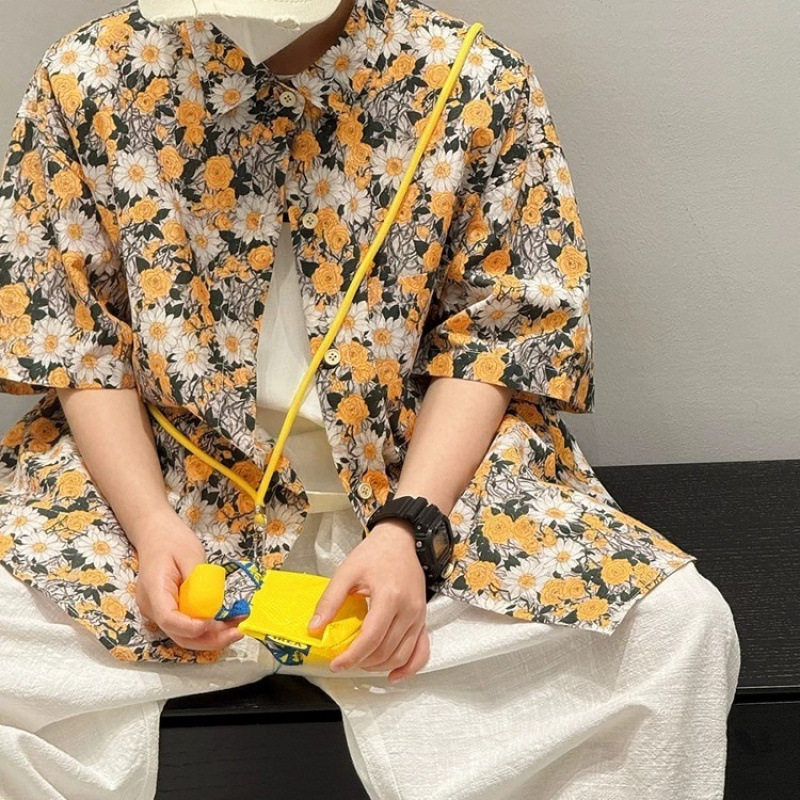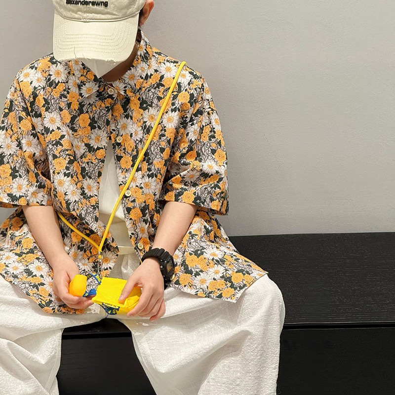 남아용 셔츠, 복고풍 어린이 홍콩 스타일 멋진 꽃무늬 셔츠, 여름 스타일, 중대형 어린이용 얇은 한국식 남아용 반팔 셔츠스토어 가기