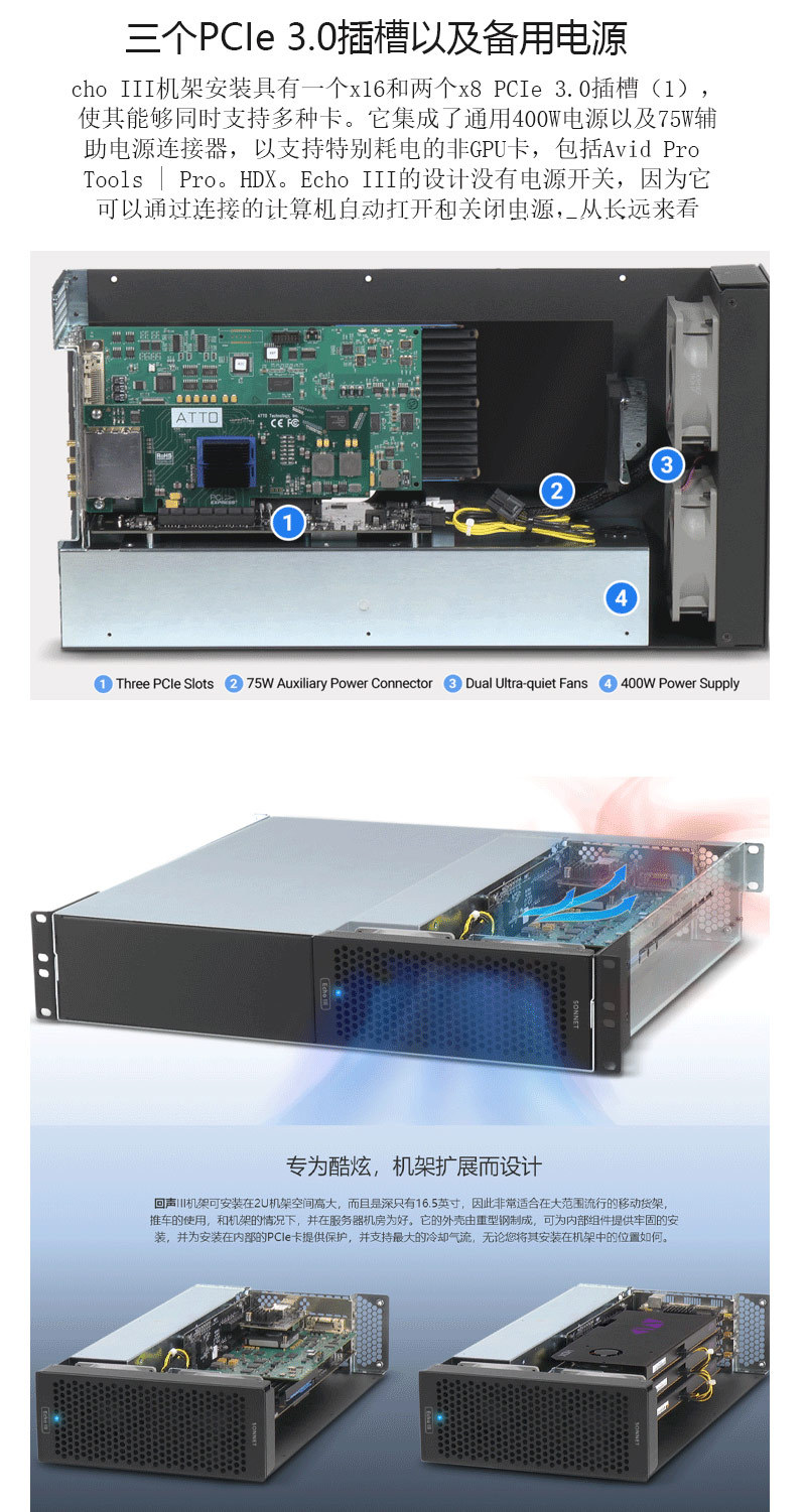 Sonnet Echo 3슬롯 랙 장착형 확장 박스는 GPU가 아닌 PCIE 확장 카드 3개를 지원합니다.