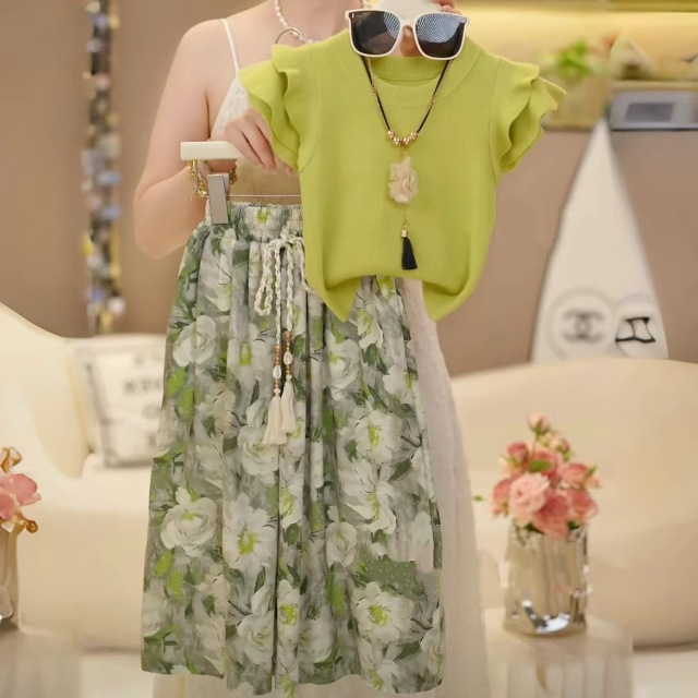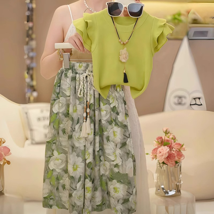 여자 여름 정장 2025 새로운 스타일 어린이 반팔 티셔츠 여름 여자 꽃 무늬 넓은 다리 바지 투피스 세트