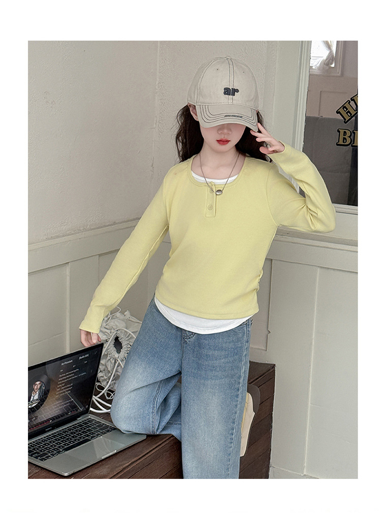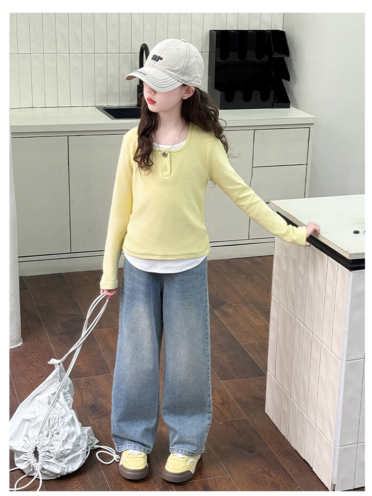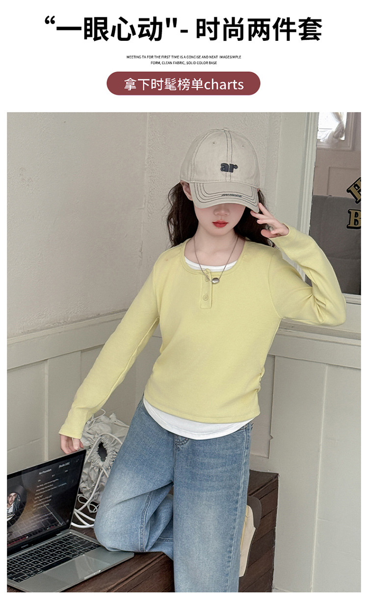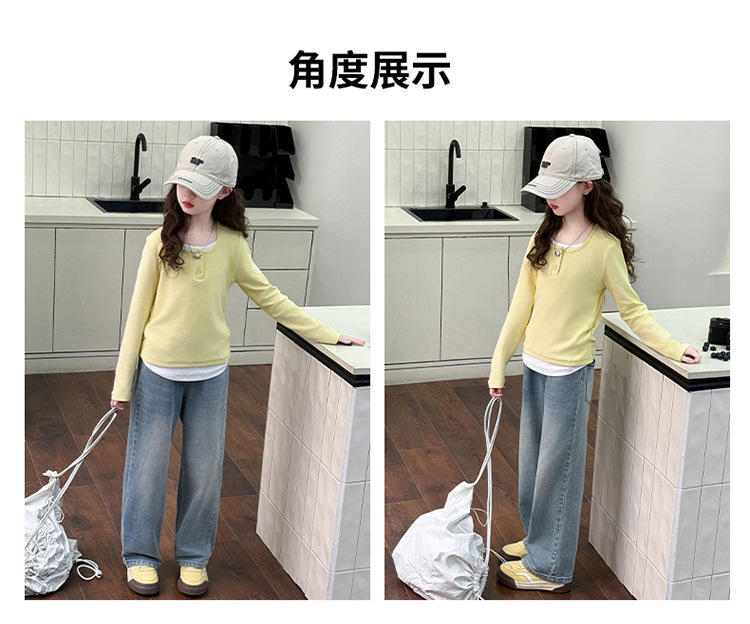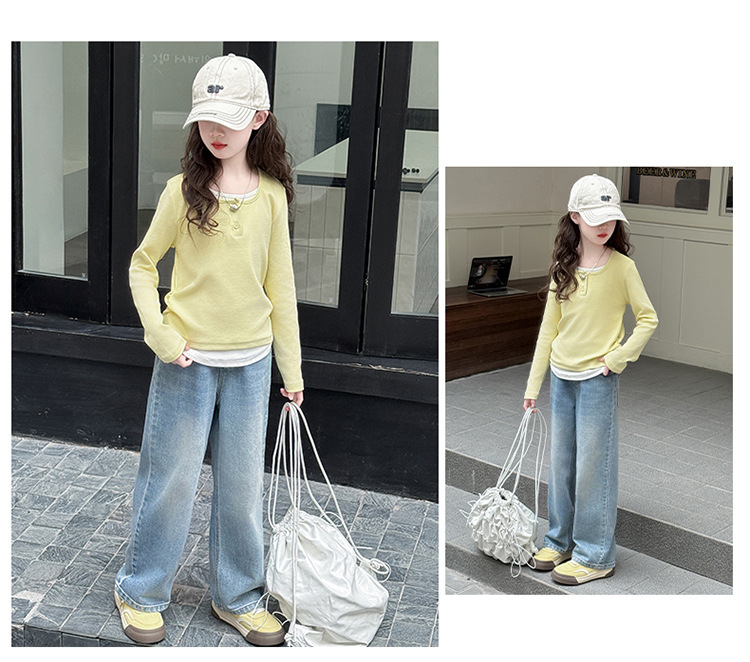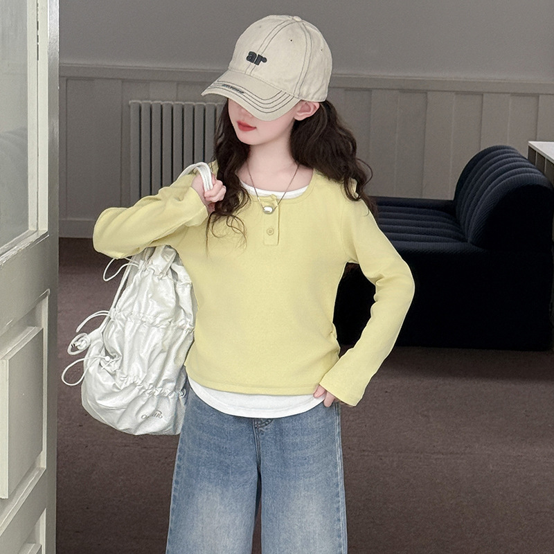 여아용 긴팔 티셔츠 2025년 봄 신상품 큰 어린이 가짜 투피스 탑 어린이 봄 스타일 슬림 바닥 셔츠