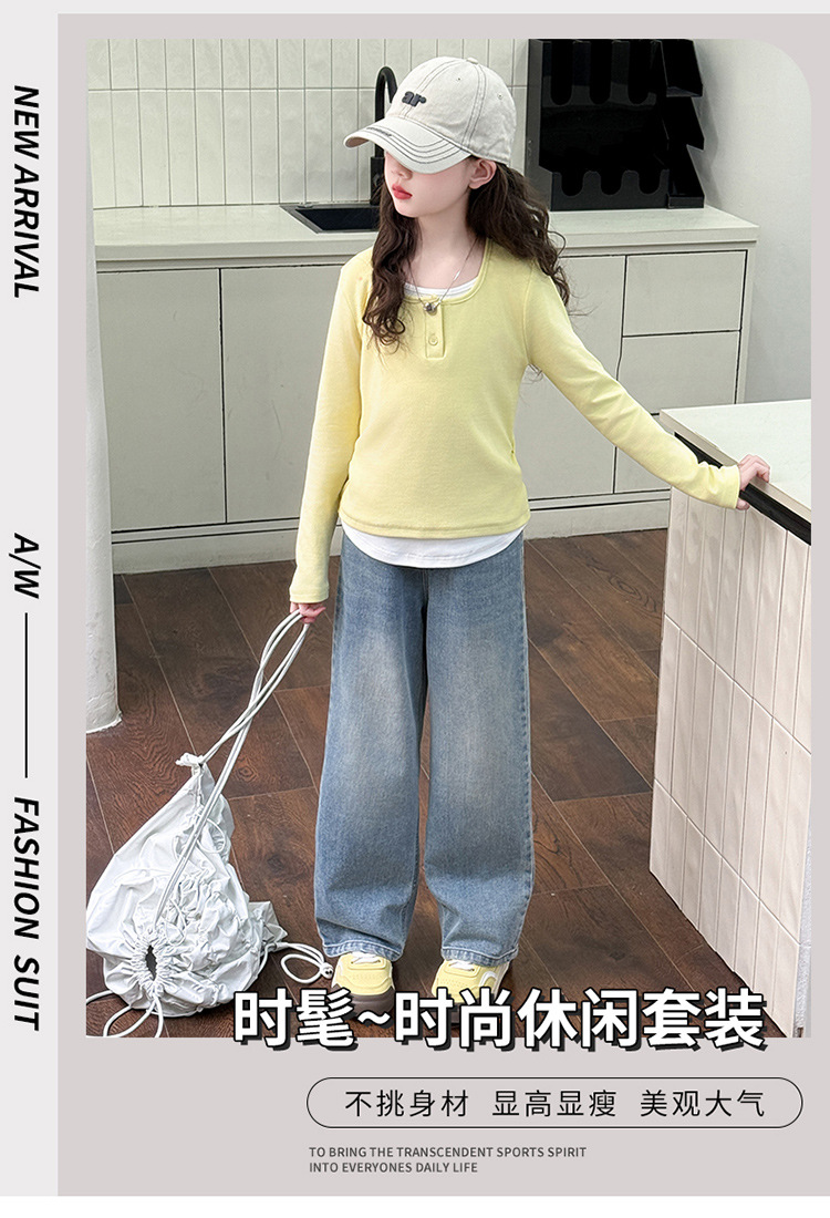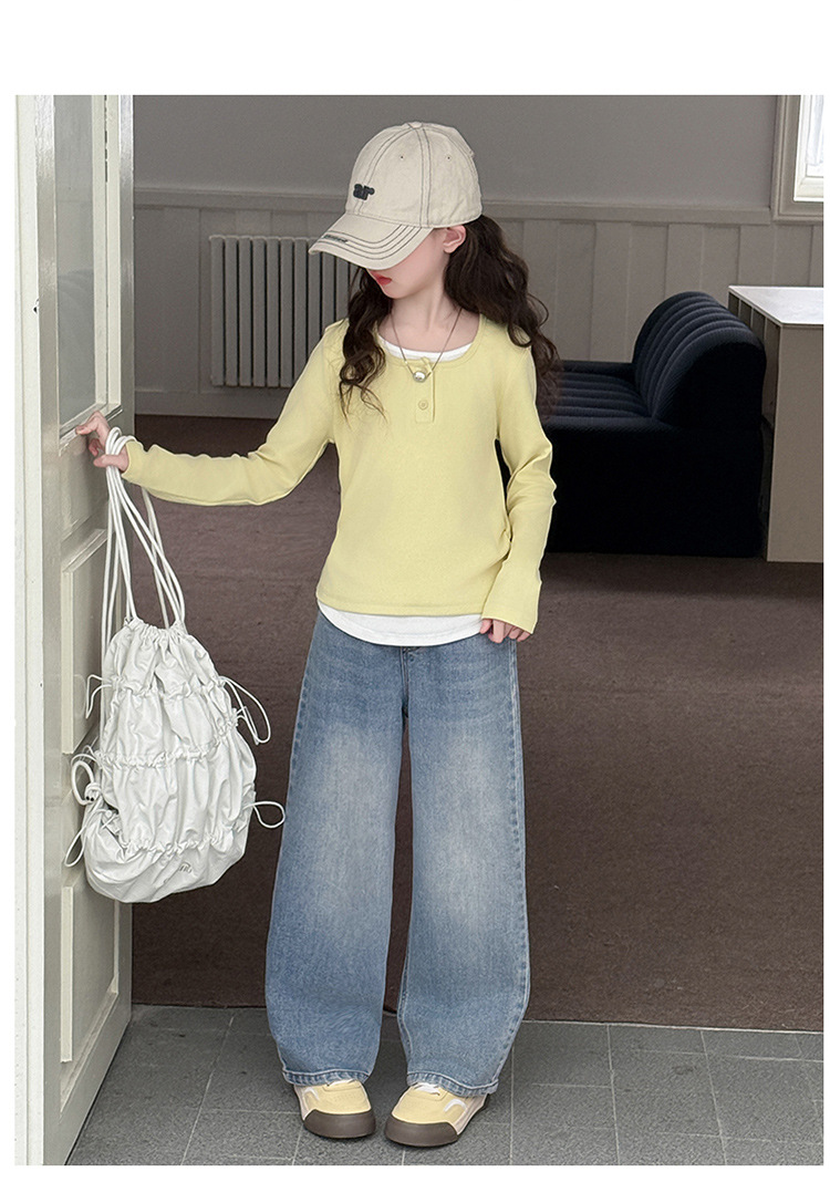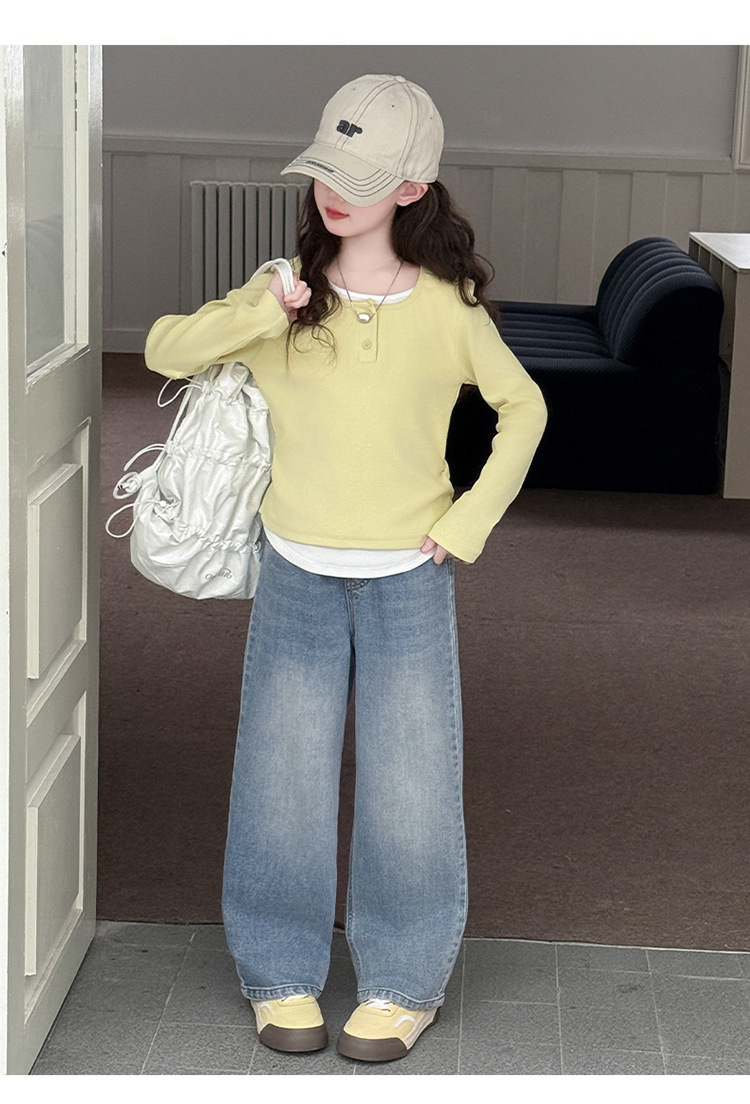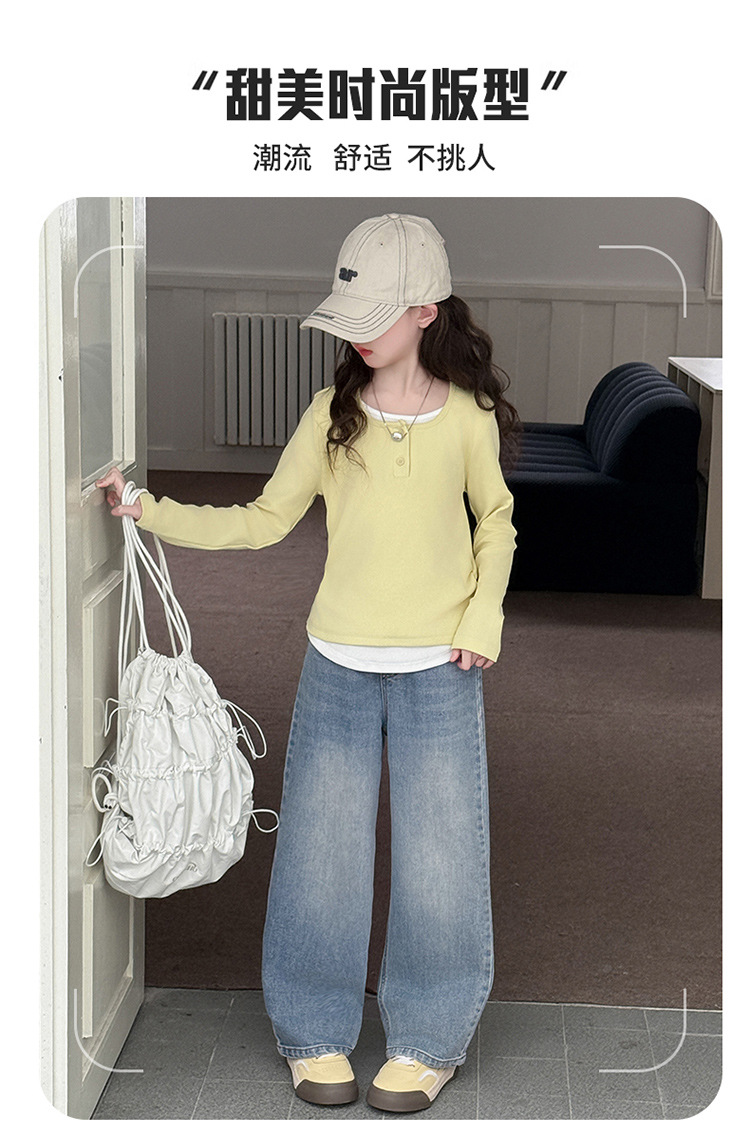 여아용 긴팔 티셔츠 2025년 봄 신상품 큰 어린이 가짜 투피스 탑 어린이 봄 스타일 슬림 바닥 셔츠