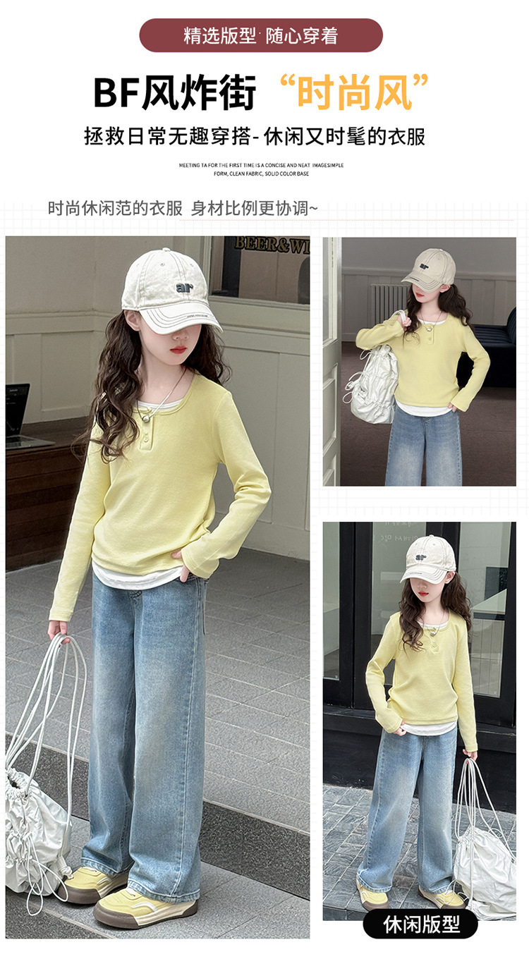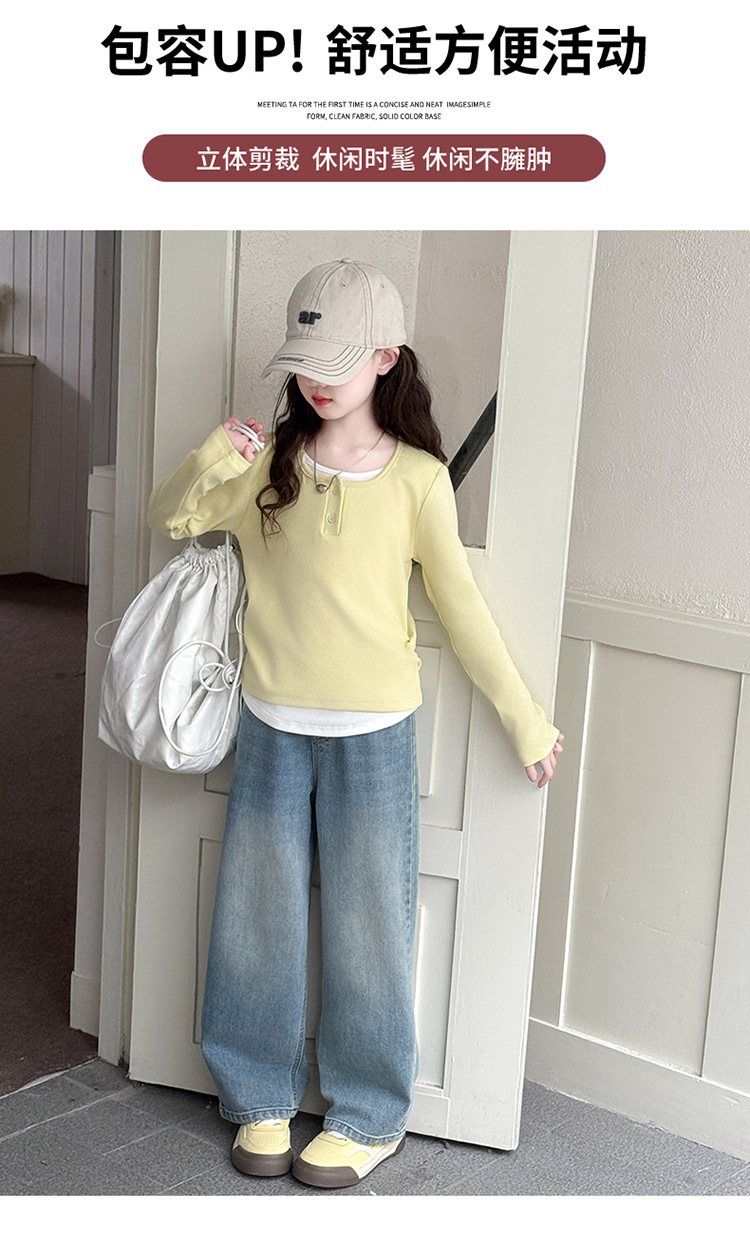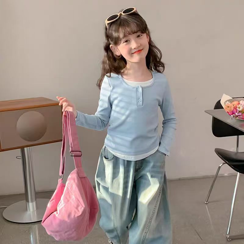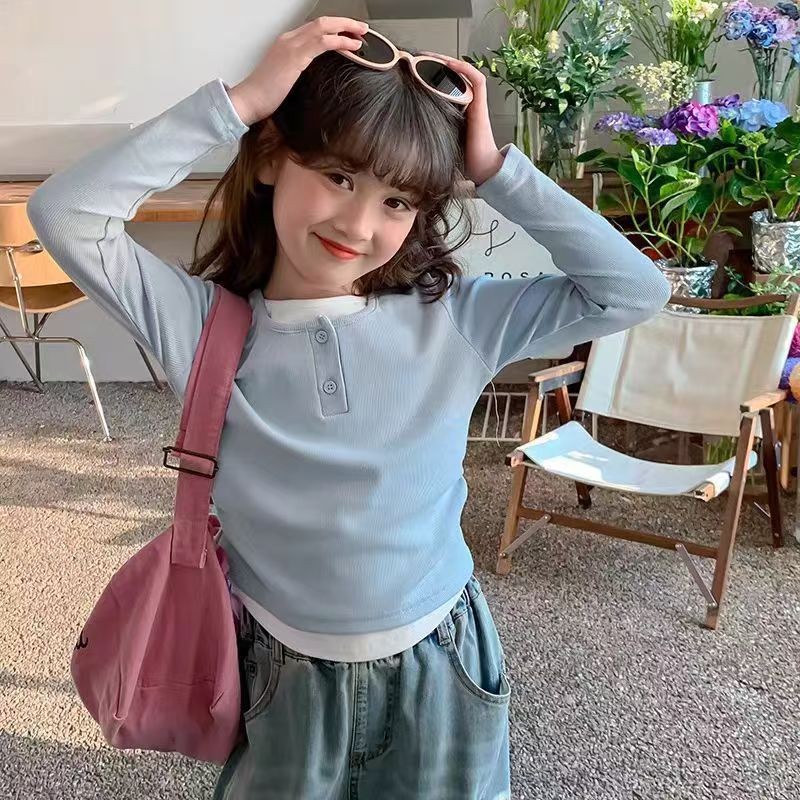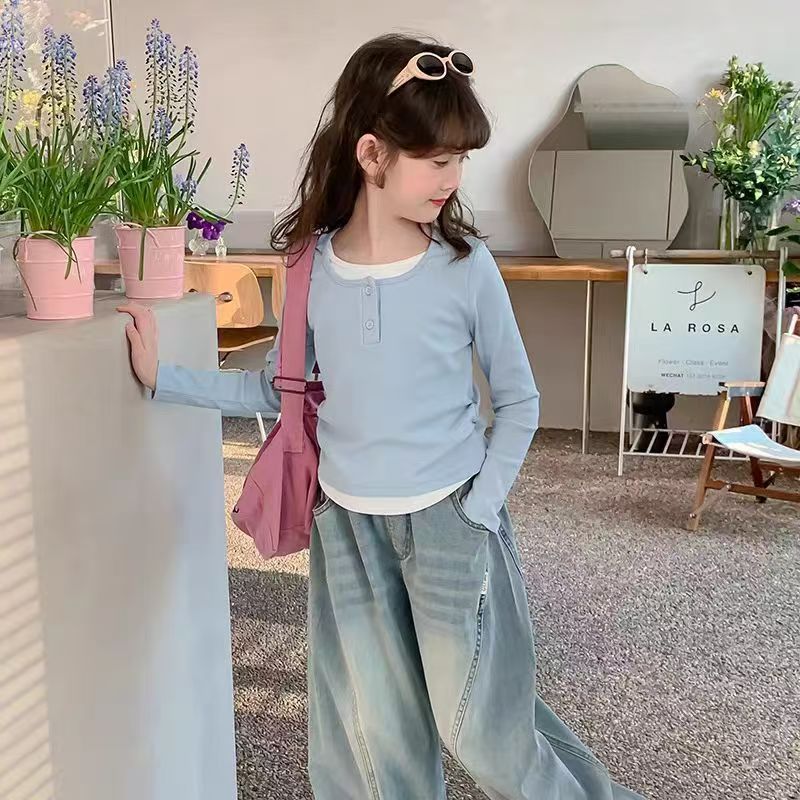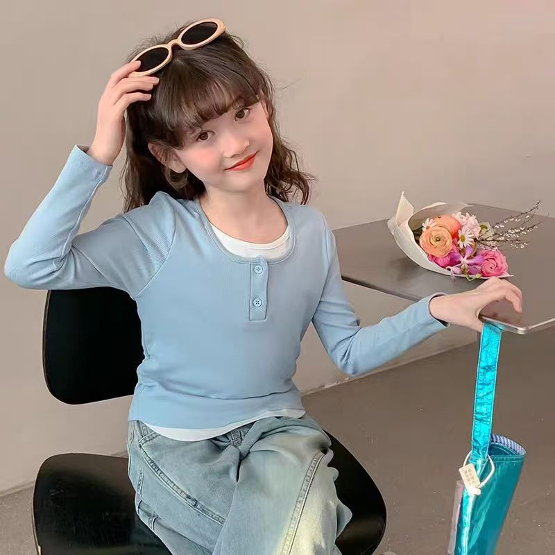 여아용 긴팔 티셔츠 2025년 봄 신상품 큰 어린이 가짜 투피스 탑 어린이 봄 스타일 슬림 바닥 셔츠스토어 가기