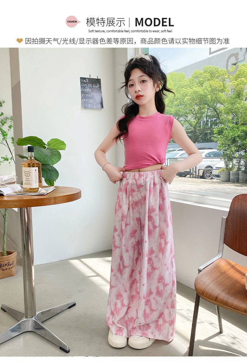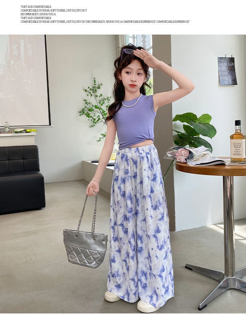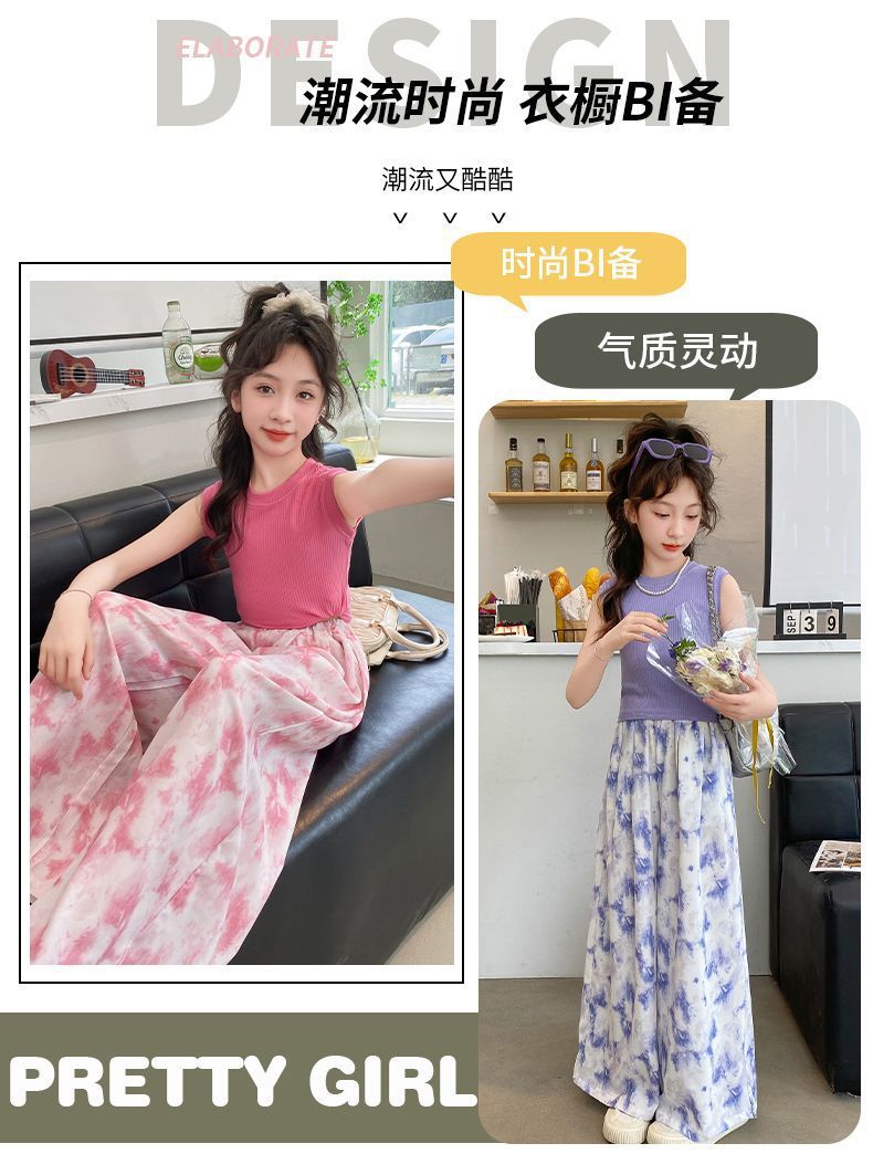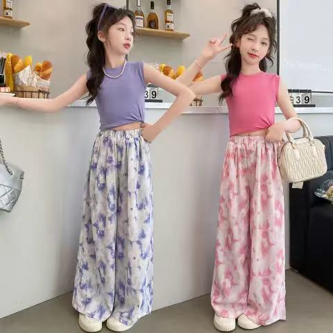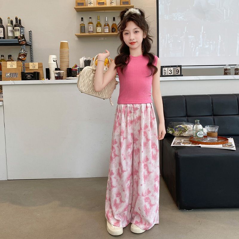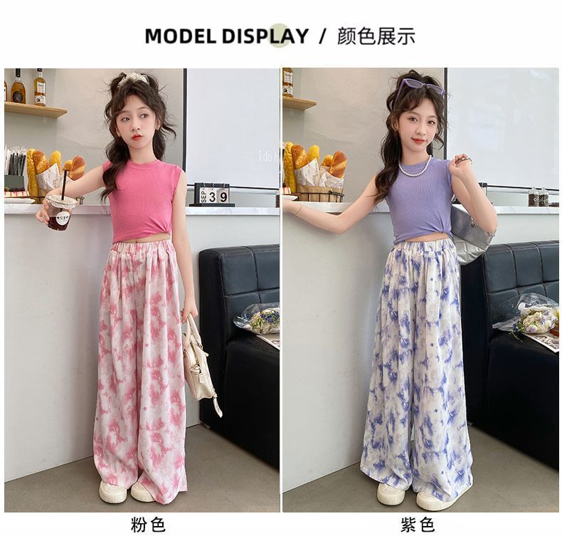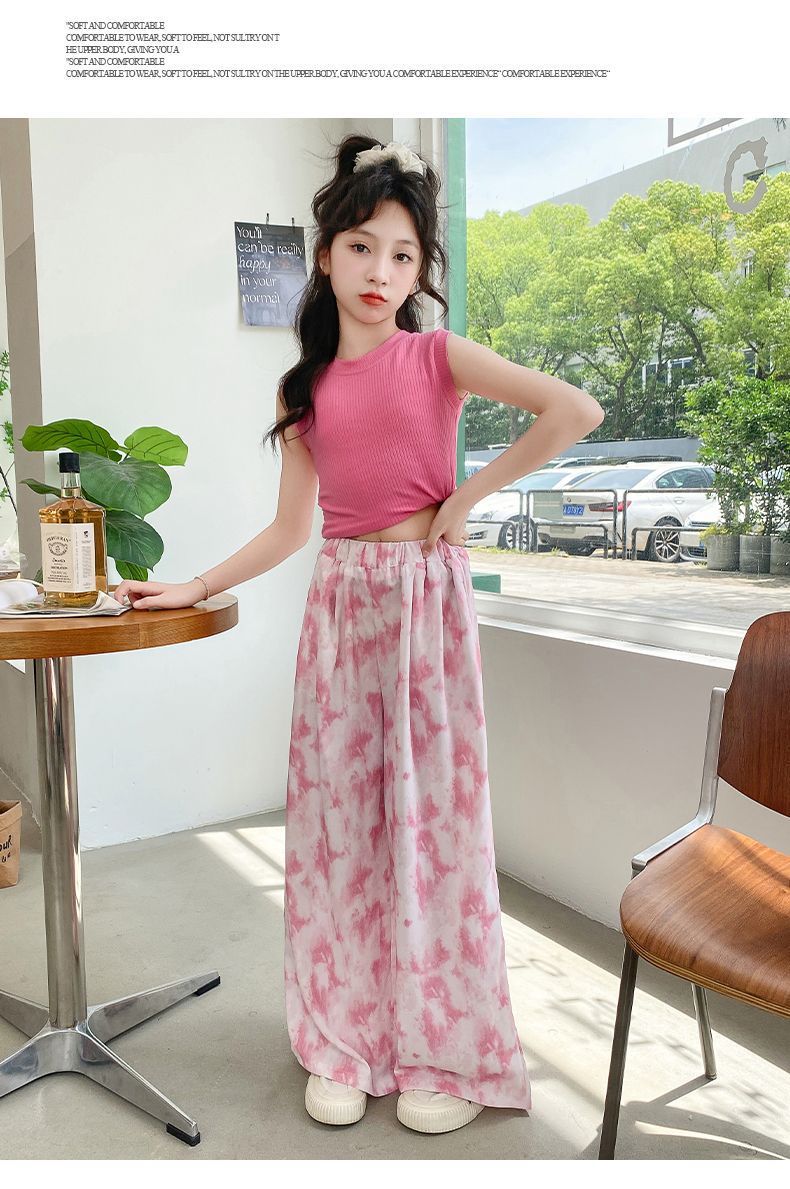 여자 여름 쉬폰 바지 정장 2025 새로운 어린이 스타일 조끼 와이드 레그 팬츠 투피스 세트 큰 어린이 여름 의류 트렌드스토어 가기