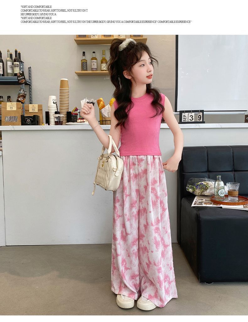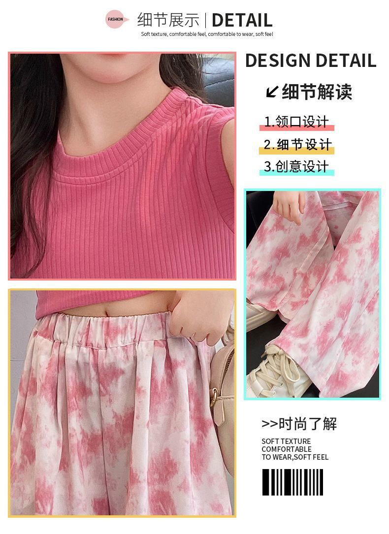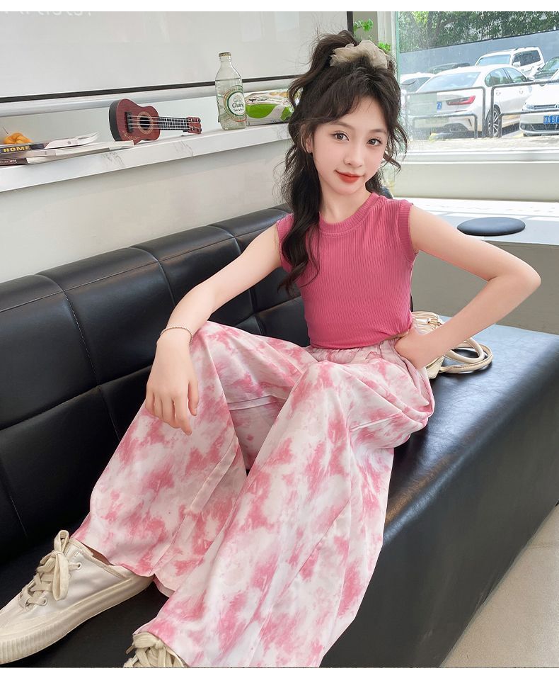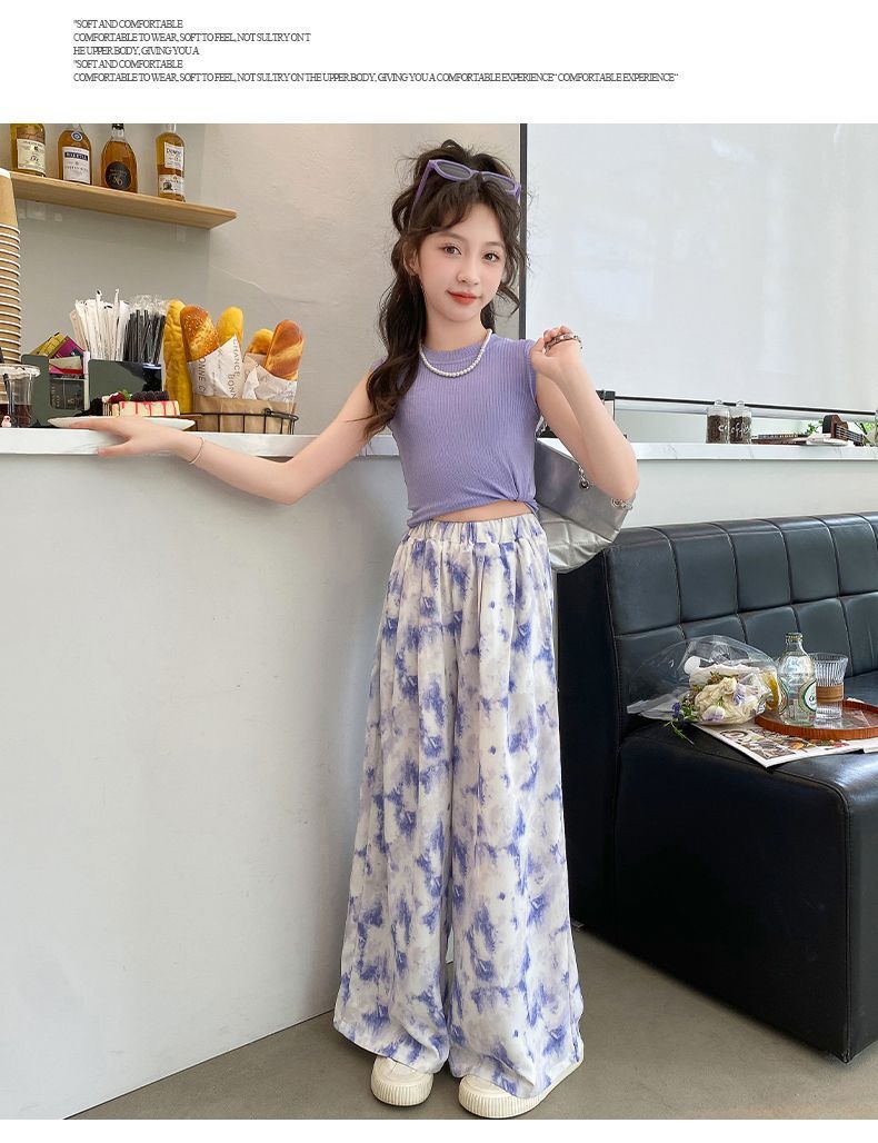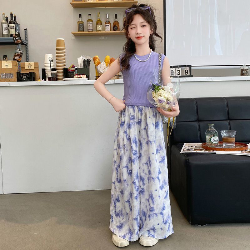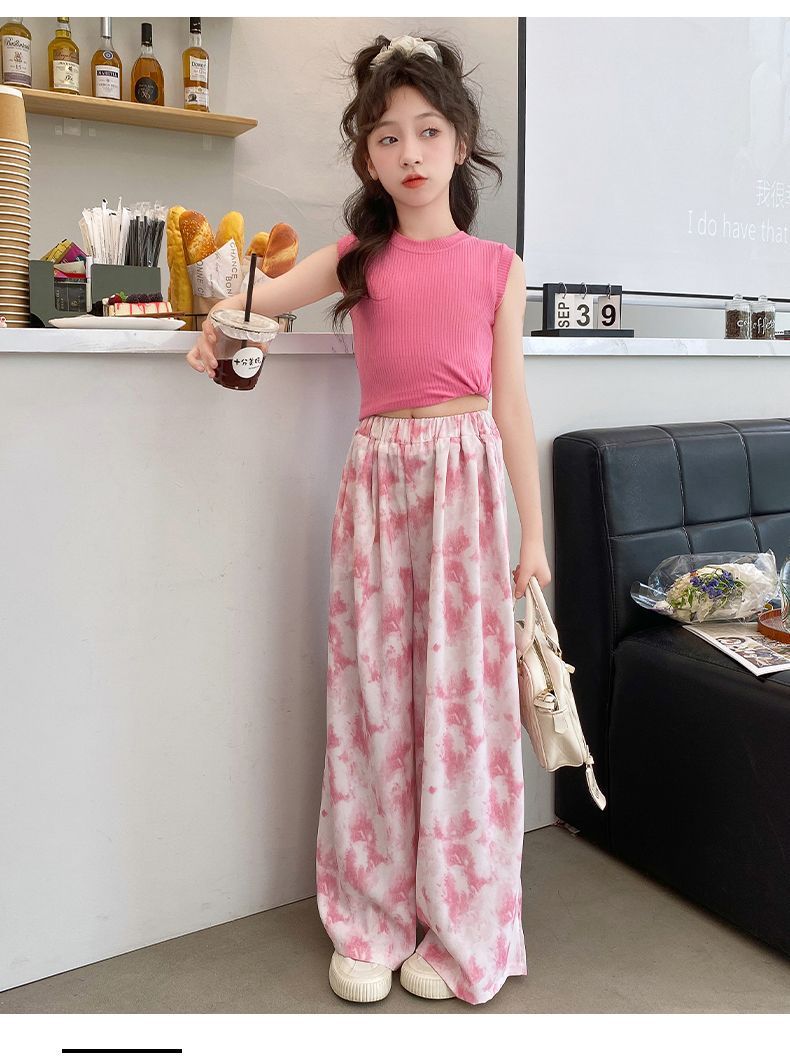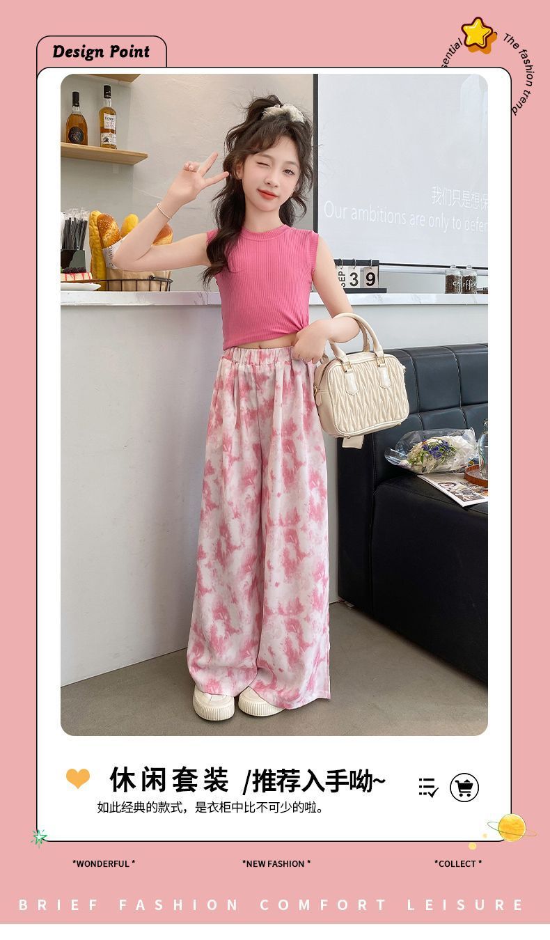 여자 여름 쉬폰 바지 정장 2025 새로운 어린이 스타일 조끼 와이드 레그 팬츠 투피스 세트 큰 어린이 여름 의류 트렌드스토어 가기