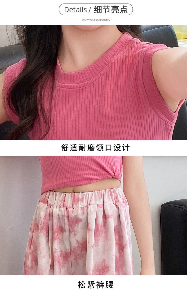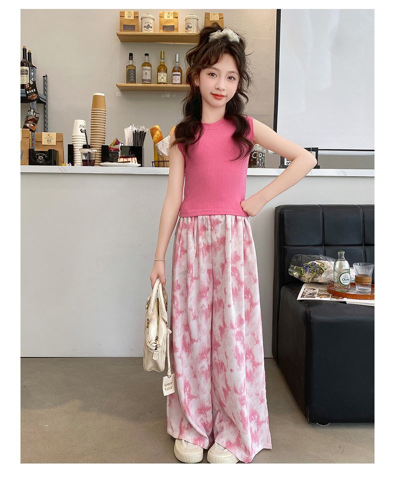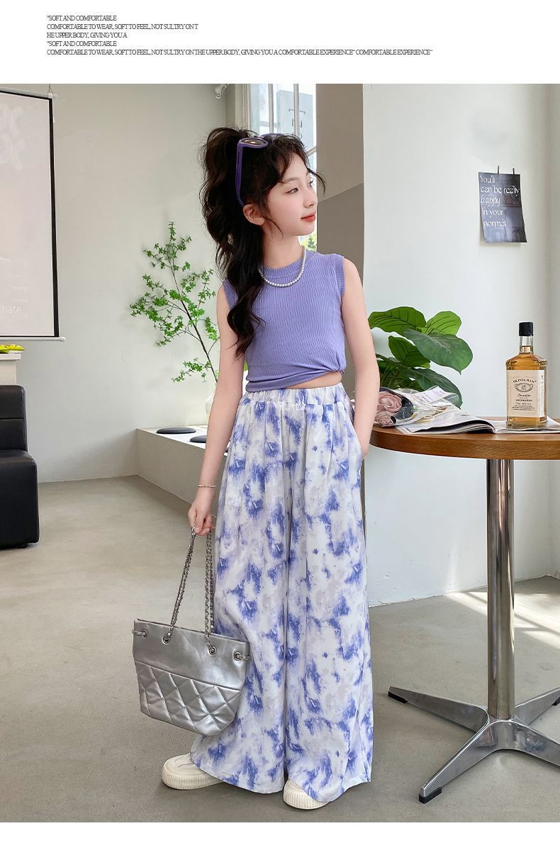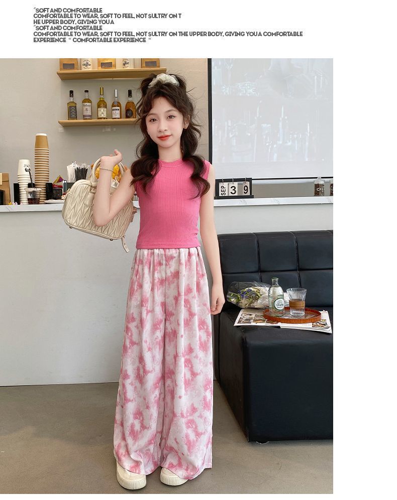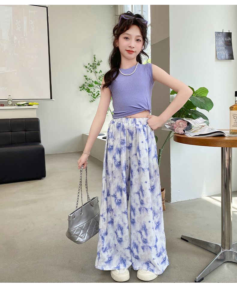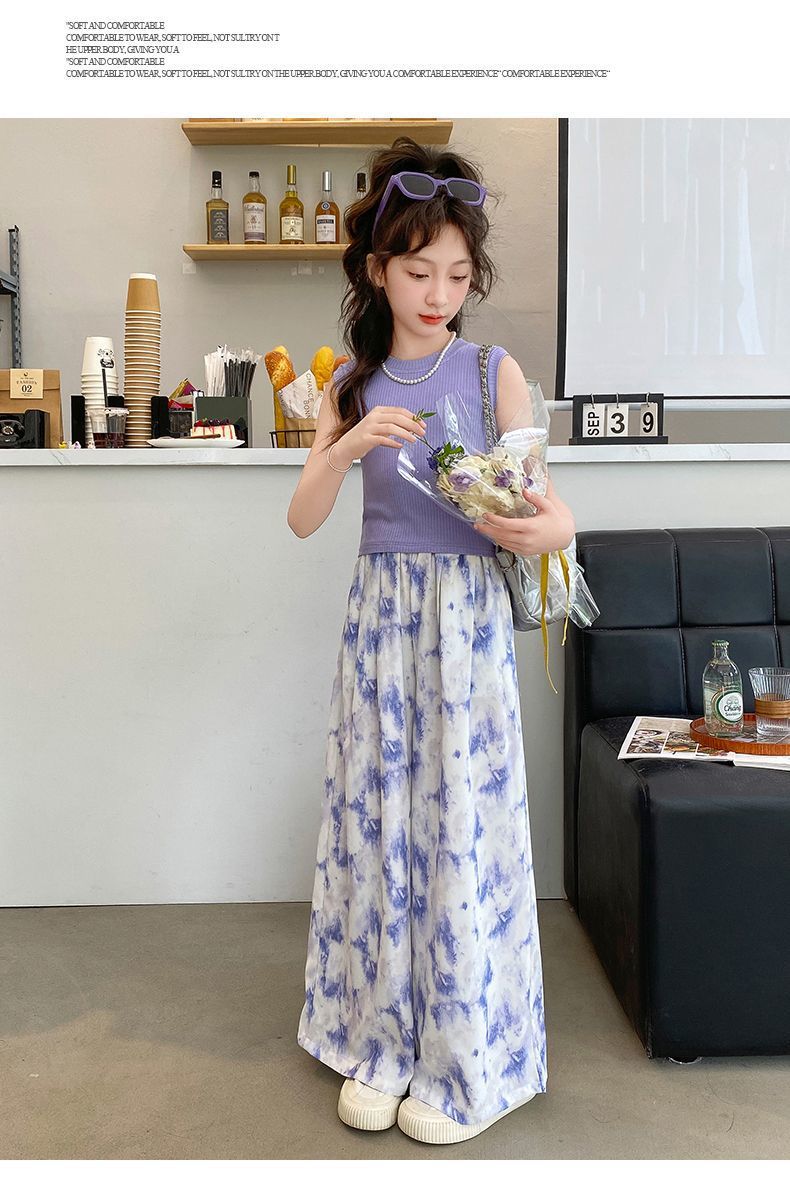 여자 여름 쉬폰 바지 정장 2025 새로운 어린이 스타일 조끼 와이드 레그 팬츠 투피스 세트 큰 어린이 여름 의류 트렌드스토어 가기