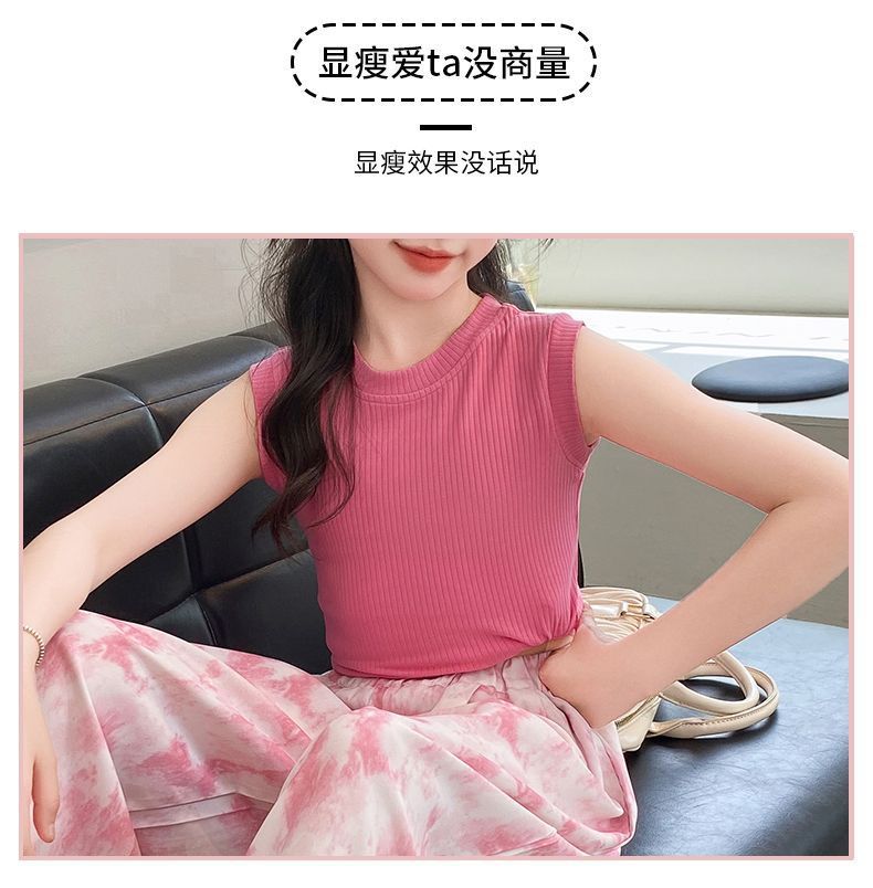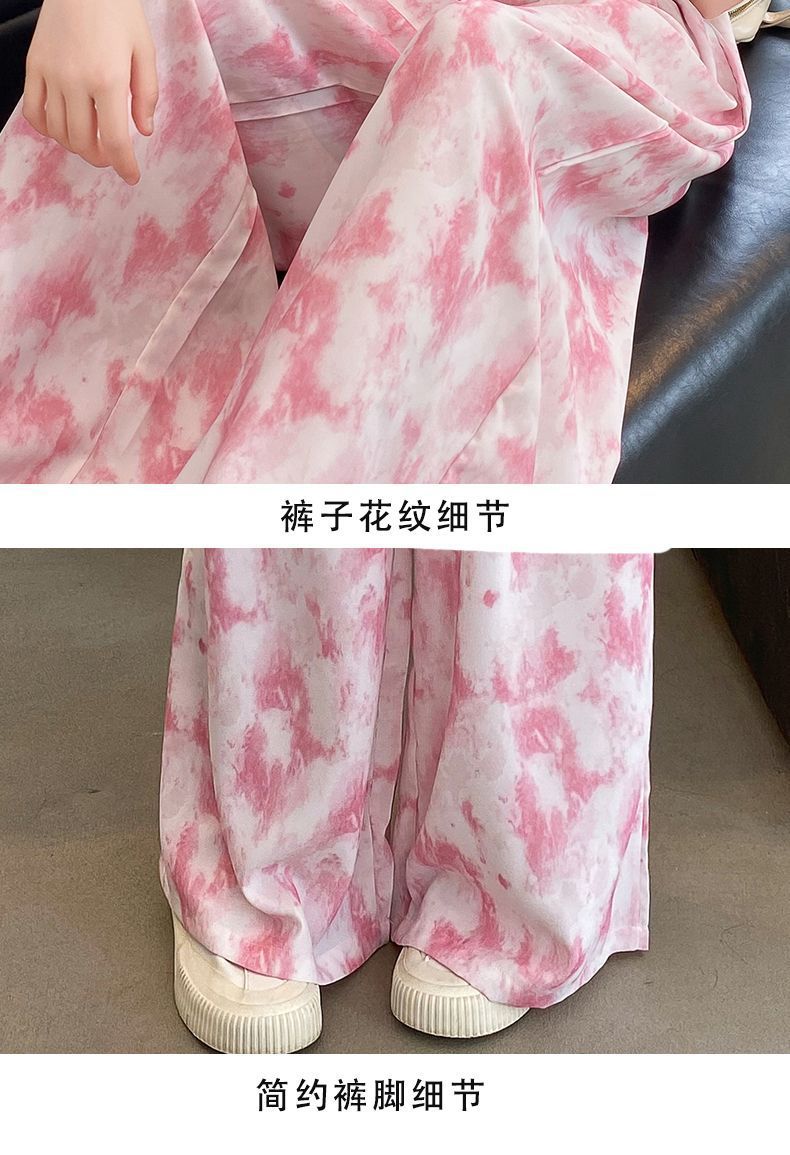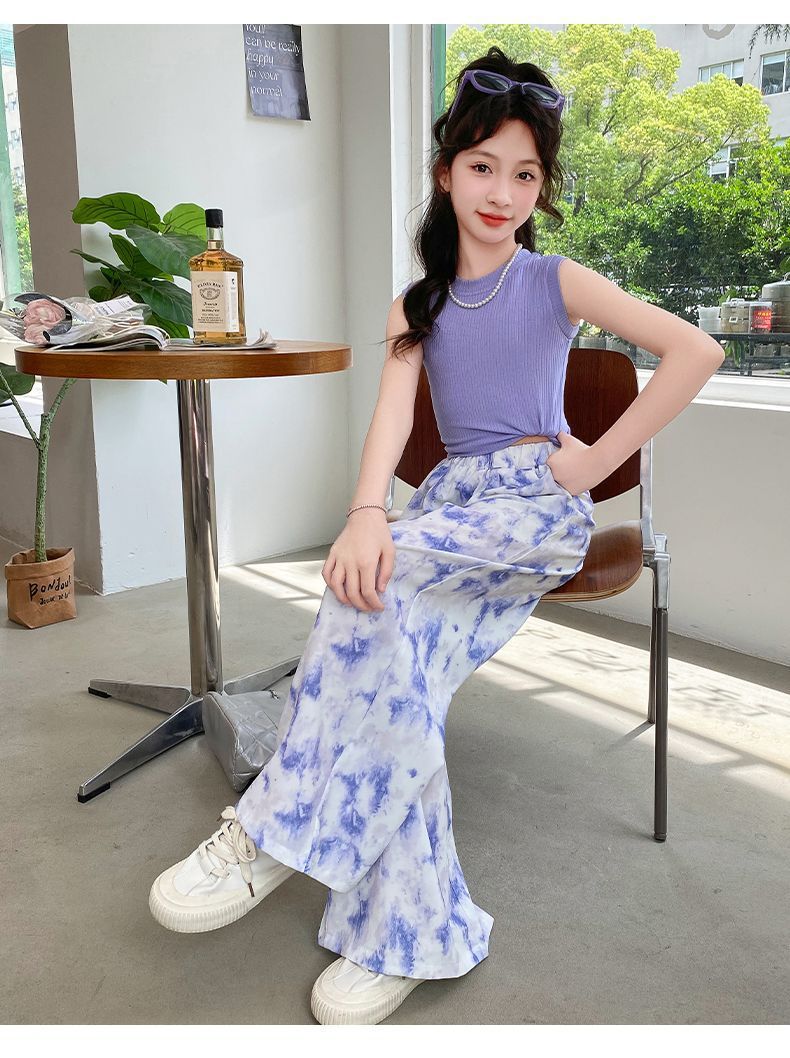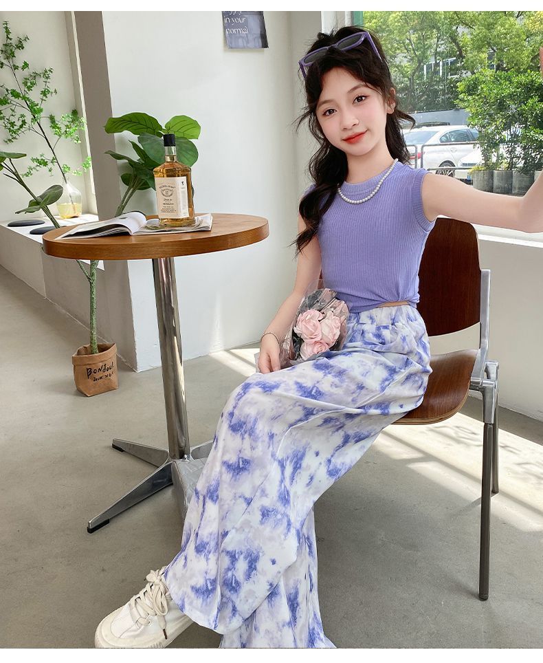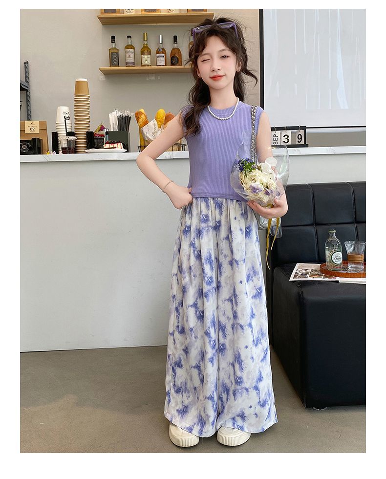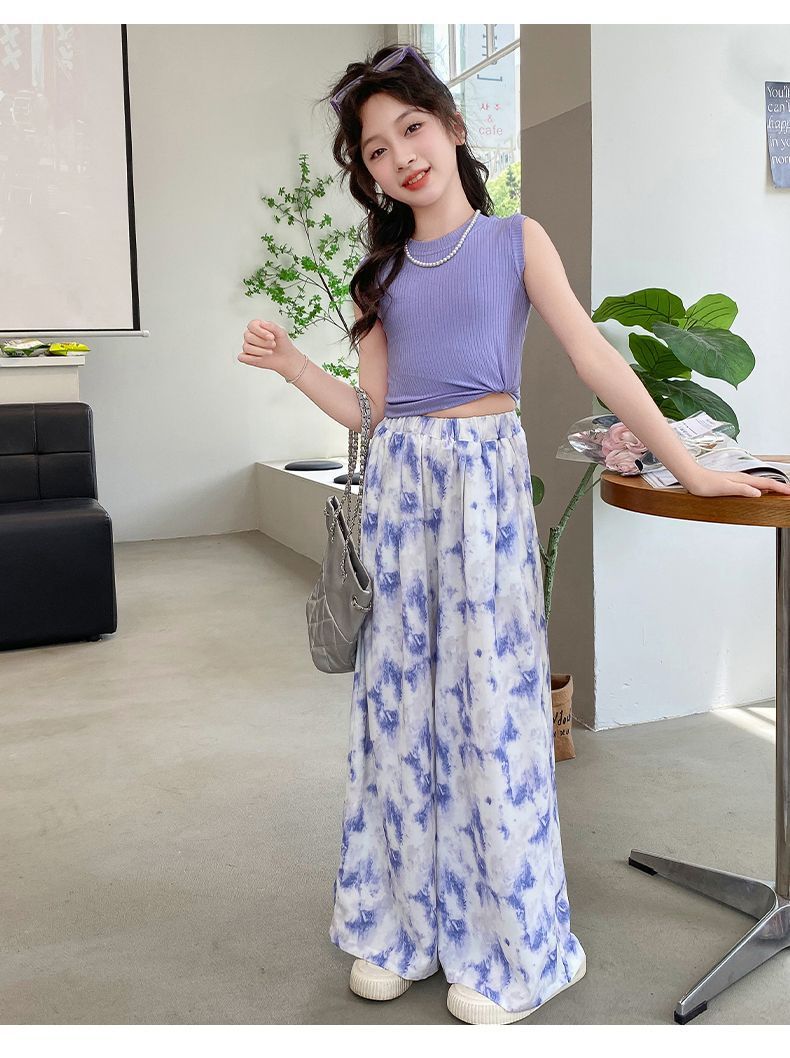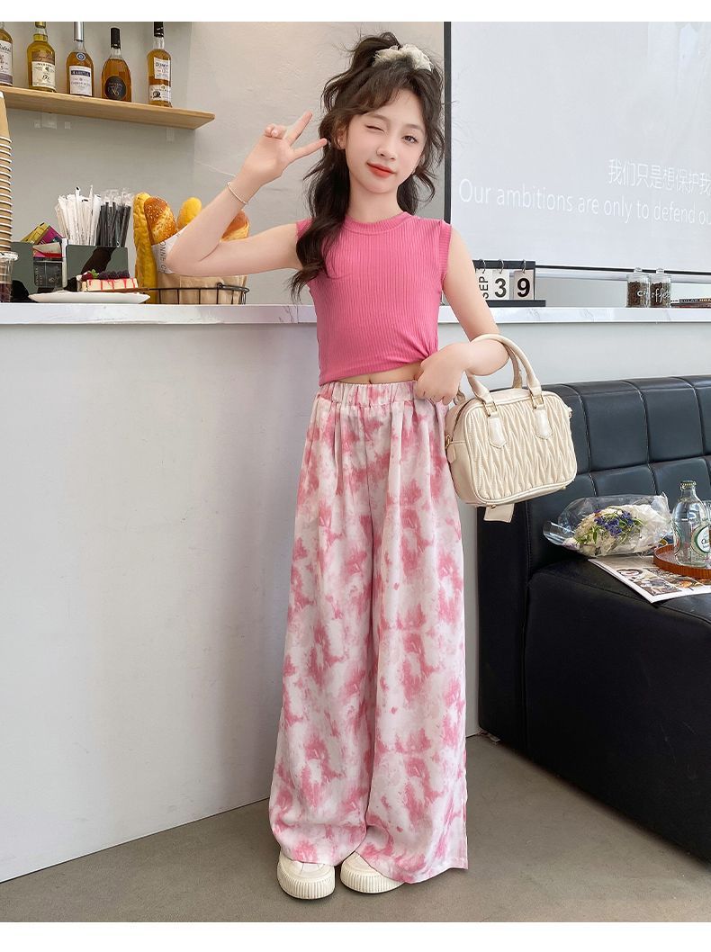 여자 여름 쉬폰 바지 정장 2025 새로운 어린이 스타일 조끼 와이드 레그 팬츠 투피스 세트 큰 어린이 여름 의류 트렌드스토어 가기