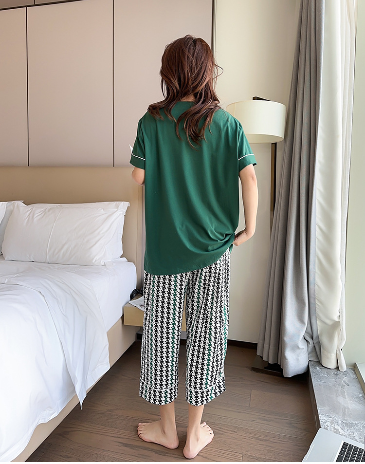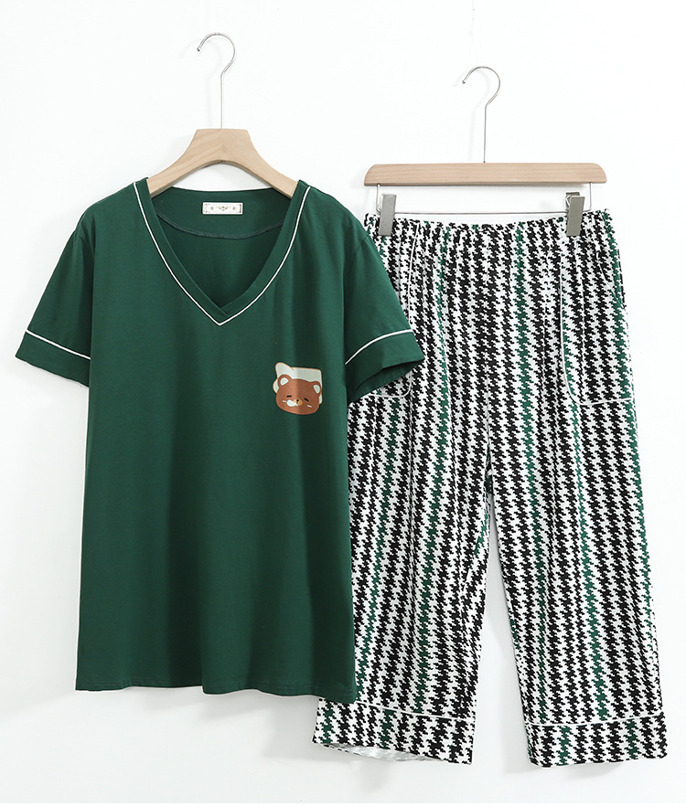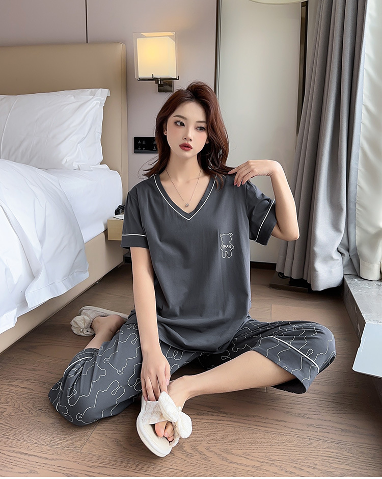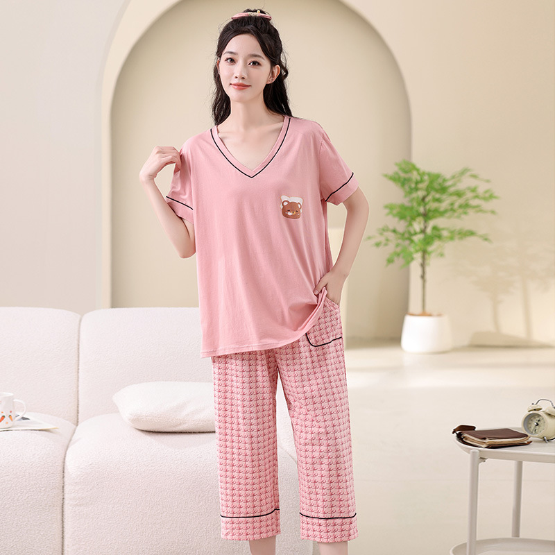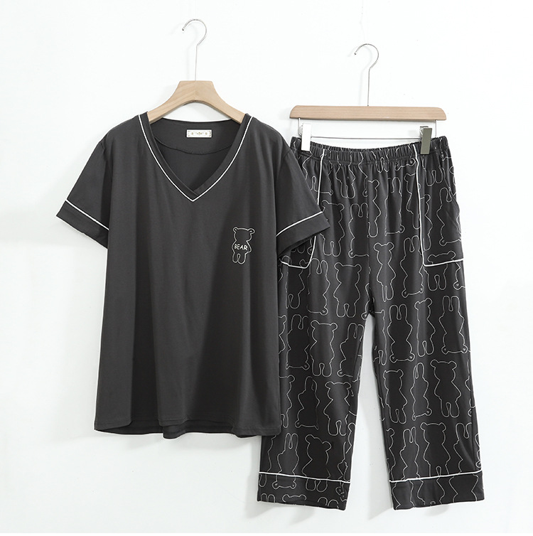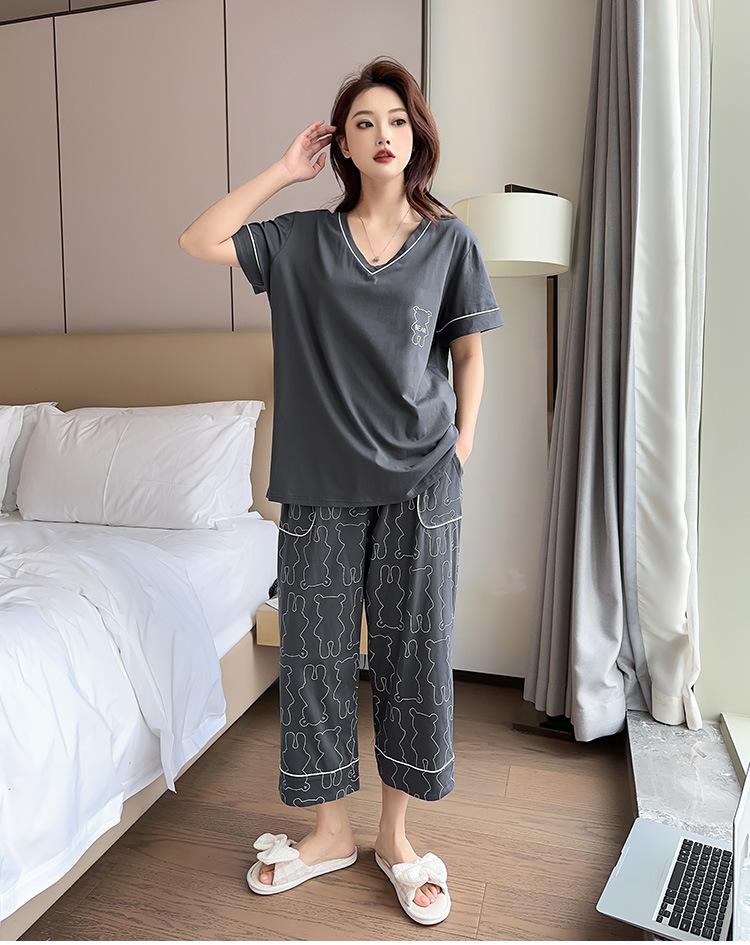봄과 여름 플러스 사이즈 홈웨어 여성 만화 잠옷 반팔 크롭 팬츠 얇은 투피스 세트 루즈 프린트 투피스 세트스토어 가기