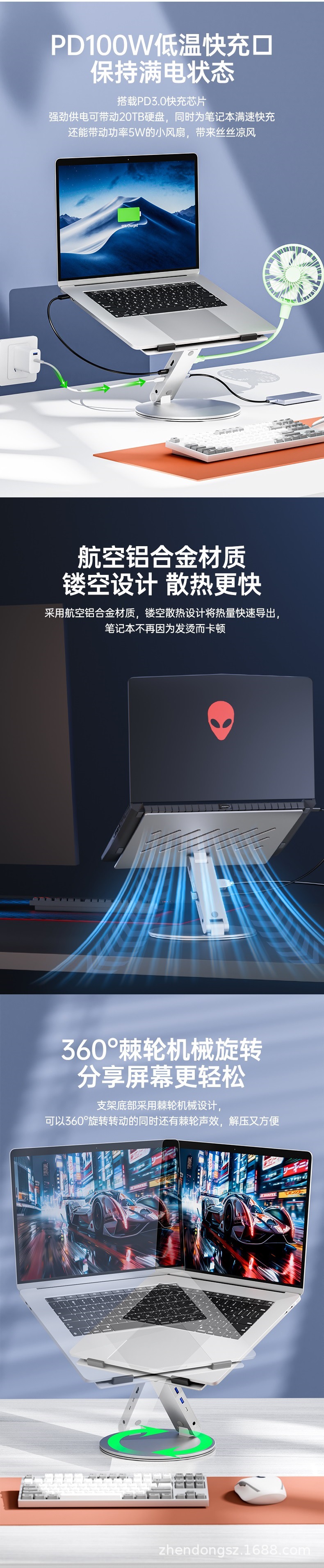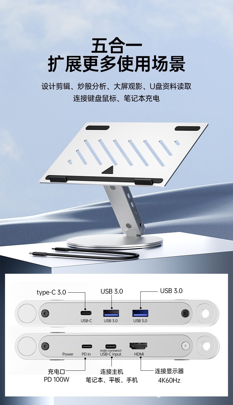 새로운 알루미늄 합금 노트북 스탠드 다기능 6-in-1 도킹 스테이션 회전식 높이 조절 냉각 브래킷