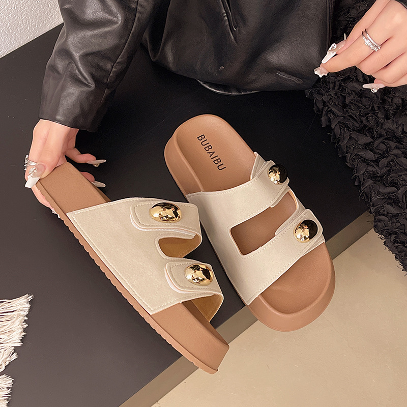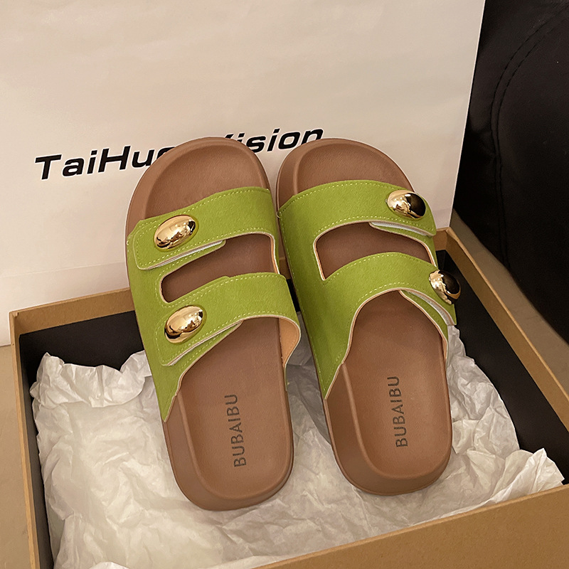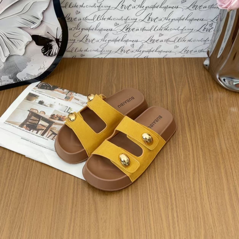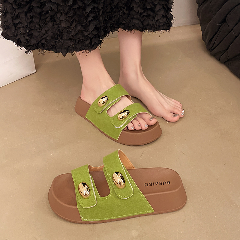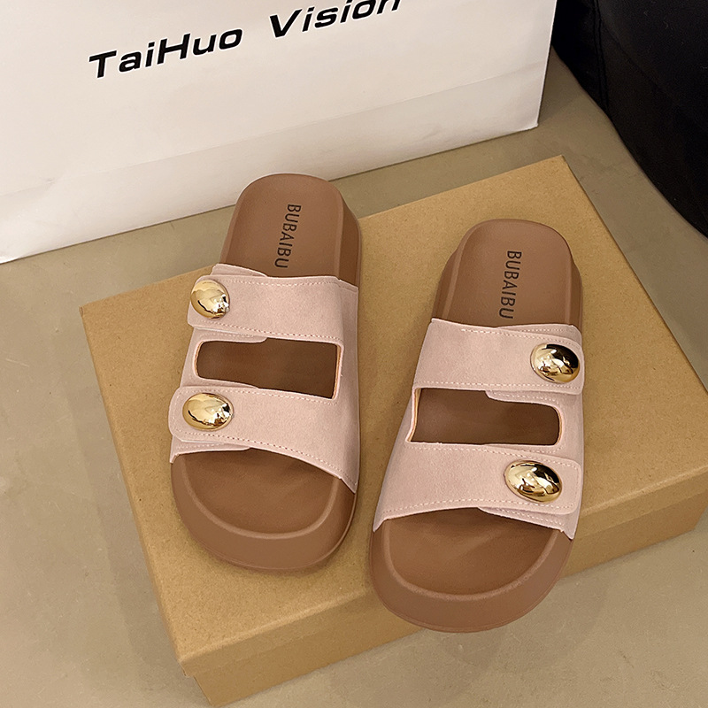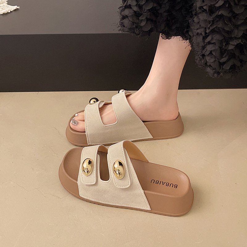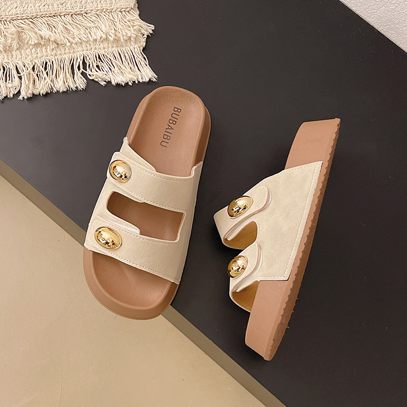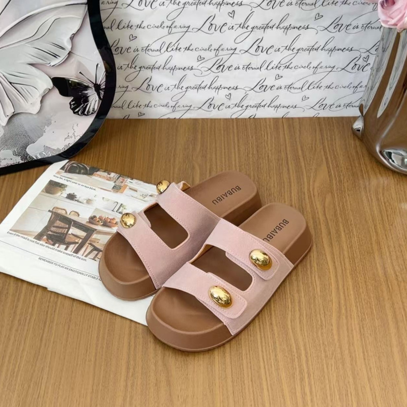 2025 새로운 여름 더블 스트랩 Boken 신발 간단한 골드 콩 장식 샌들 해변 비치 슬리퍼 여성을위한 도매스토어 가기