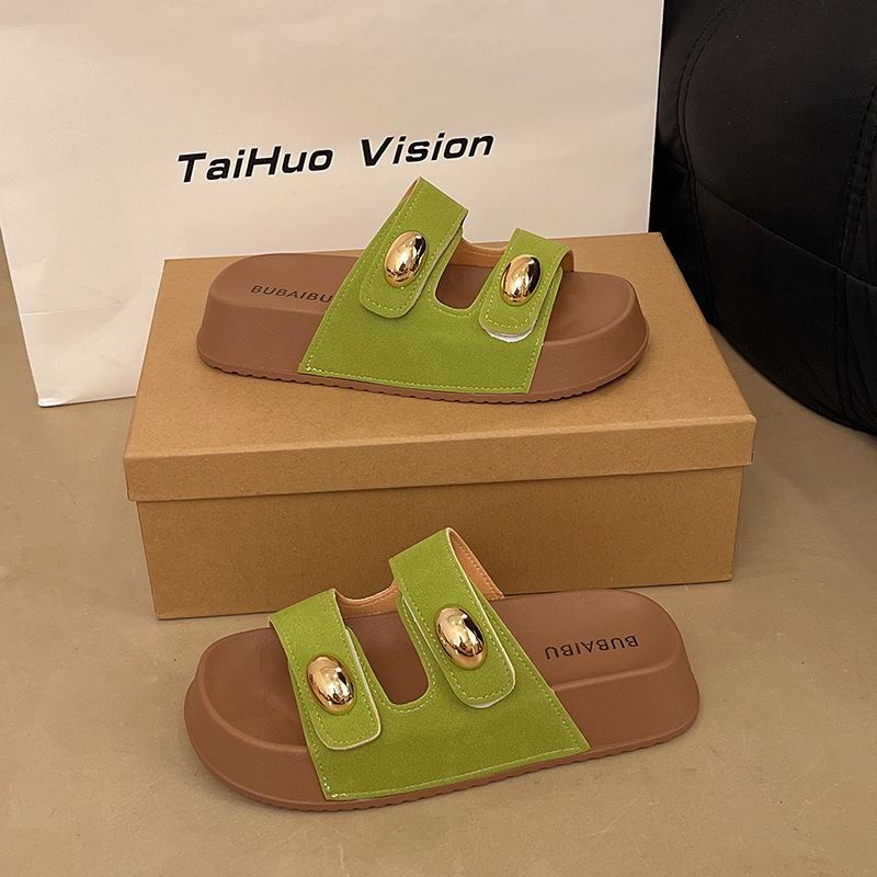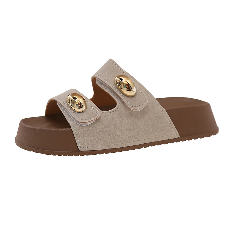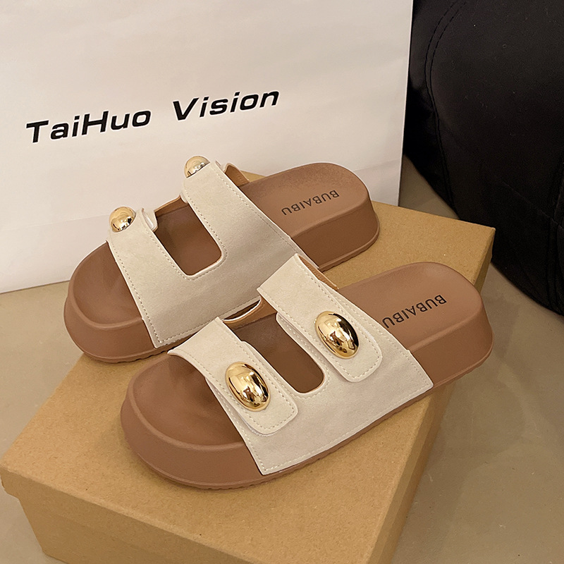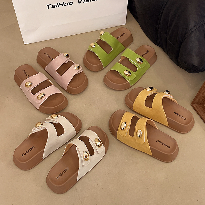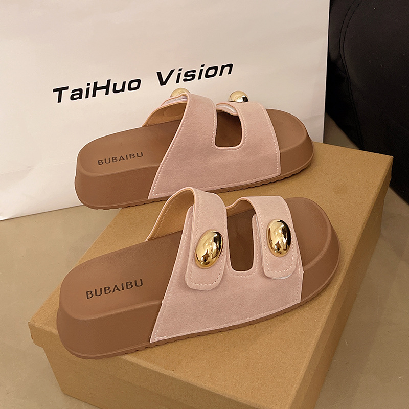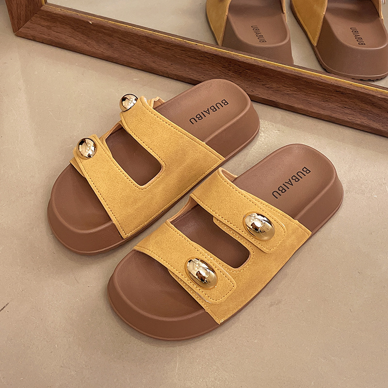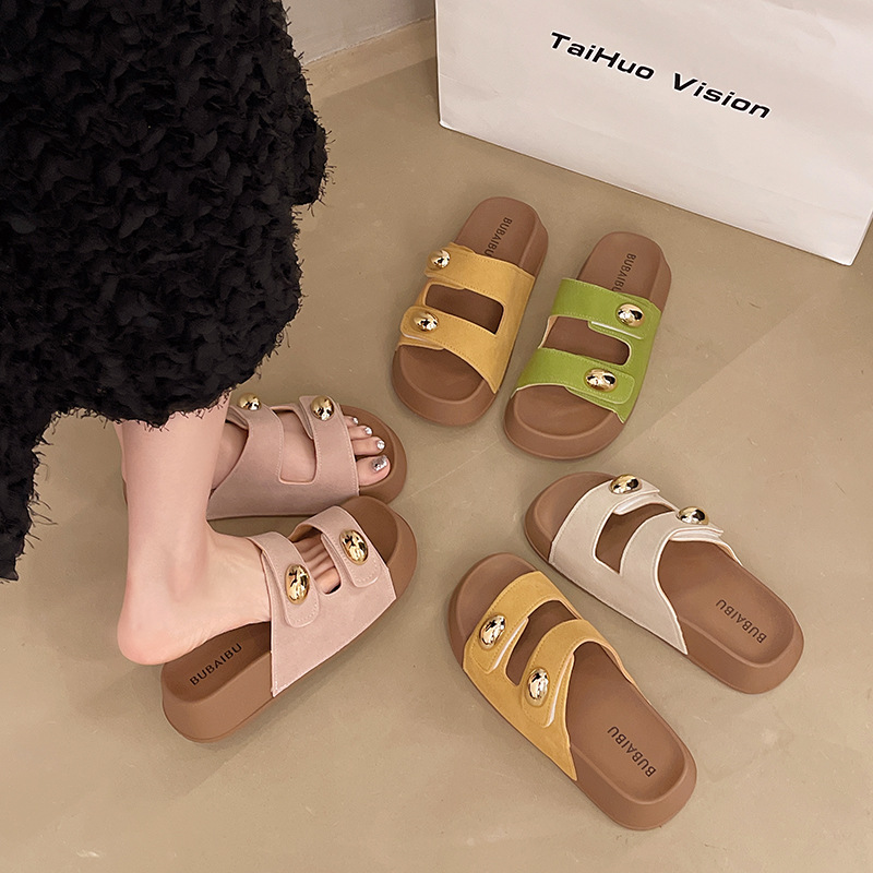 2025 새로운 여름 더블 스트랩 Boken 신발 간단한 골드 콩 장식 샌들 해변 비치 슬리퍼 여성을위한 도매스토어 가기