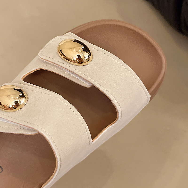 2025 새로운 여름 더블 스트랩 Boken 신발 간단한 골드 콩 장식 샌들 해변 비치 슬리퍼 여성을위한 도매