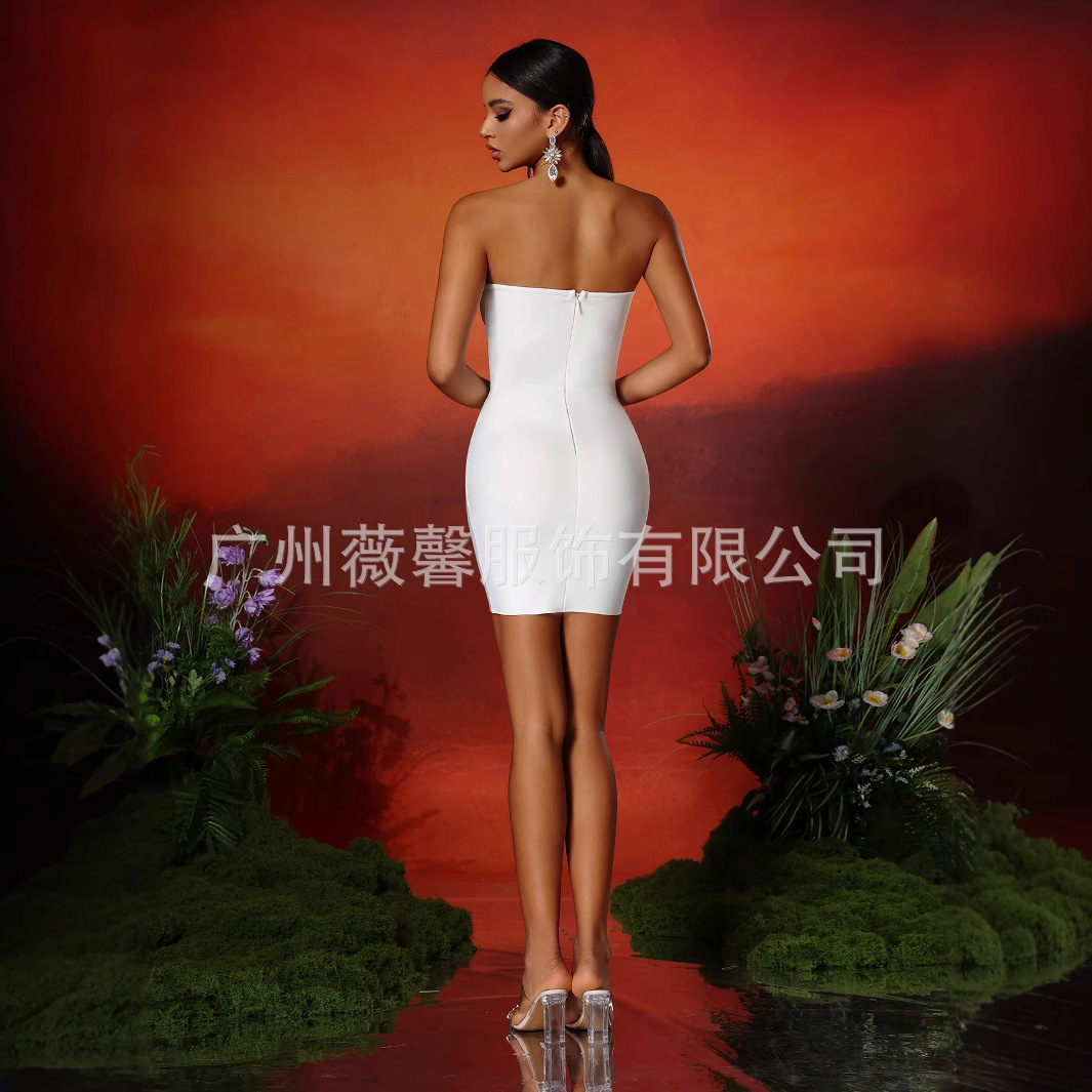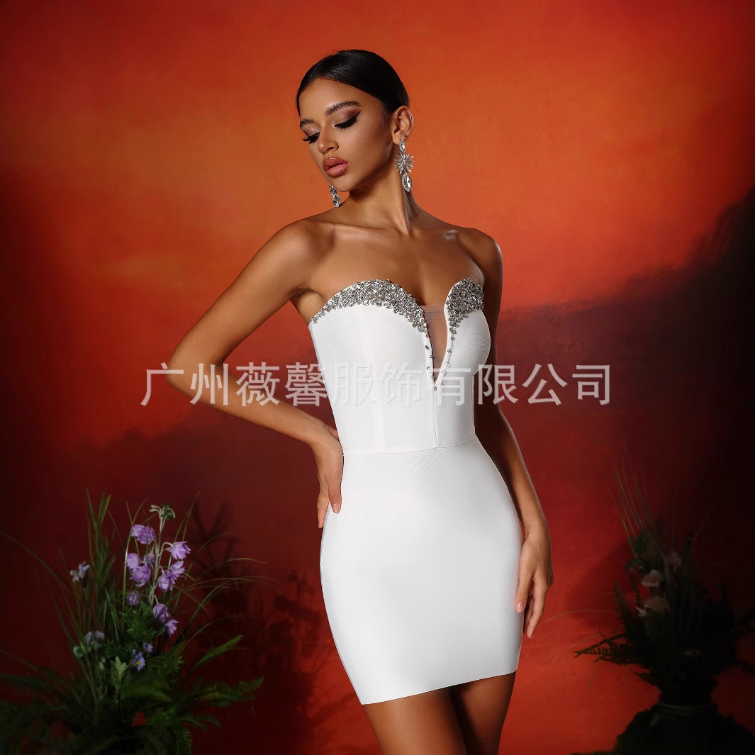 2025 새로운 유럽과 미국의 우아한 흰색 거즈 붕대 드레스 드레스 손으로 만든 다이아몬드 섹시한 패션 튜브 탑 짧은