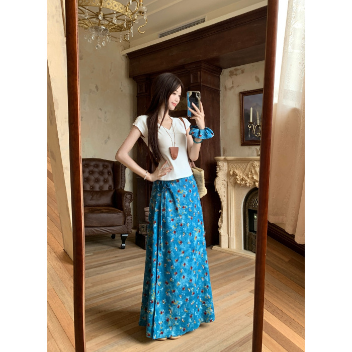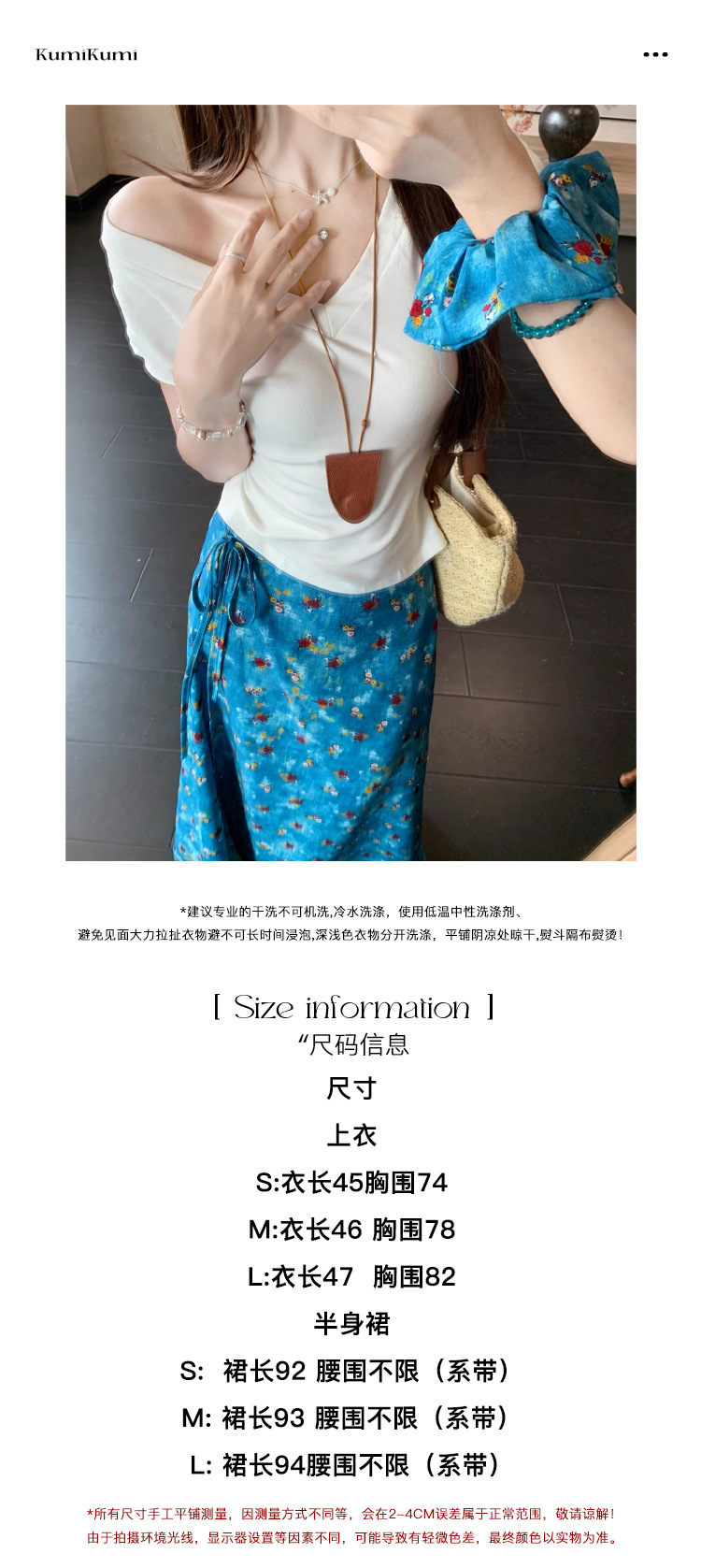패션 정장 흰색 v 넥 반팔 티셔츠 여성 여름 높은 허리 슬림 꽃 스커트 투피스 세트 유럽과 미국 중동스토어 가기