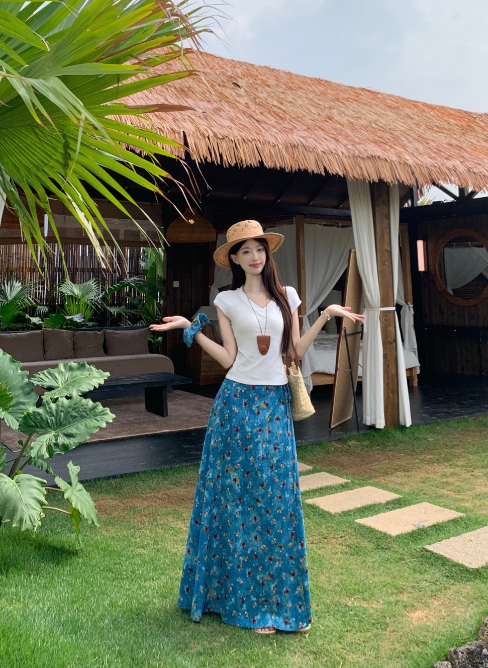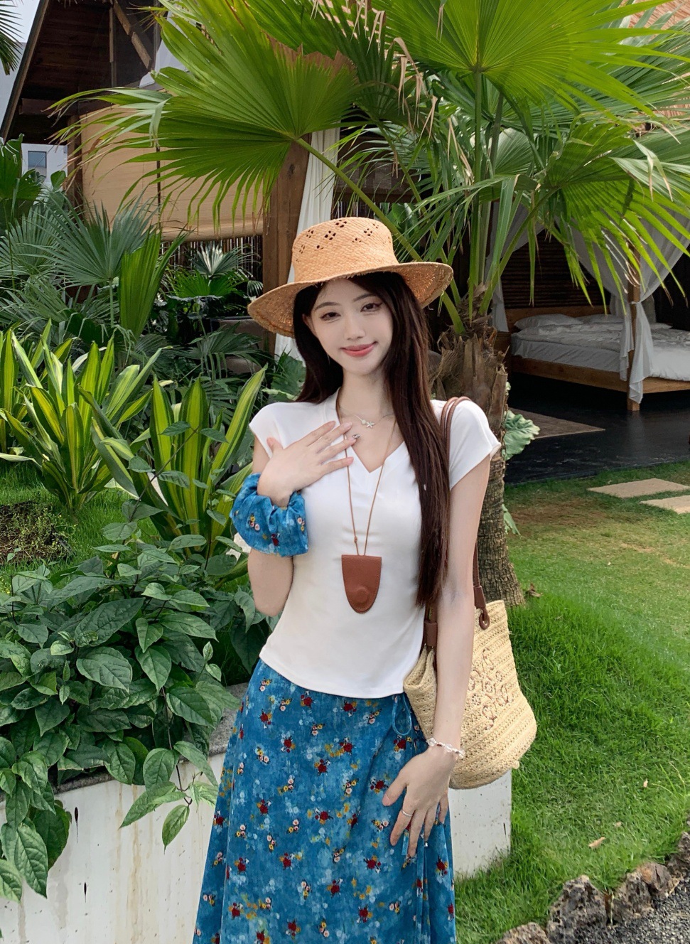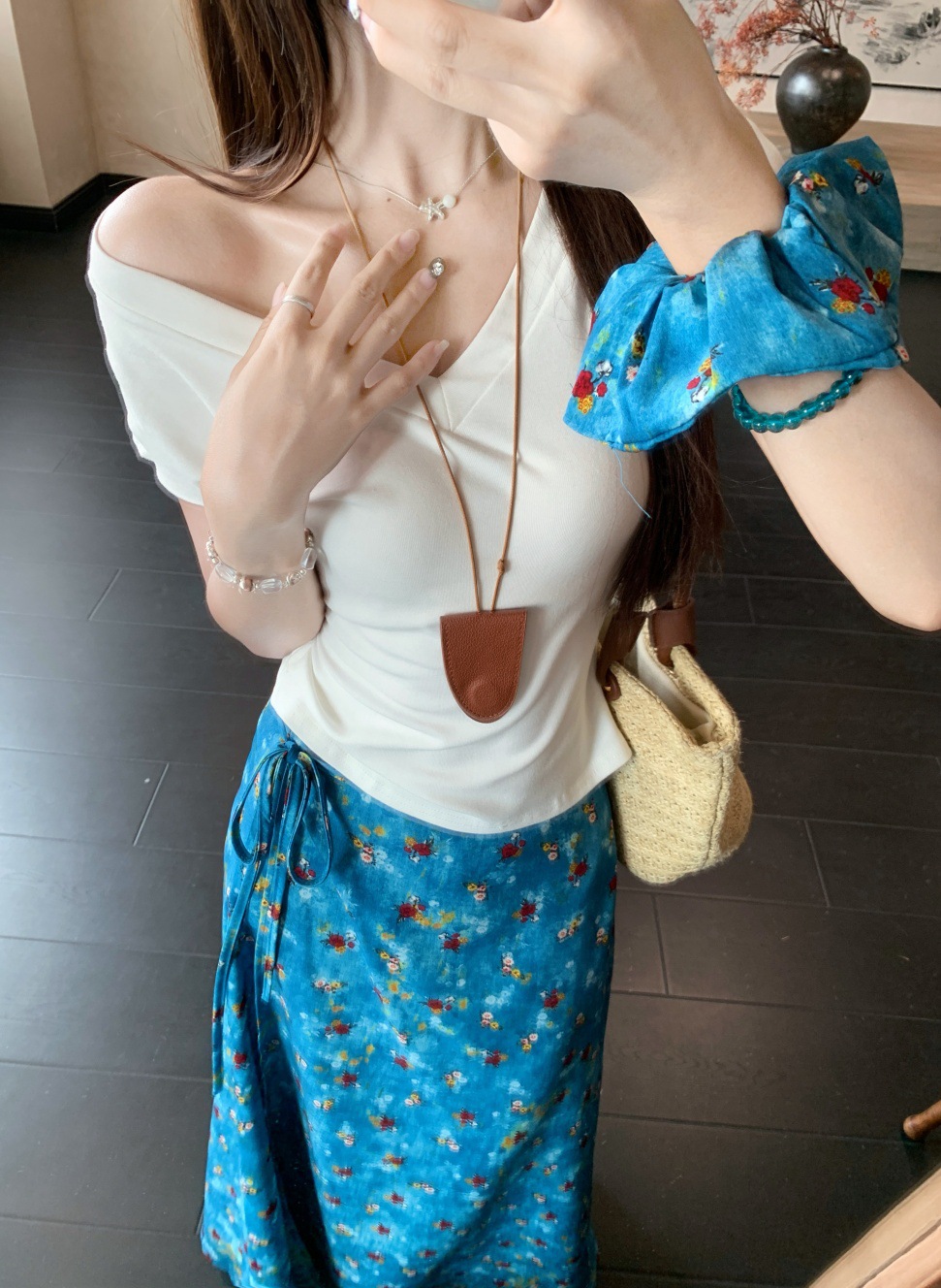 패션 정장 흰색 v 넥 반팔 티셔츠 여성 여름 높은 허리 슬림 꽃 스커트 투피스 세트 유럽과 미국 중동