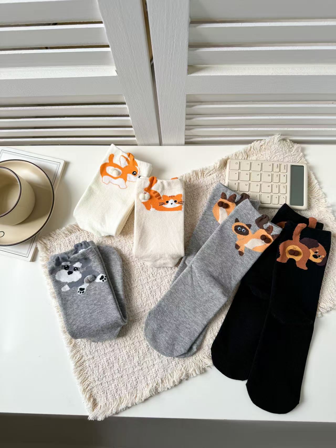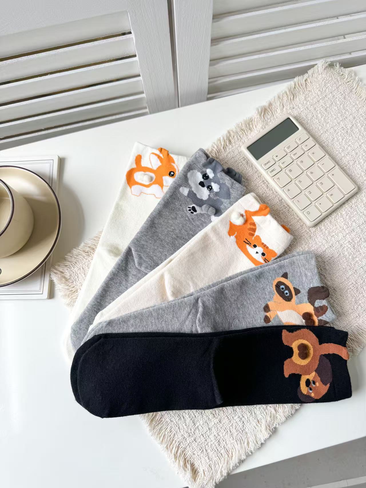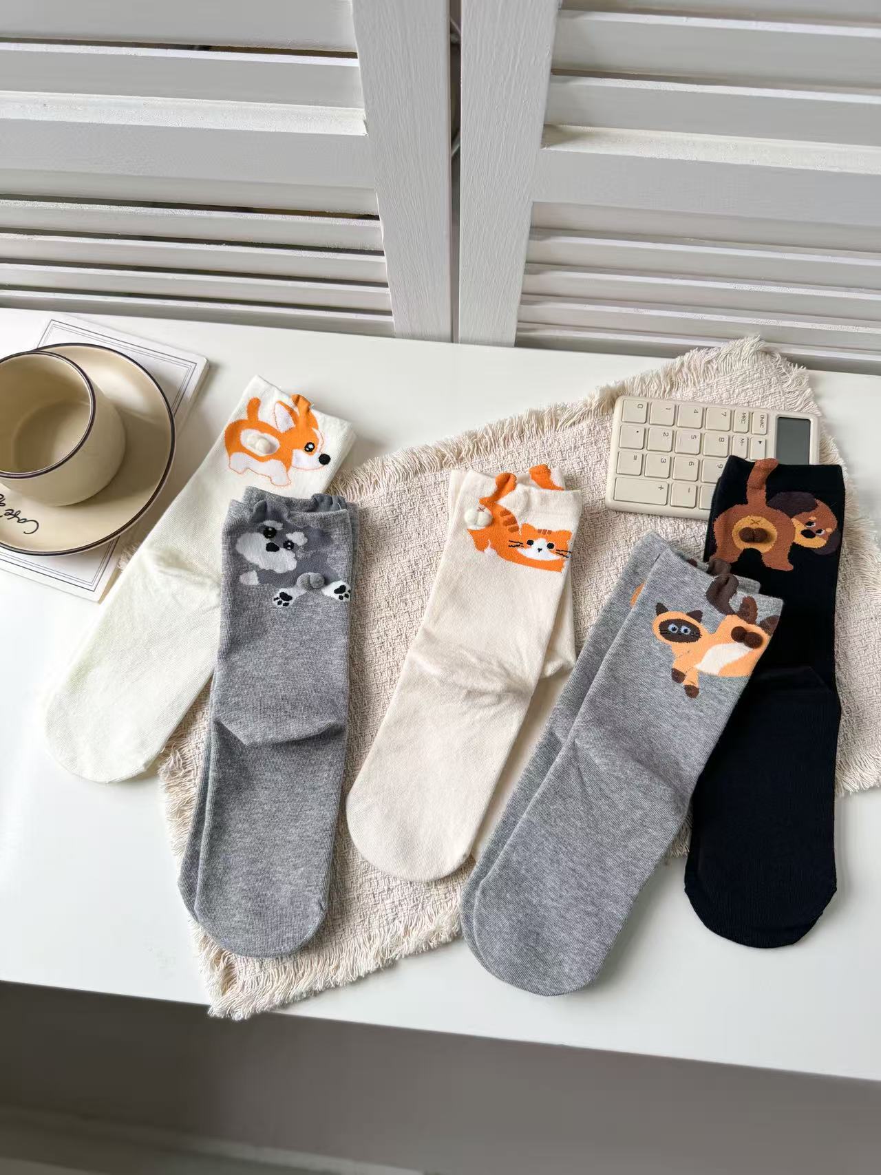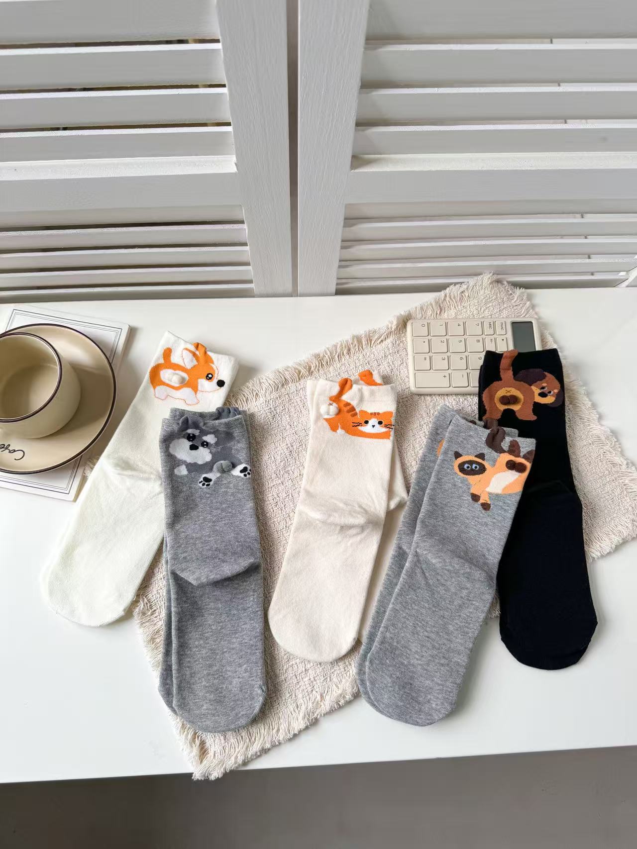 [재고 있음] 여름 여성용 흰색 만화 고양이 징글 달걀 양말 ins 코튼 귀여운 웃긴 중간 튜브 양말